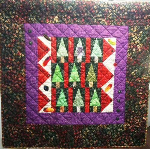 Enchanted Forest is an art quilt that measures 35 x 35 inches. Tree blocks formed the center of the quilt with flying geese blocks bordering the forest. There is a lot more sparkle in this quilt than can be seen in the picture. Both the cream and red fabrics have gold specks and the binding is metallic plaid.