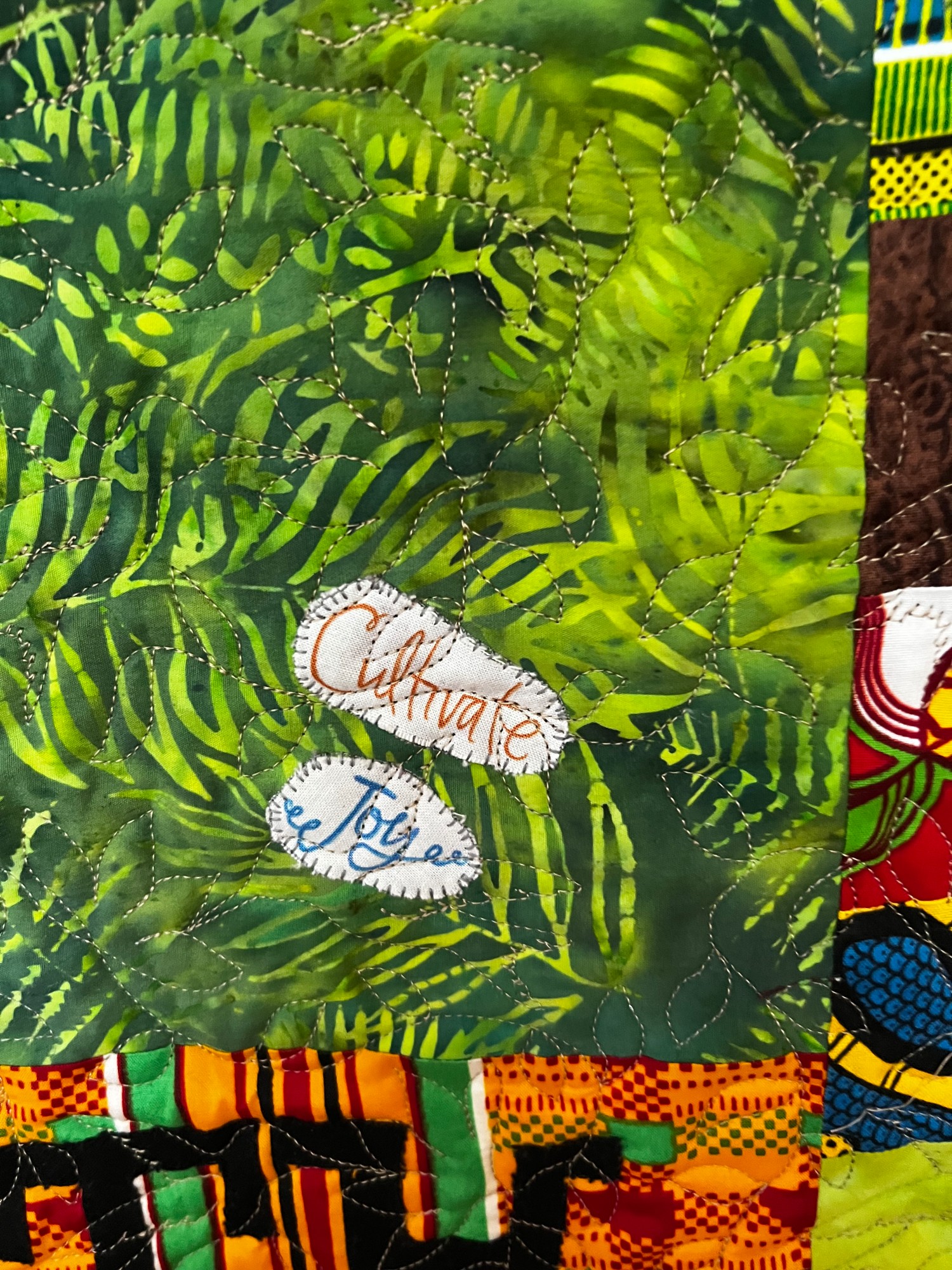 There are many African fabrics in the quilt and the back is an African print. There is a hanging sleeve on the back for easy display and a label that documents the quilt. I signed it on the front.