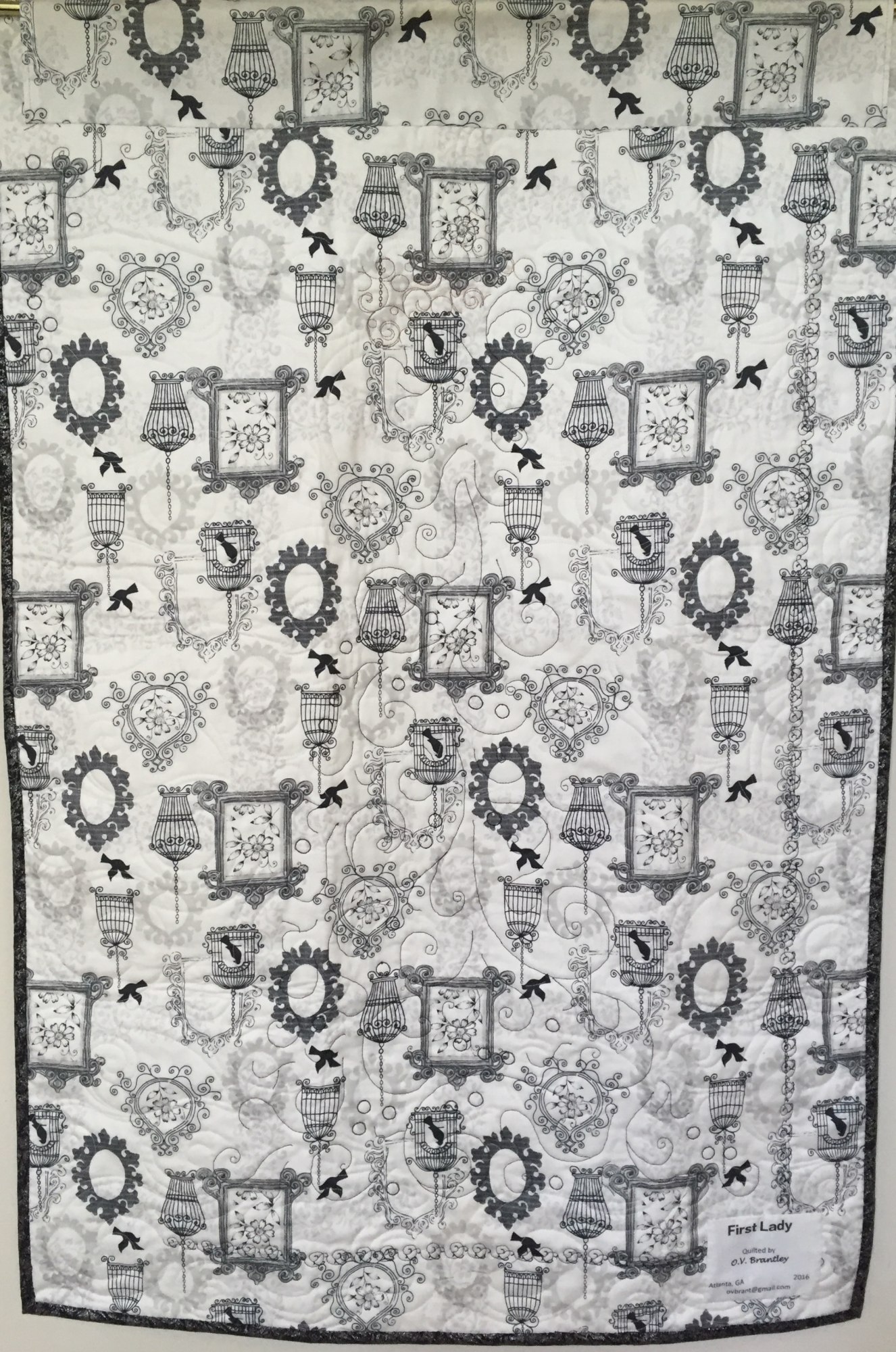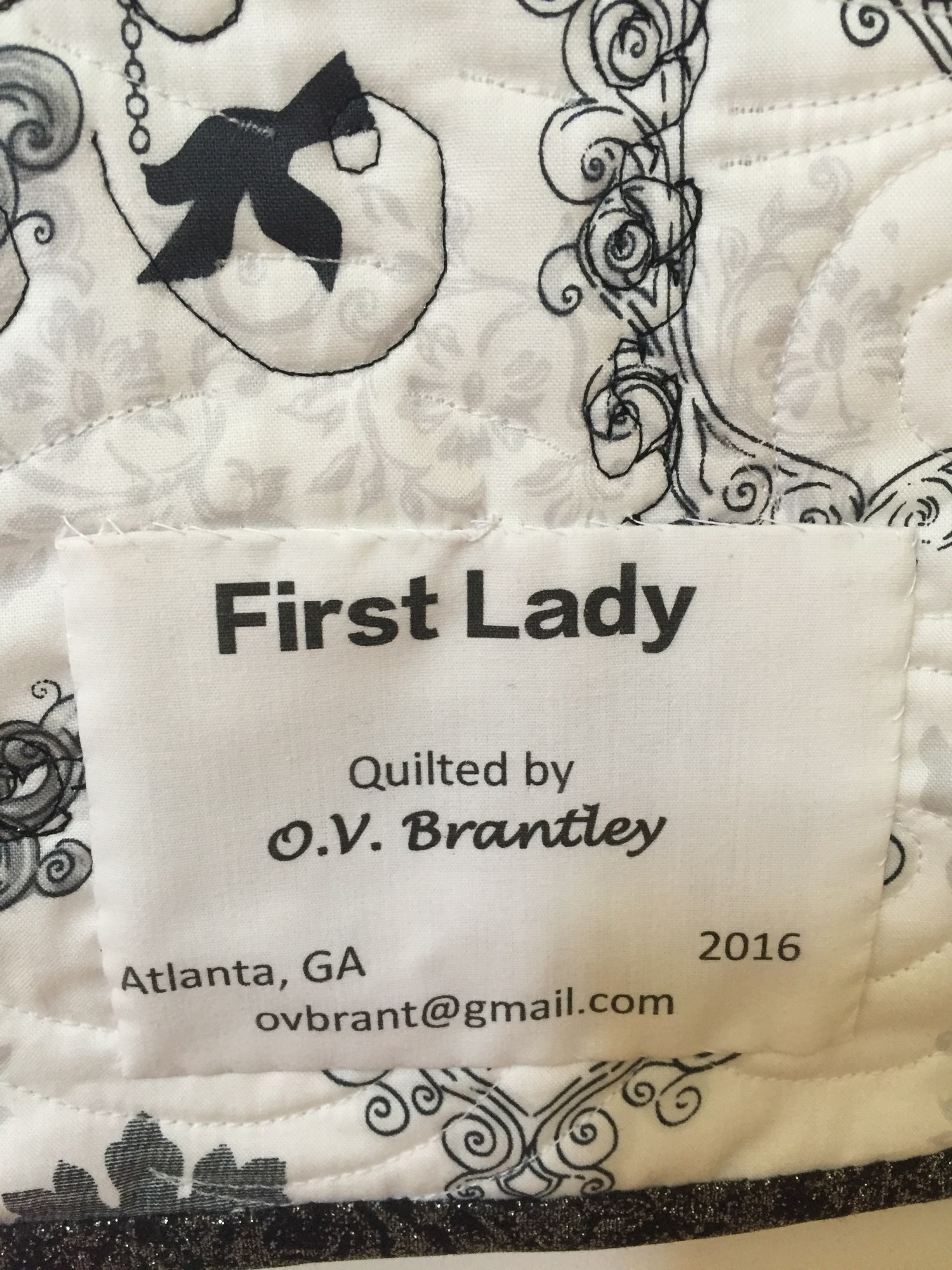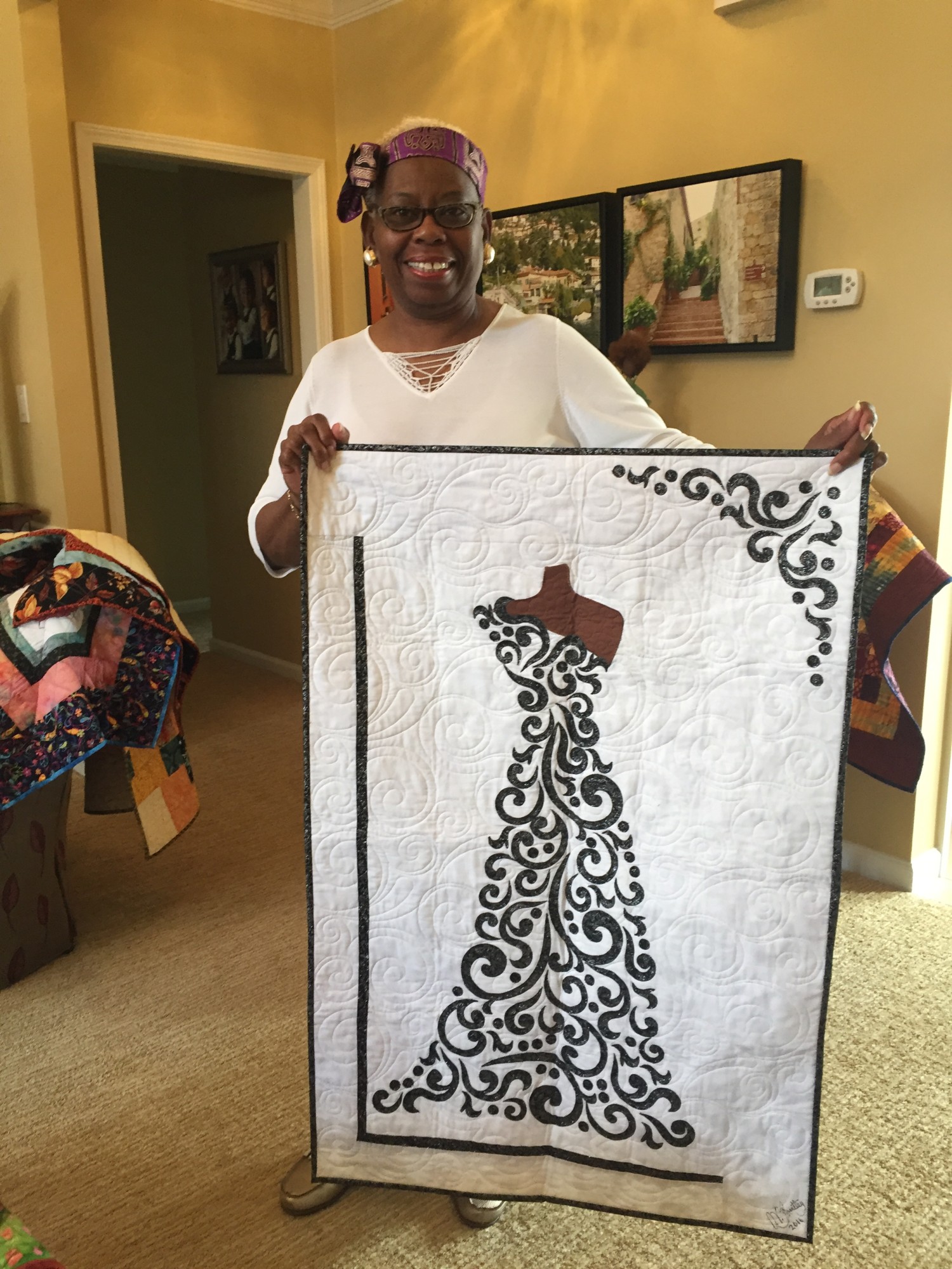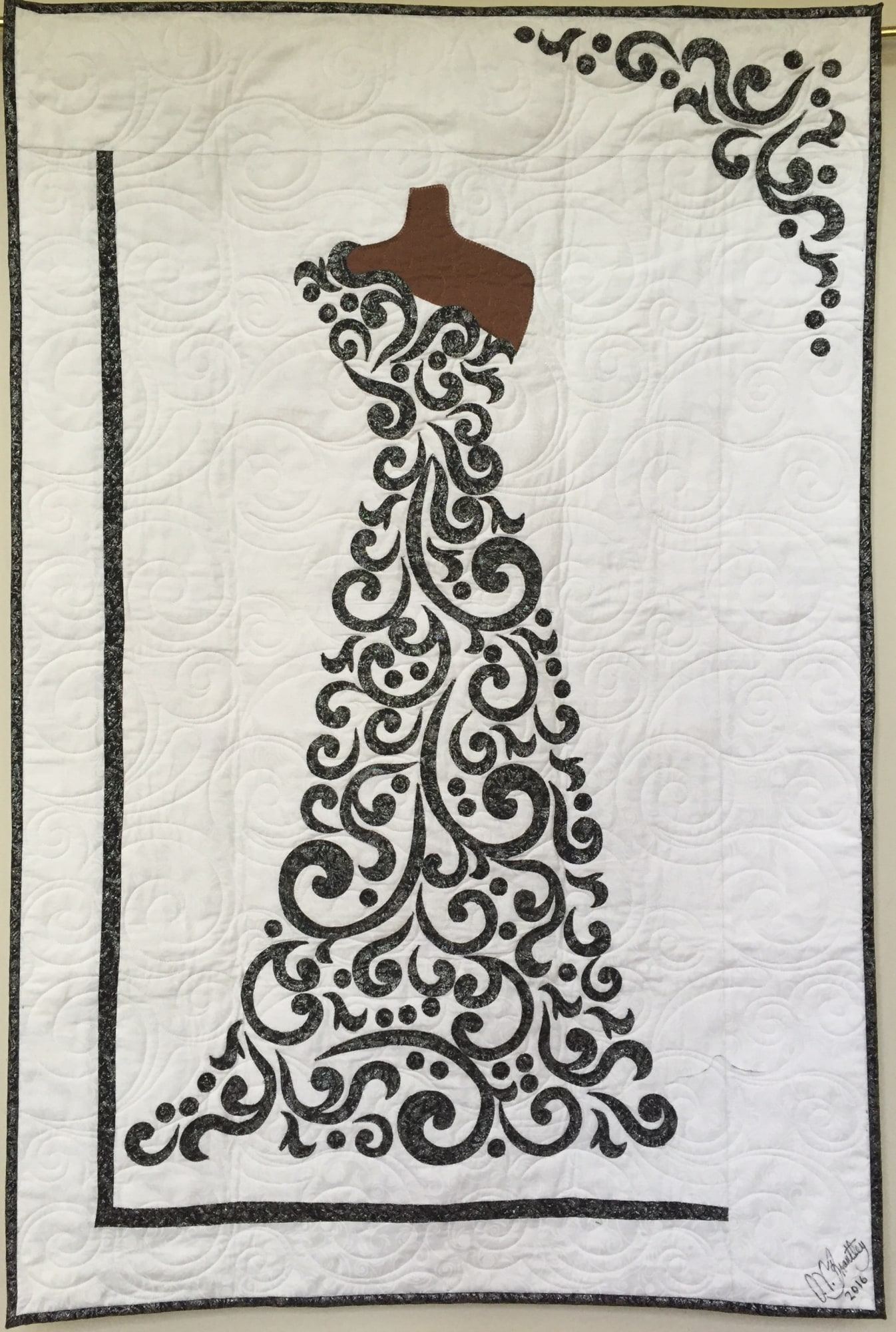 A formal off the shoulder dress in gray sparkling fabric. Machine applique and custom machine quilted. The dress reminded me of First Lady Michelle Obama's beautiful ball gowns.