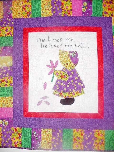Sunbonnet Sue appliquéd in center block with the words "he loves me. He loves me not." hand embroidered.