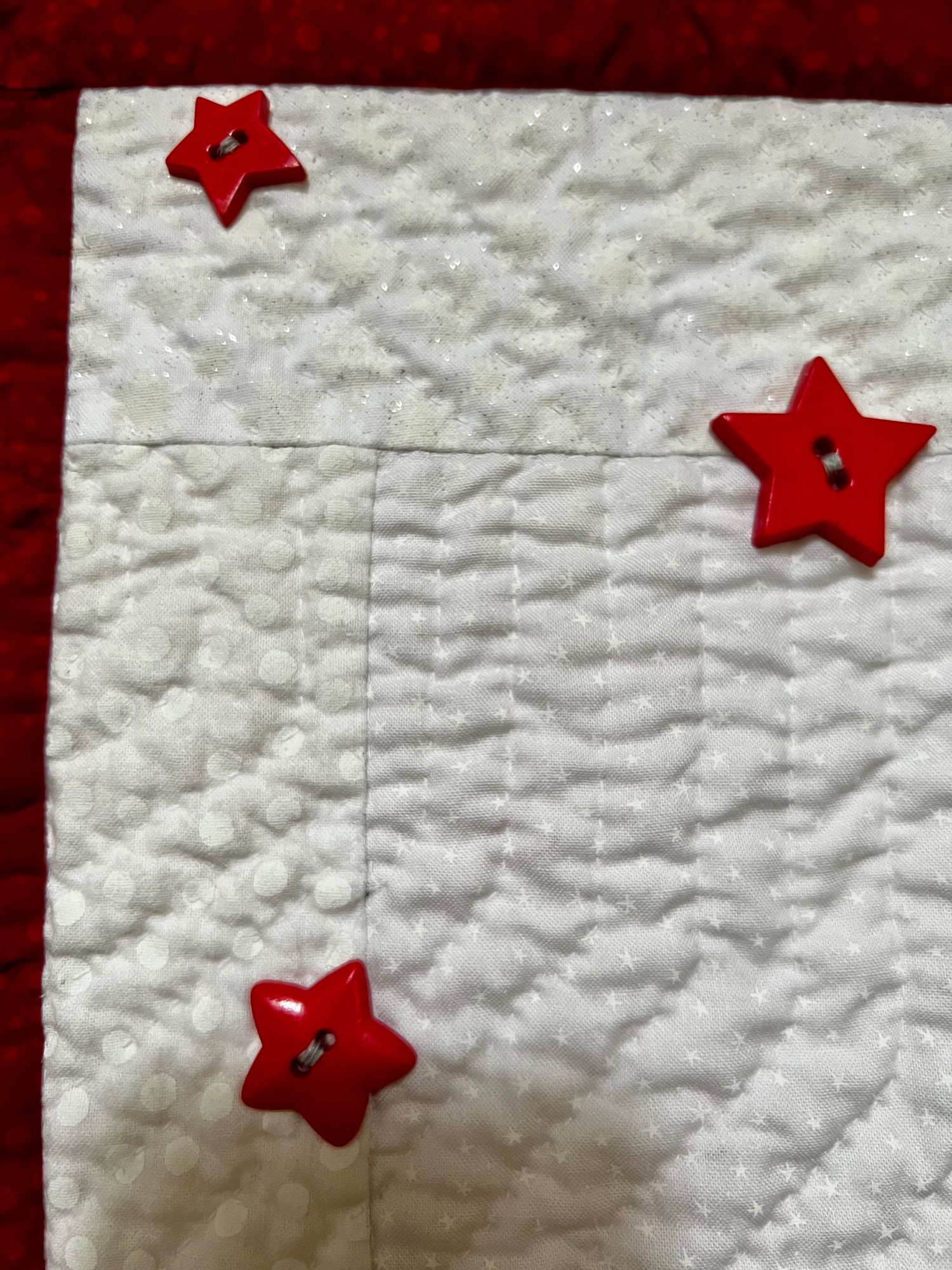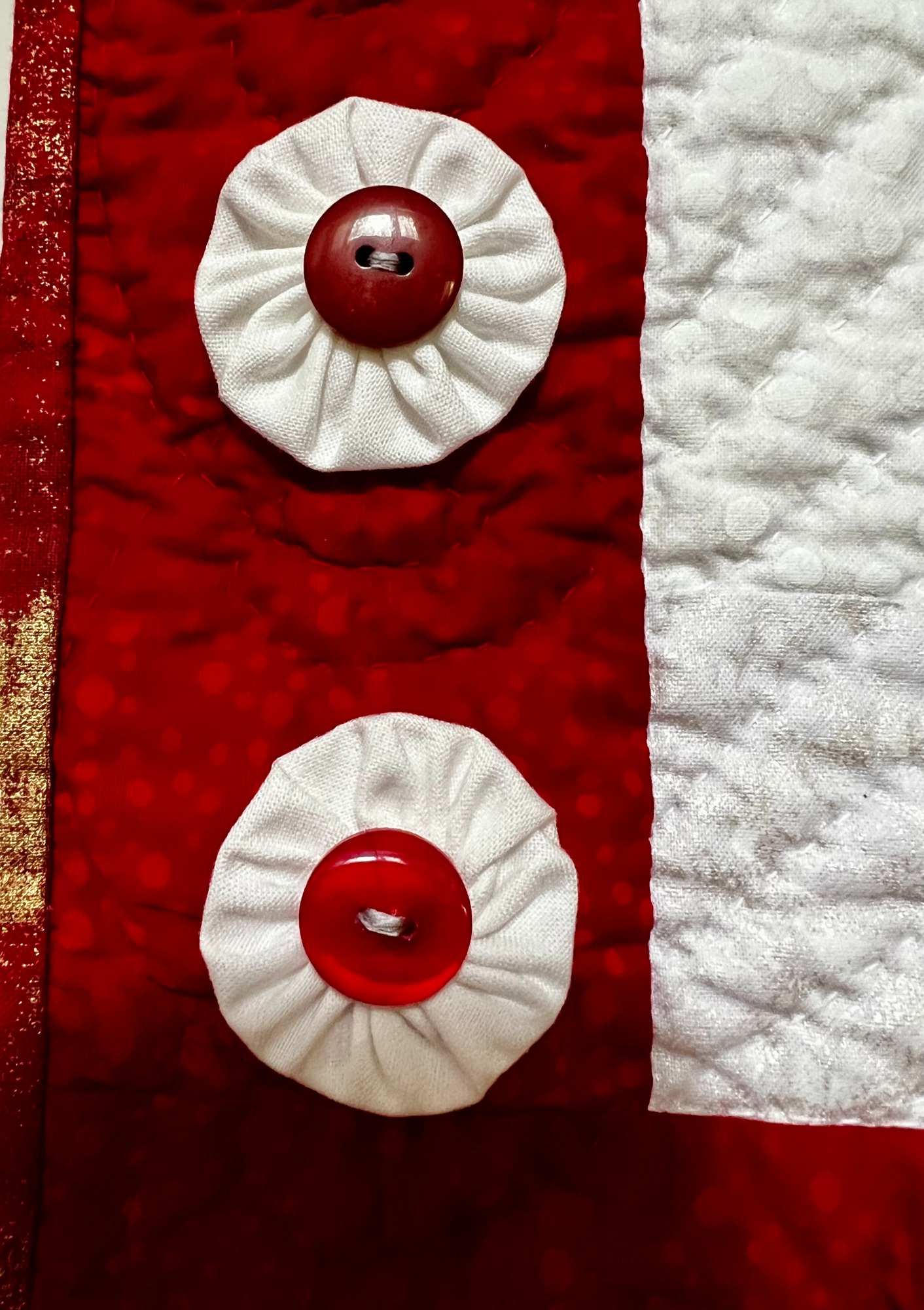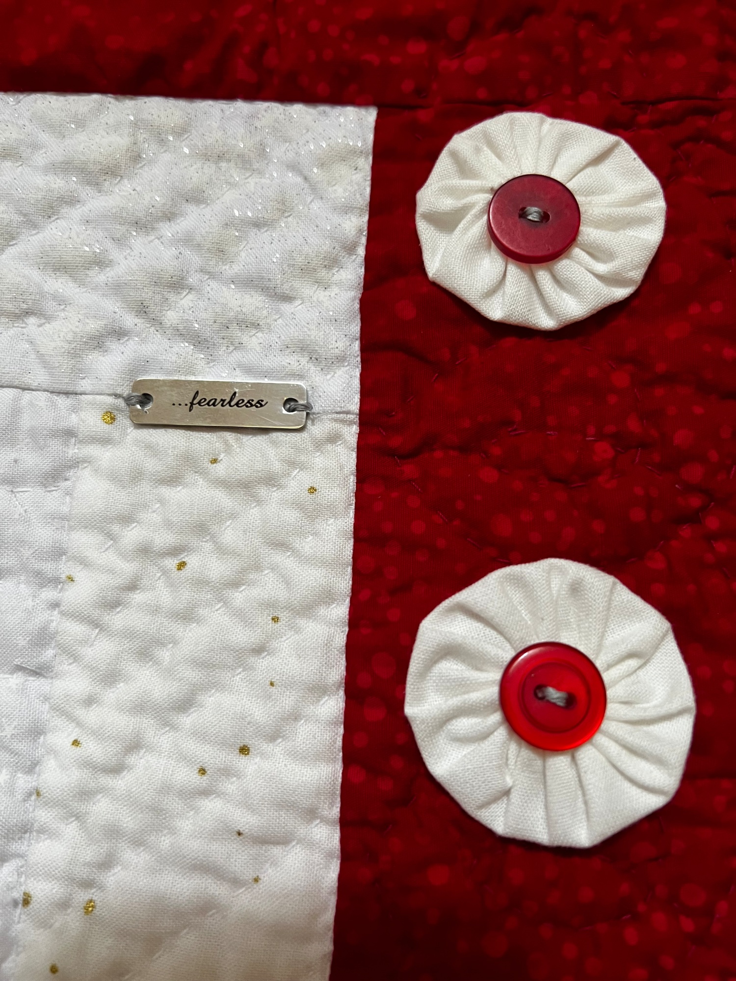 The simple design is given depth and dimension by hand quilting, yo-You’s and lots of buttons. The word “courage ”is appliquéd in the center of the quilt.