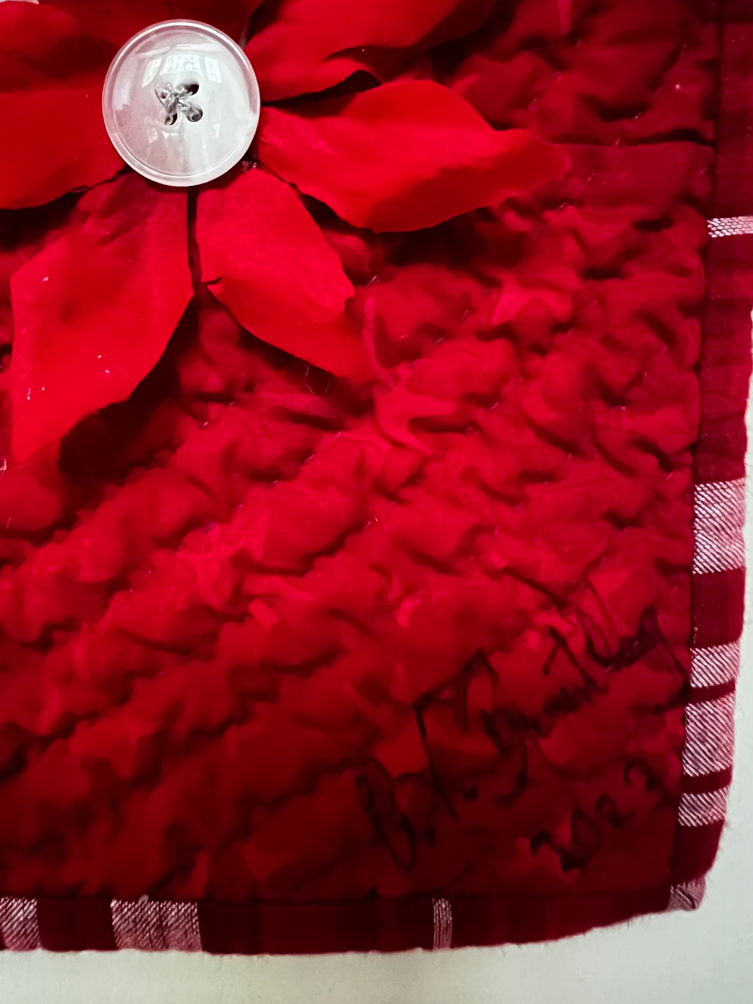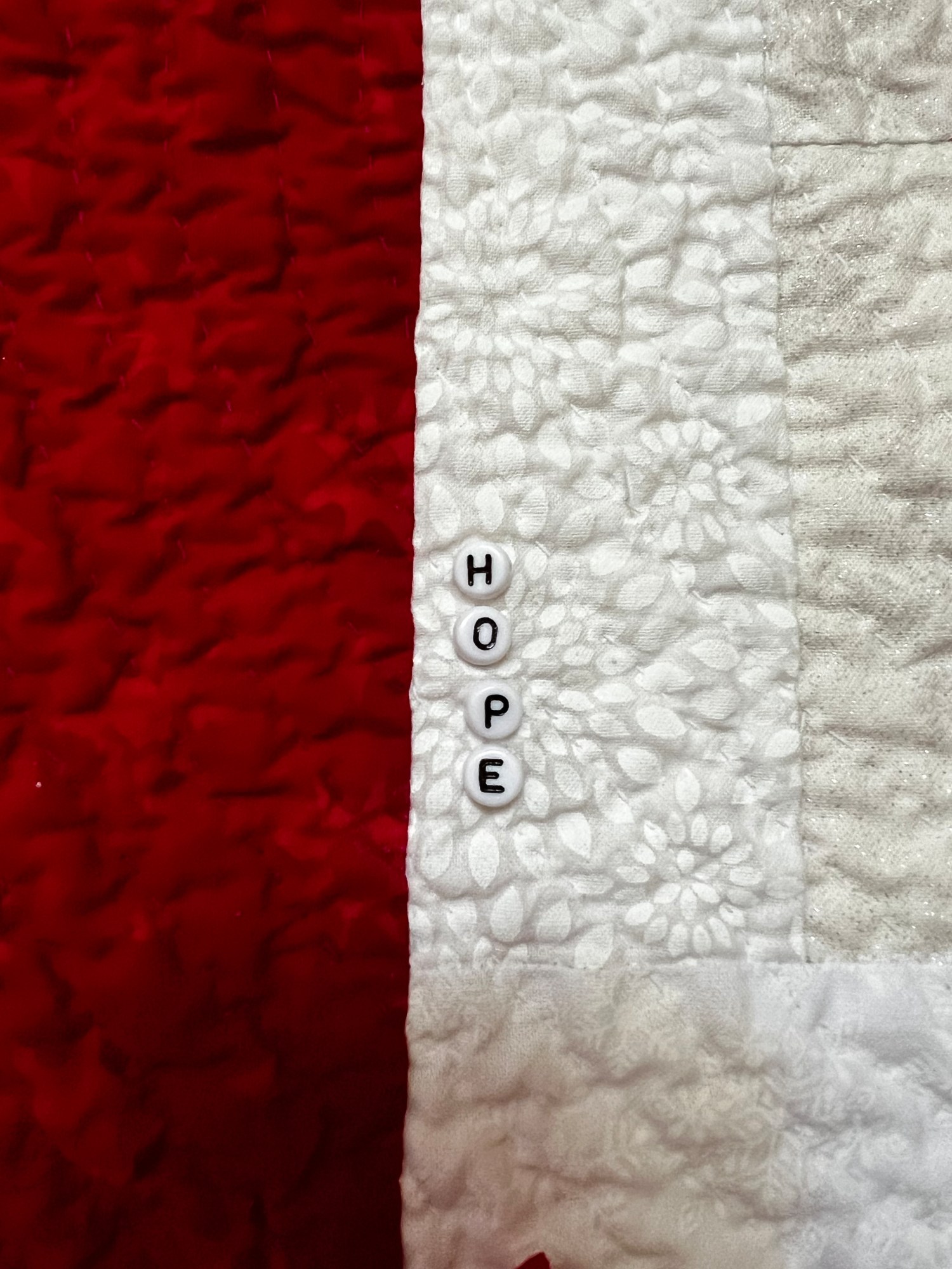 The simple design is given depth and dimension by hand quilting, red silk flowers and lots of buttons. The word “hope”is appliquéd in the center of the quilt.