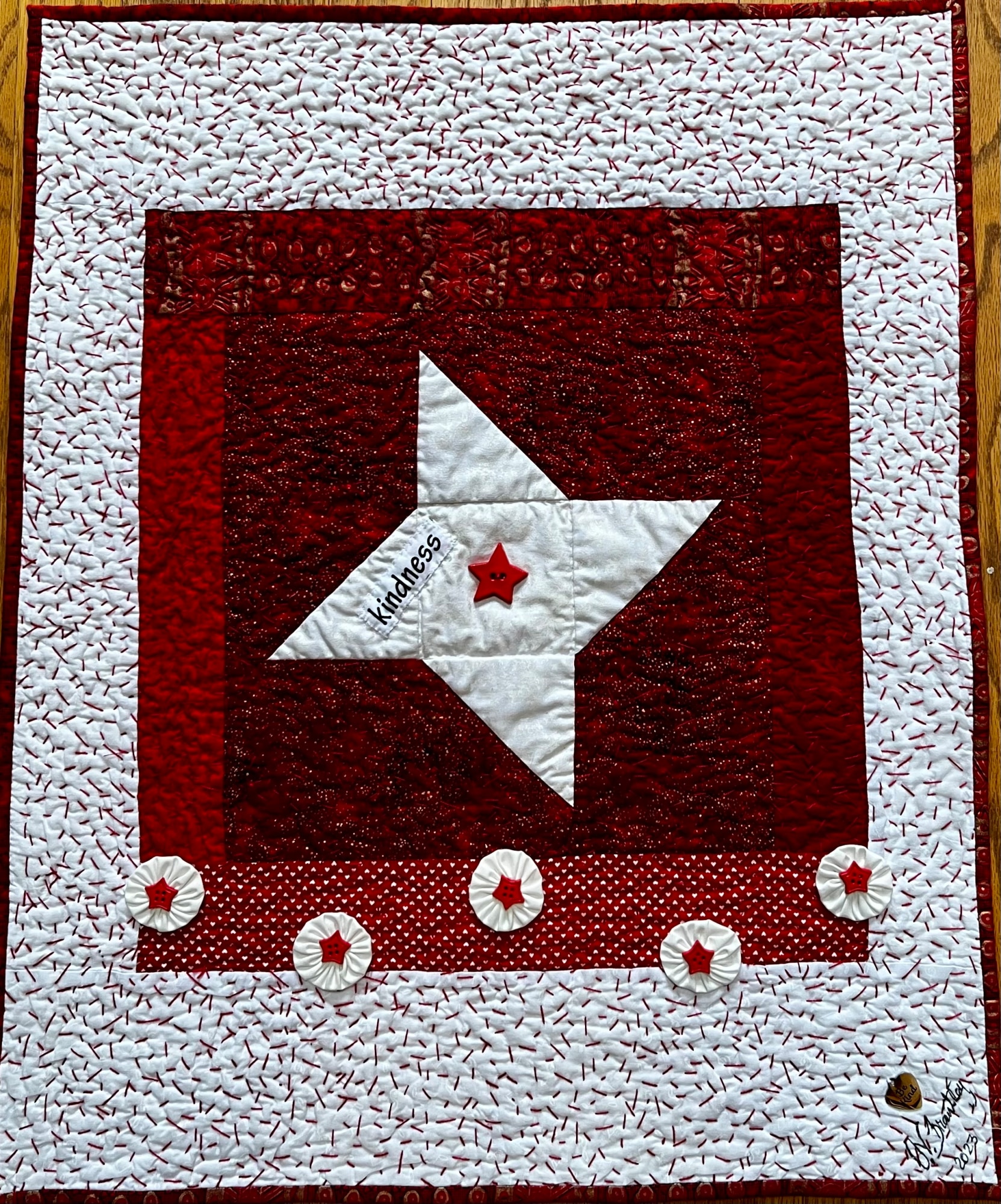 The simple design is given depth and dimension by chicken scratch hand quilting yo-go’s, buttons and a charm. The word kind is appliquéd on the center star of the quilt.