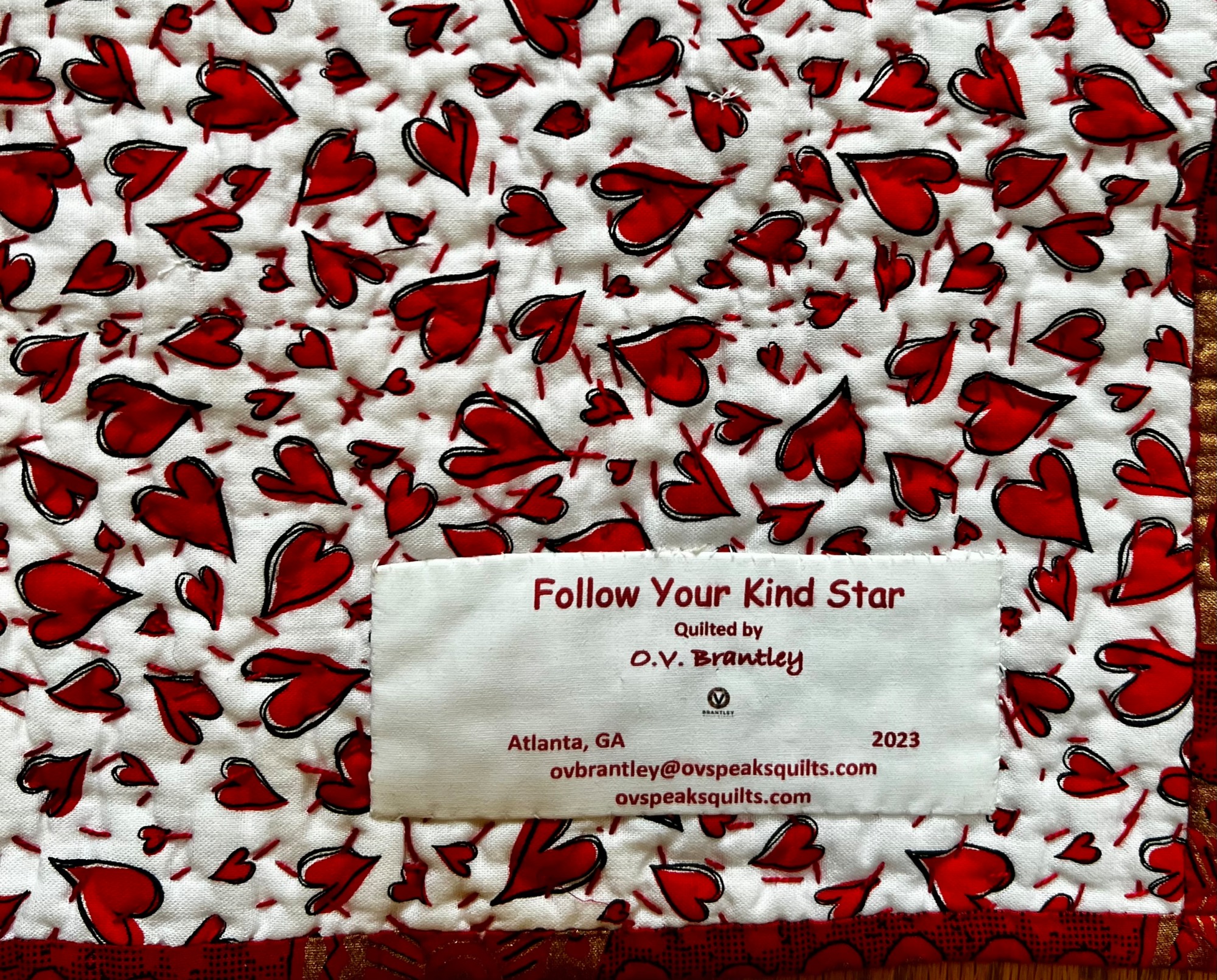 “Follow Your Kind Star” follows in the tradition of the friendship star quilts that danced in the ceiling of my solo exhibit “Long Time Coming: A Retrospective of O.V. Brantley’s Red and White Quilts.” The focus of the quilt is a single red friendship star block on a white background and bordered with red fabric.
