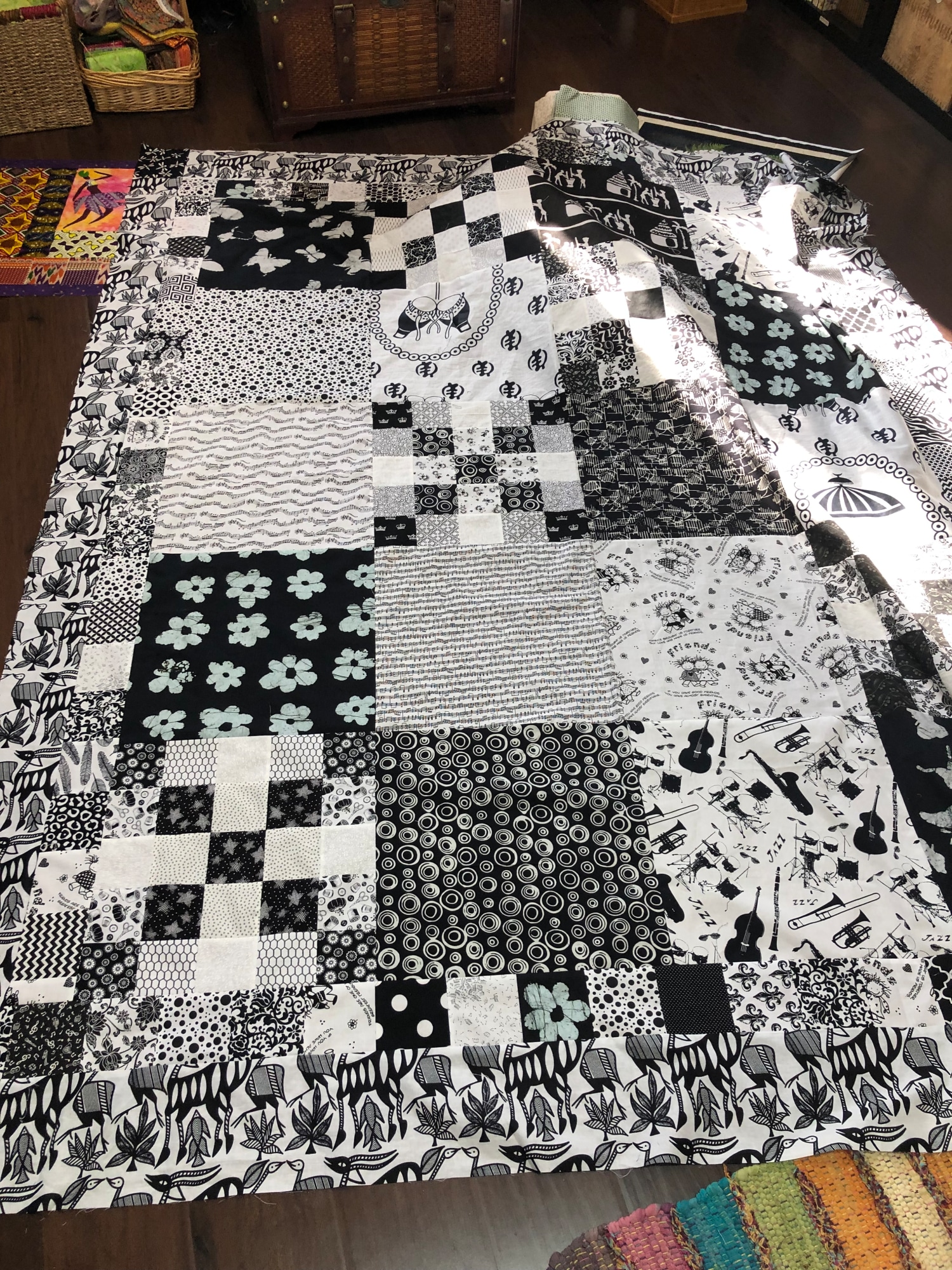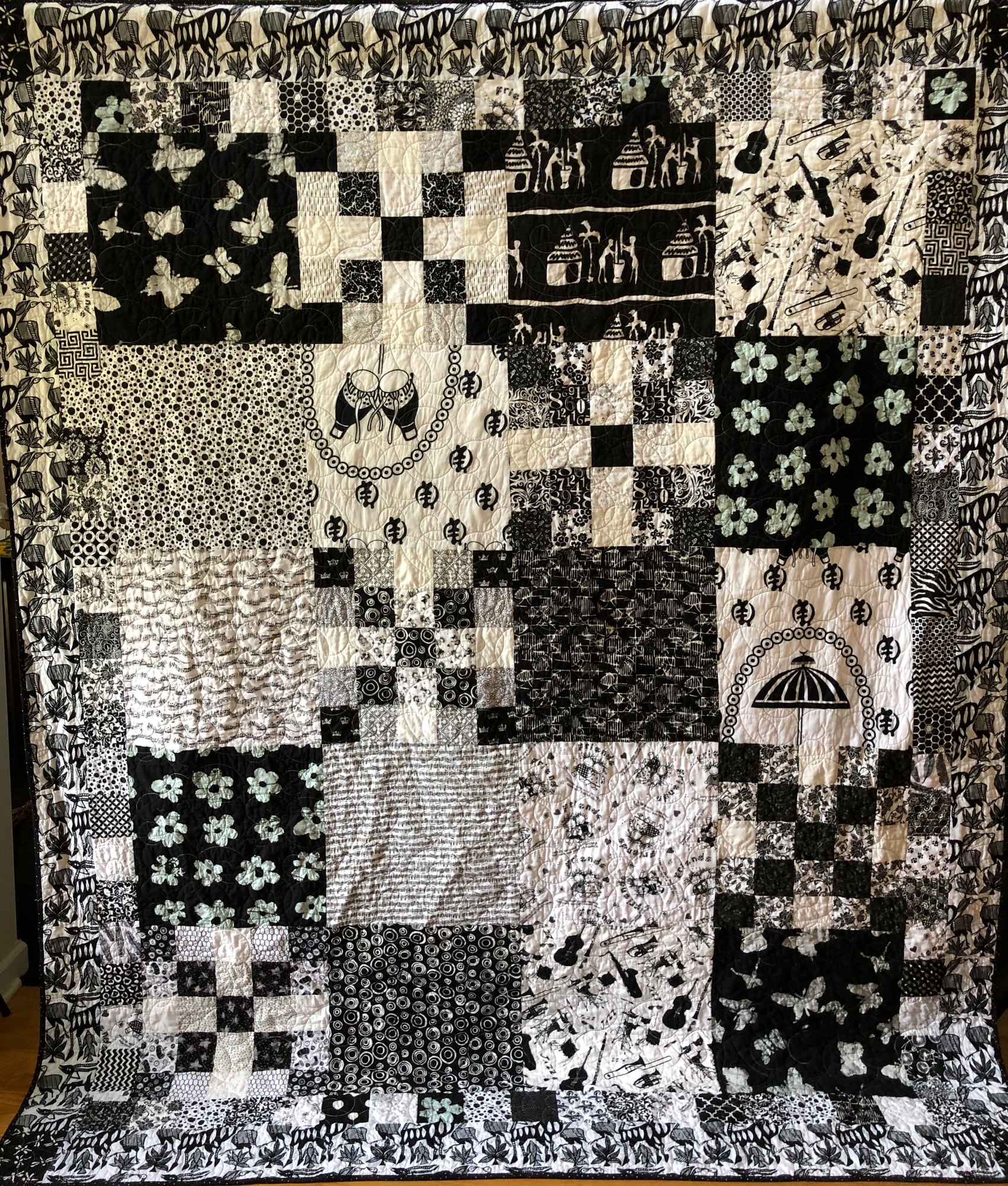 It is a large quilt measuring 70x88 inches composed of only black and white fabrics. It is framed by a pieced border and an African border. There is African fabric, musical fabric, friendship fabric and fabric depicting things that make life beautiful. There is much to discover in this quilt.