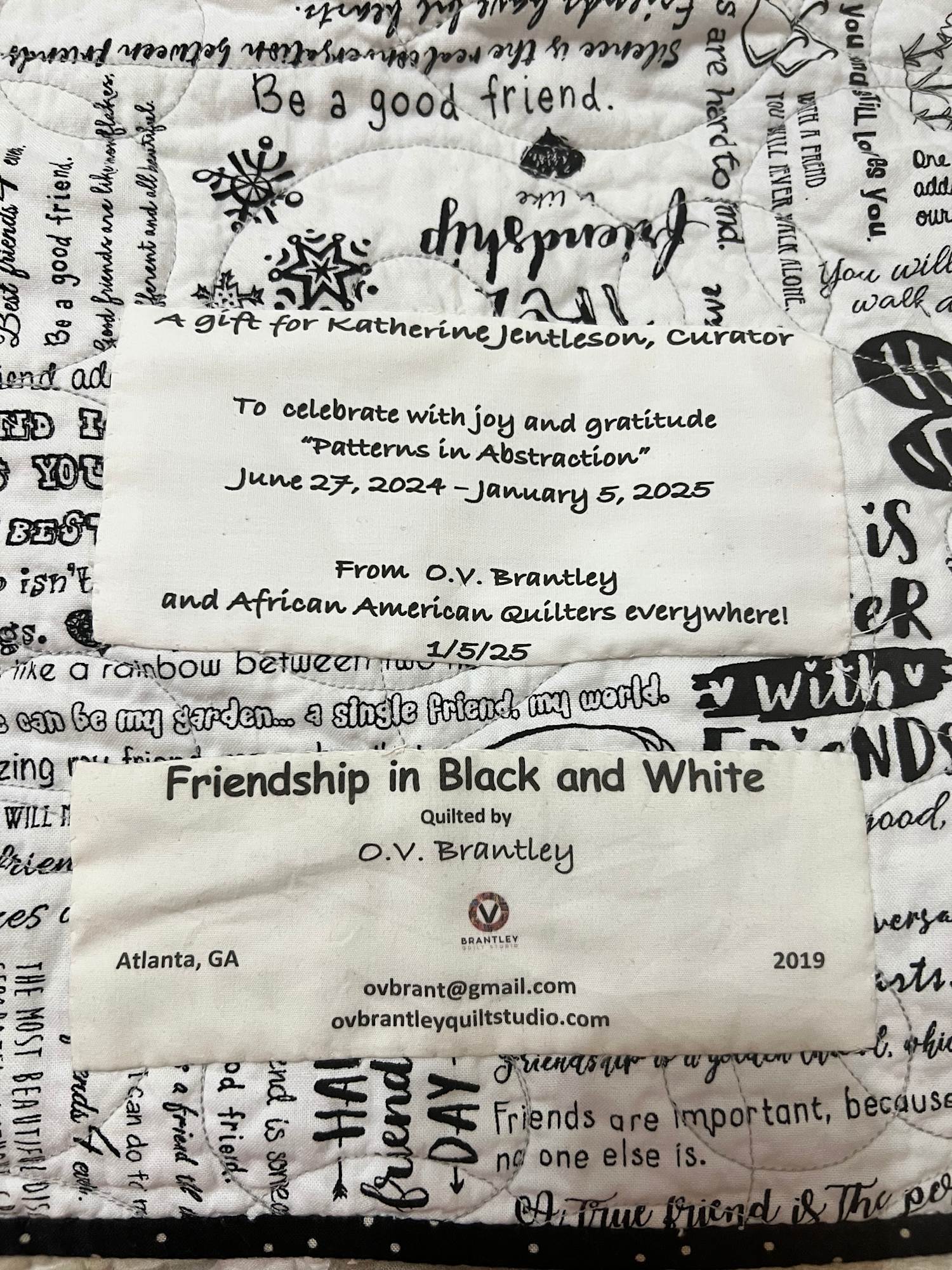 “Friendship in Black and White” is pieced and quilted by machine. Friendship fabric on the back of the quilt carries out the theme. A hanging sleeve allows the quilt to easily be hung on the wall, but it is definitely big enough to be a bed quilt.