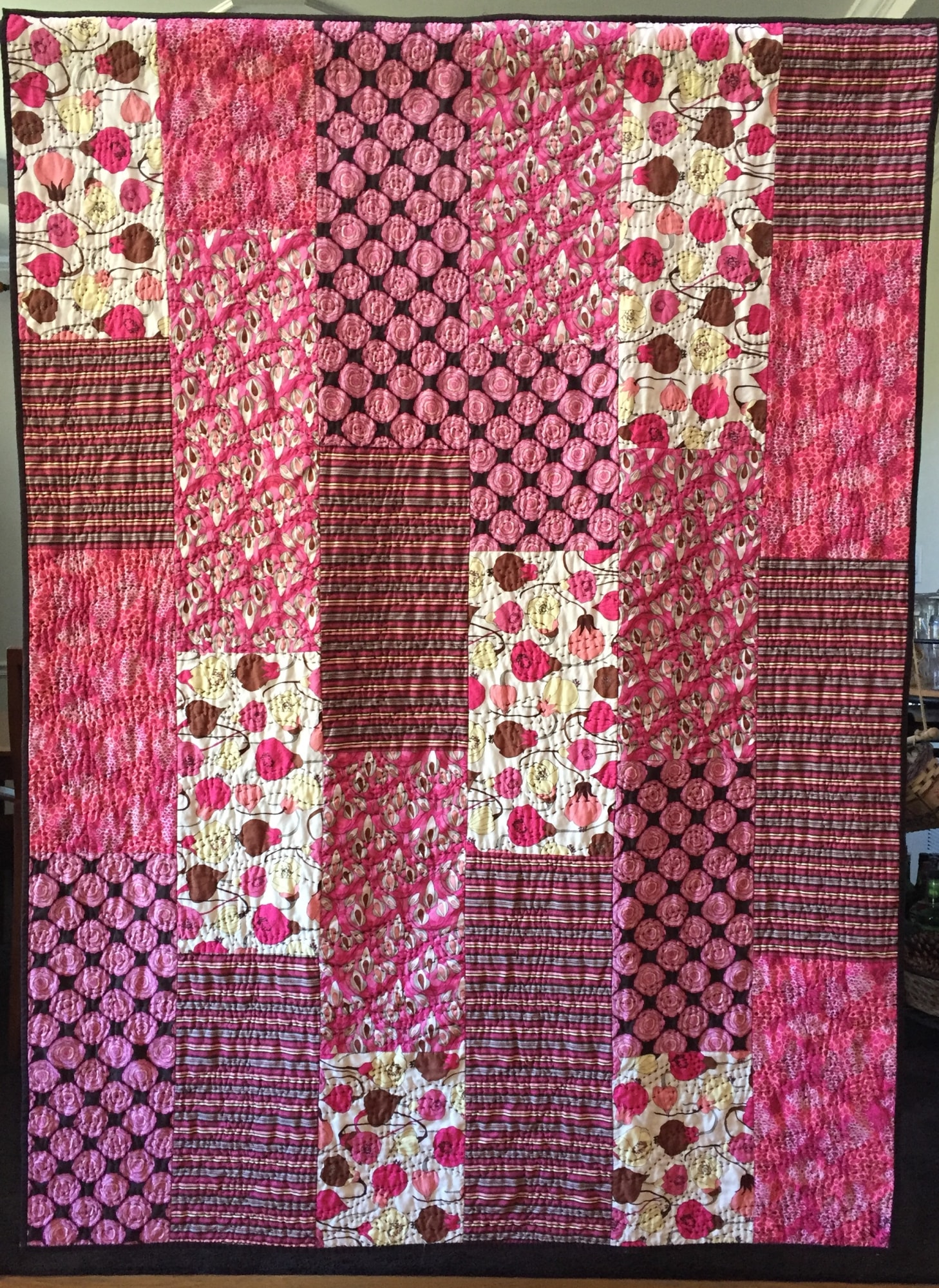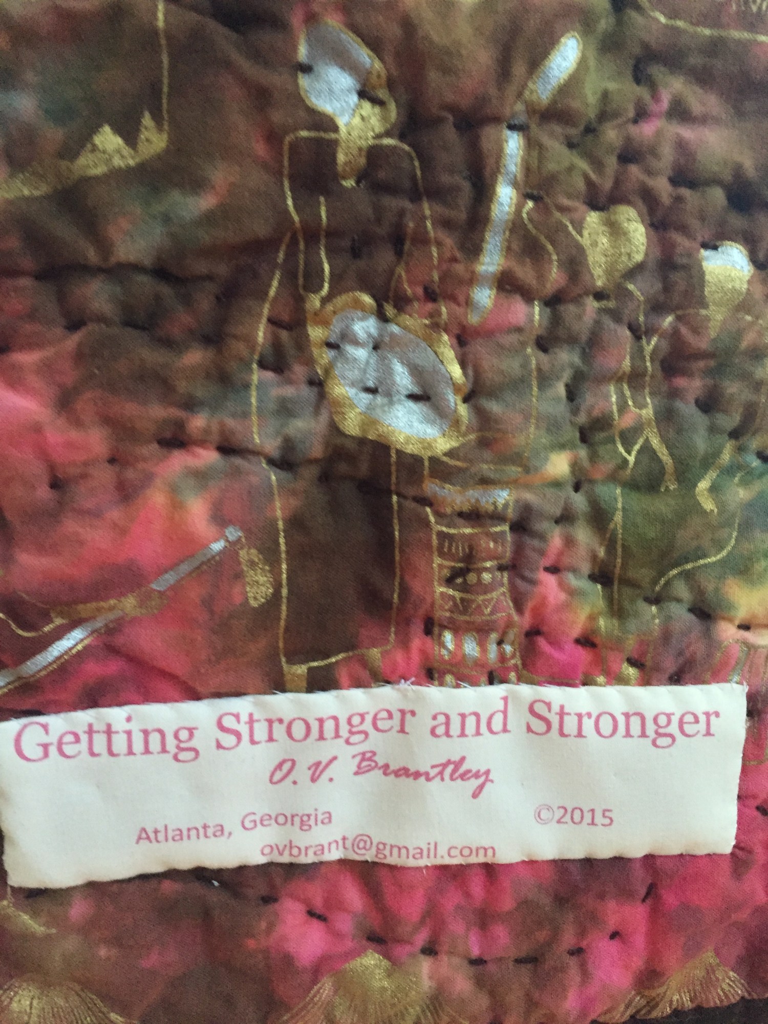 "Getting Stronger and Stronger" is a hand quilted art quilt that captures the struggle of those battling breast cancer. The dominant colors are pink and brown. These colors represent the vulnerability of battling cancer and the strength of never giving up.
