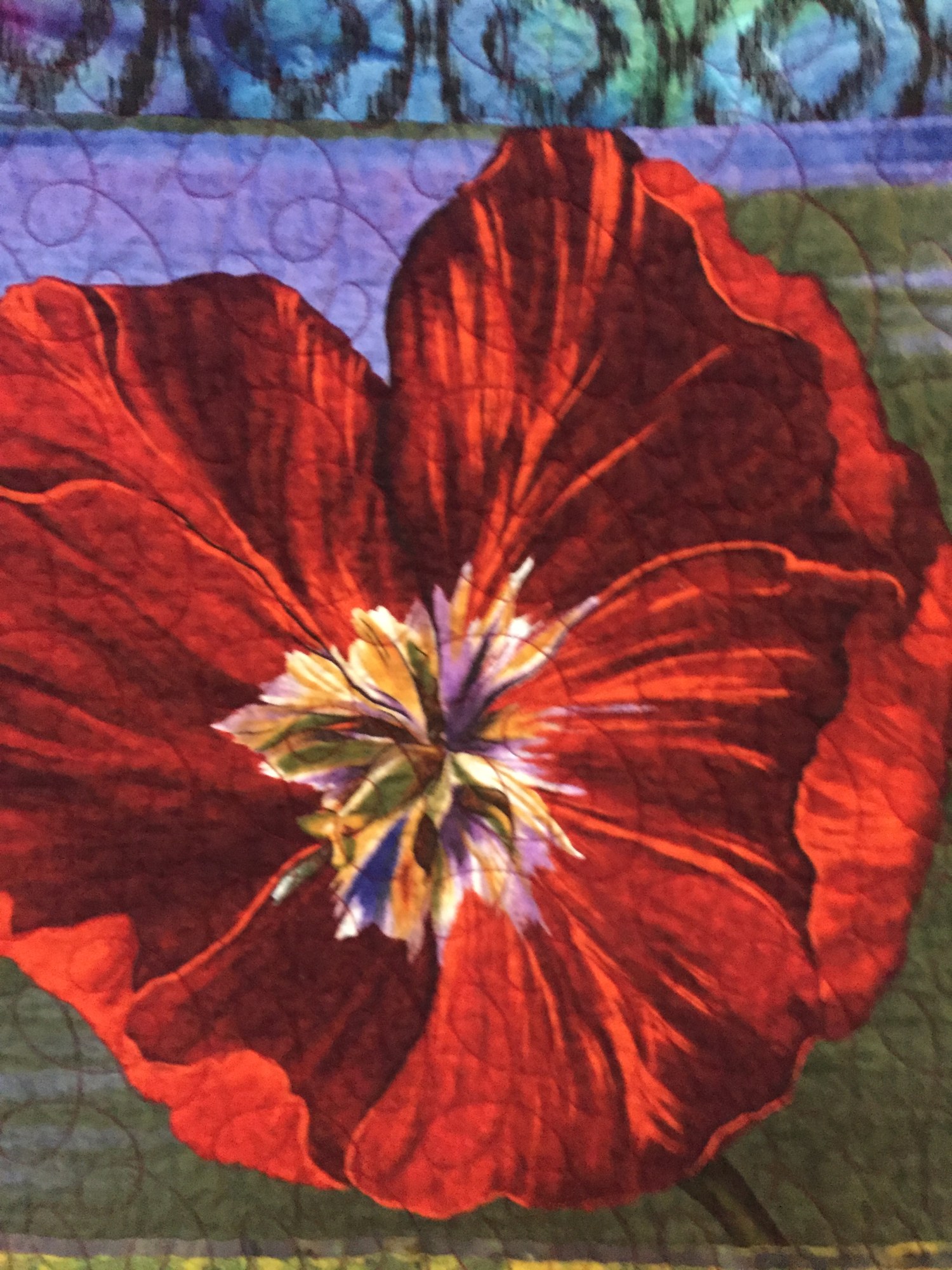 “Give Yourself a Bold Red Flower” measures 43 x49 inches. It is machine pieced and quilted. There is a hanging sleeve on the back so that you can easily hang it on a curtain rod. A label documents the quilt and I signed it on the front. This quilt is one-of-a-kind.