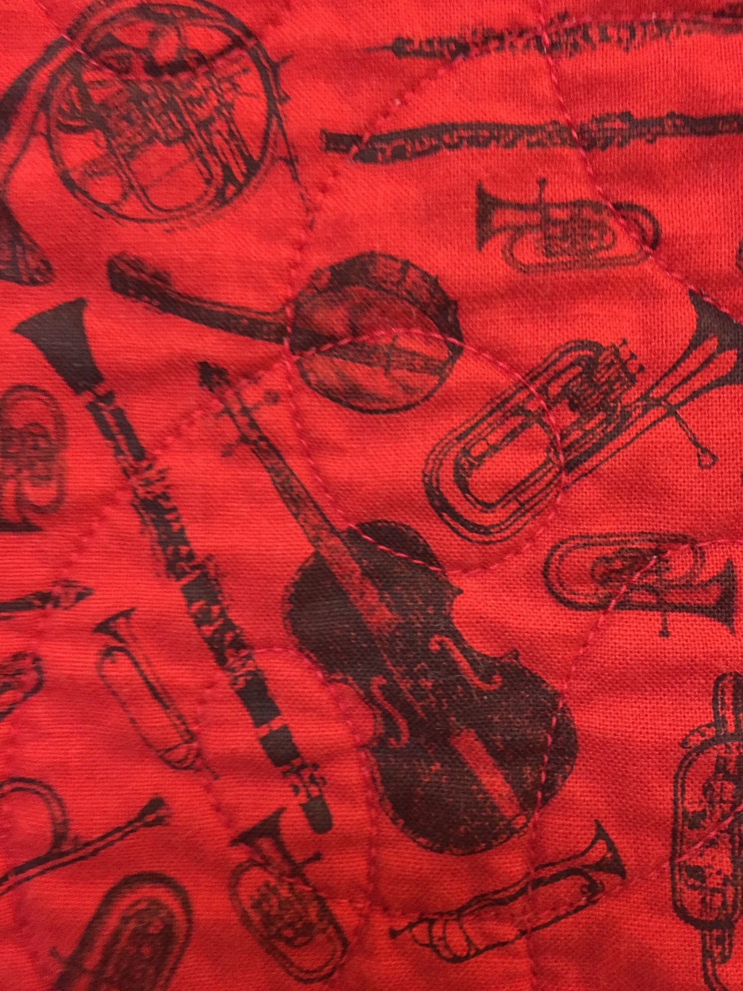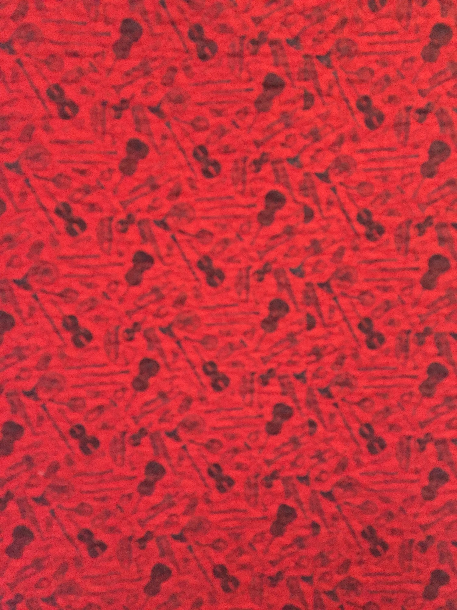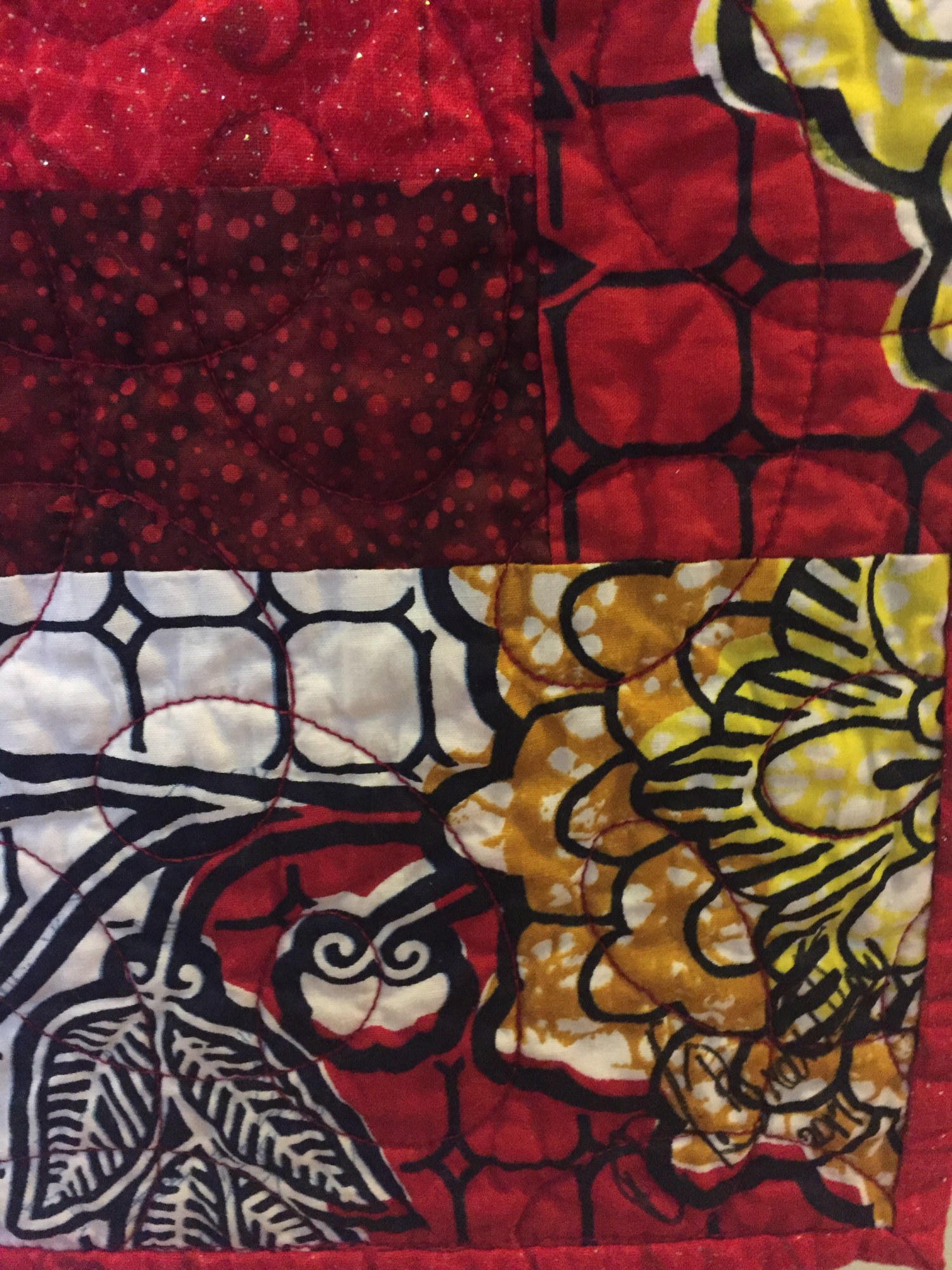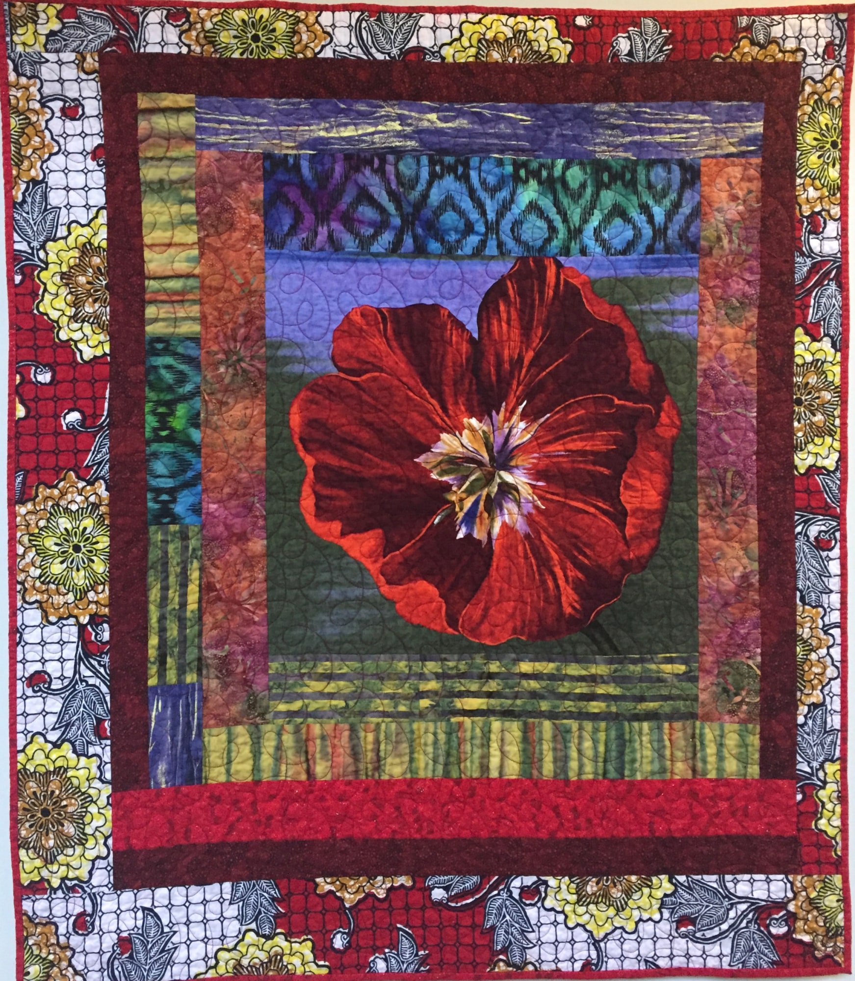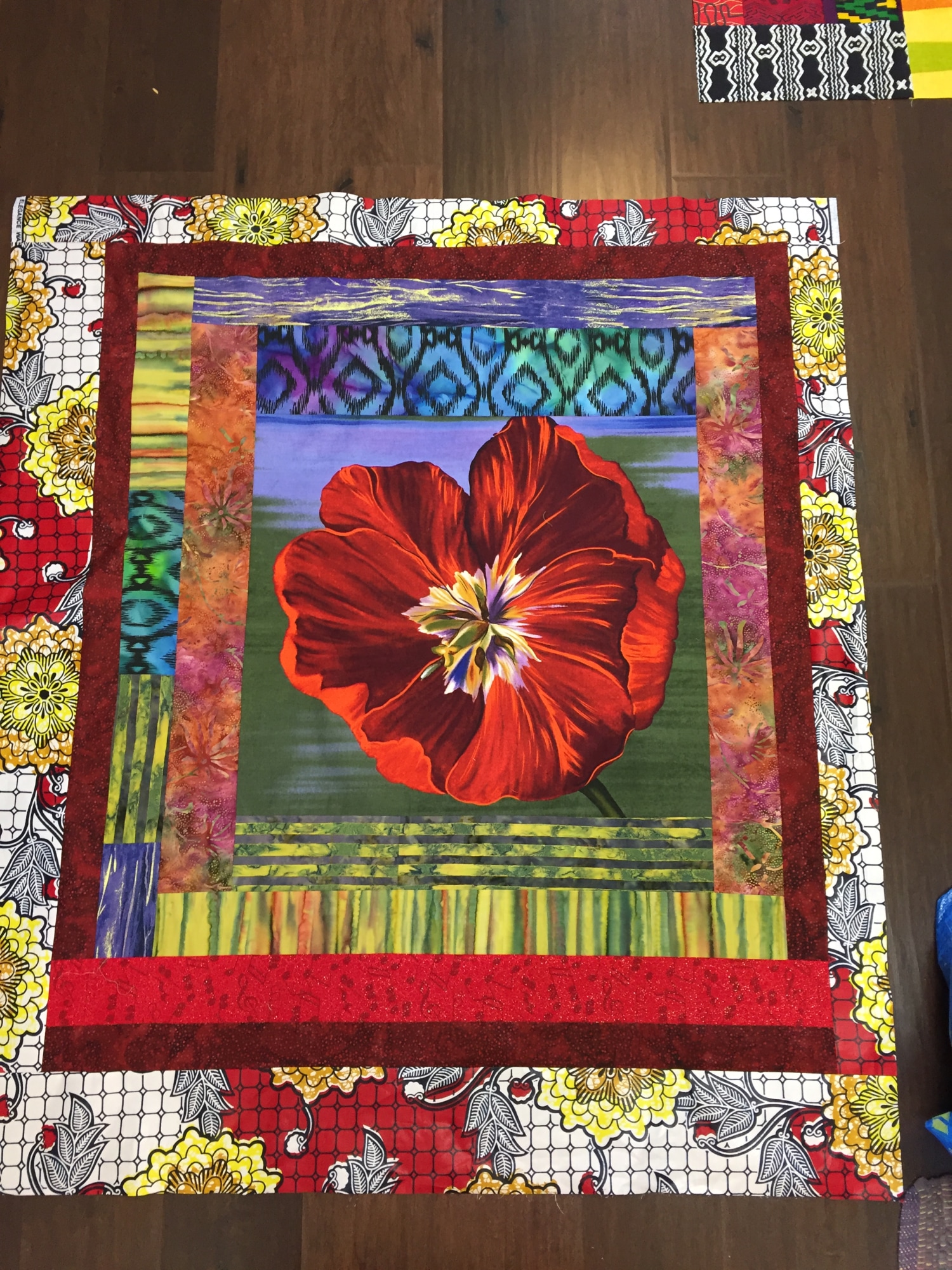 “Give Yourself a Bold Red Flower” starts with a big red flower panel by Stephanie Brandenburg. African fabrics, batiks and musical notes bring the flower to life.
