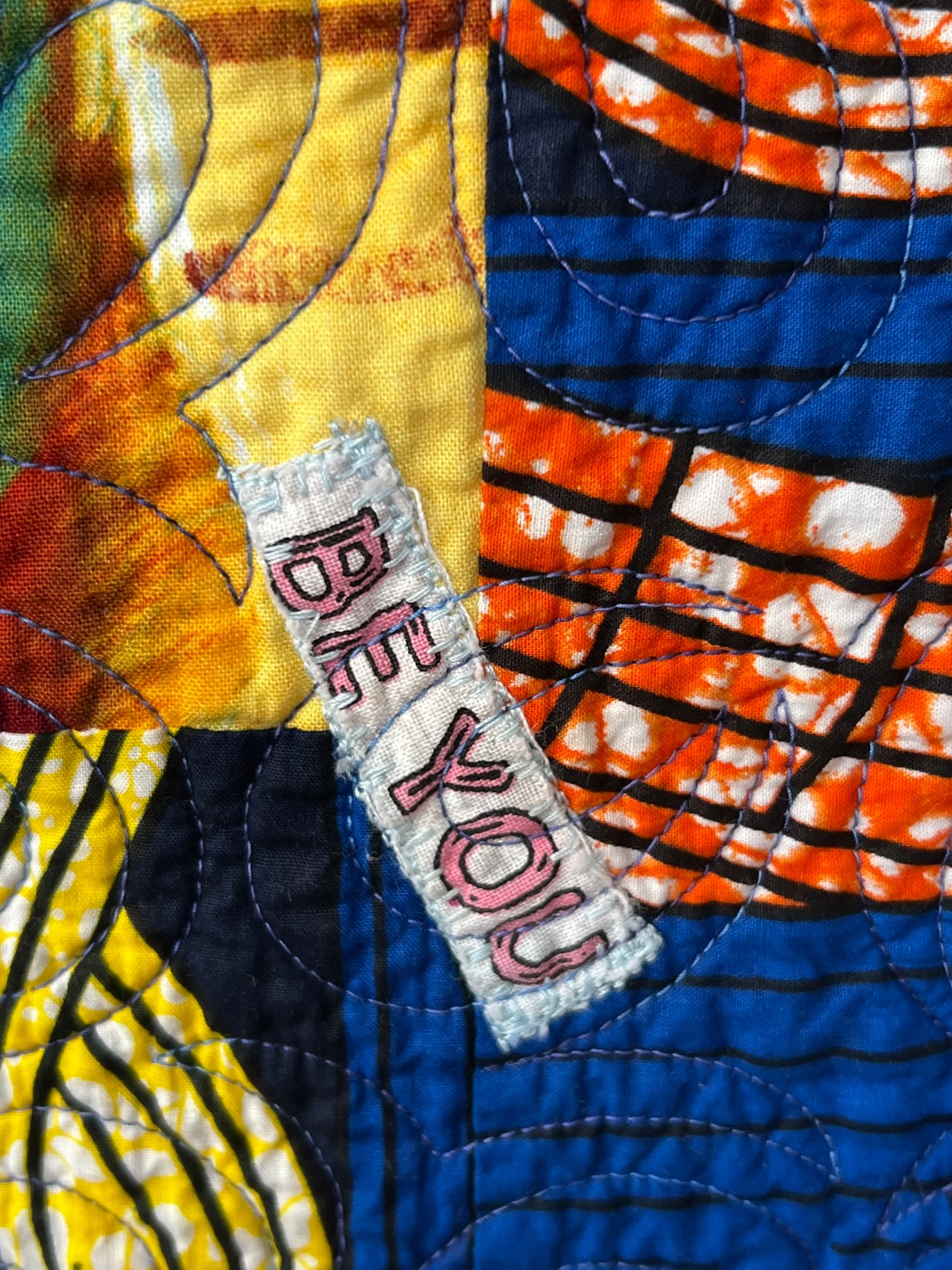 The back of the quilt is an African blue, green and orange fabric. There is a hanging sleeve on the back for easy display and a label that documents the quilt.