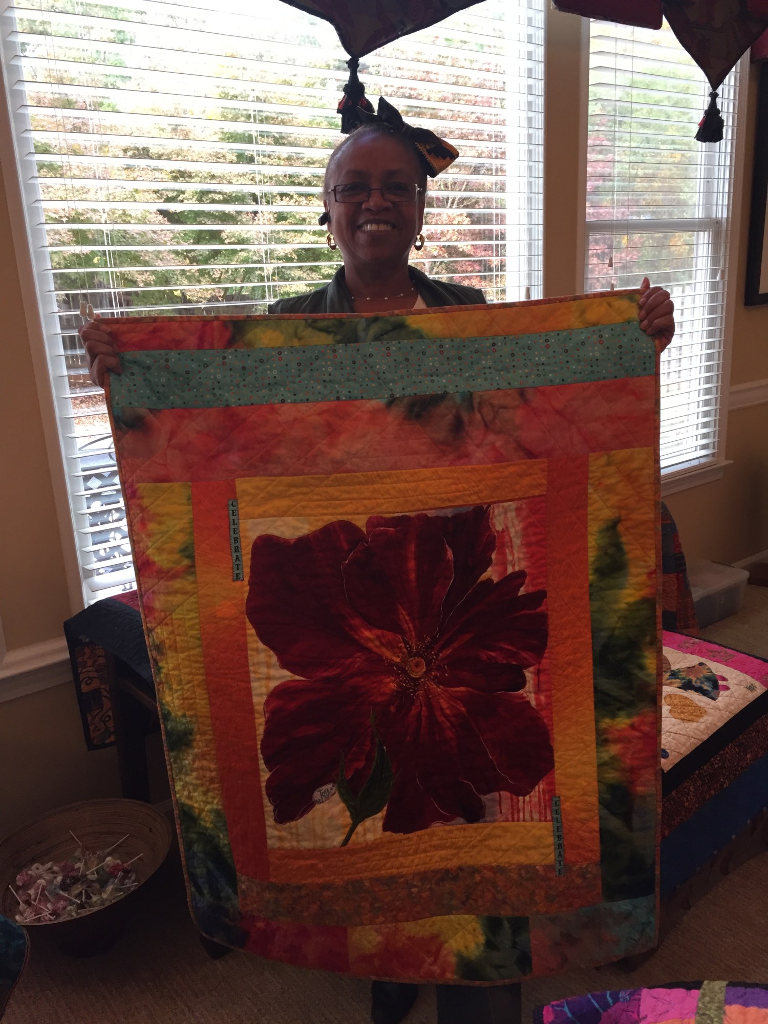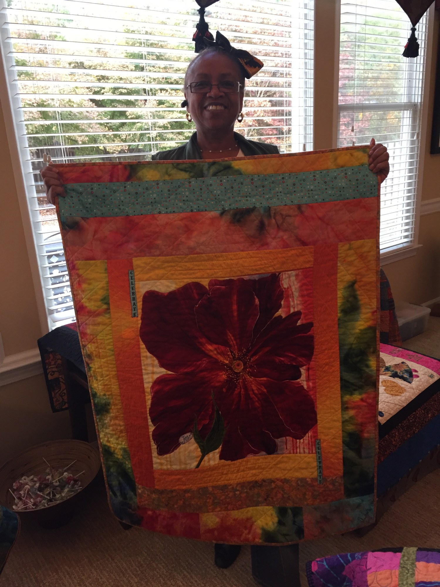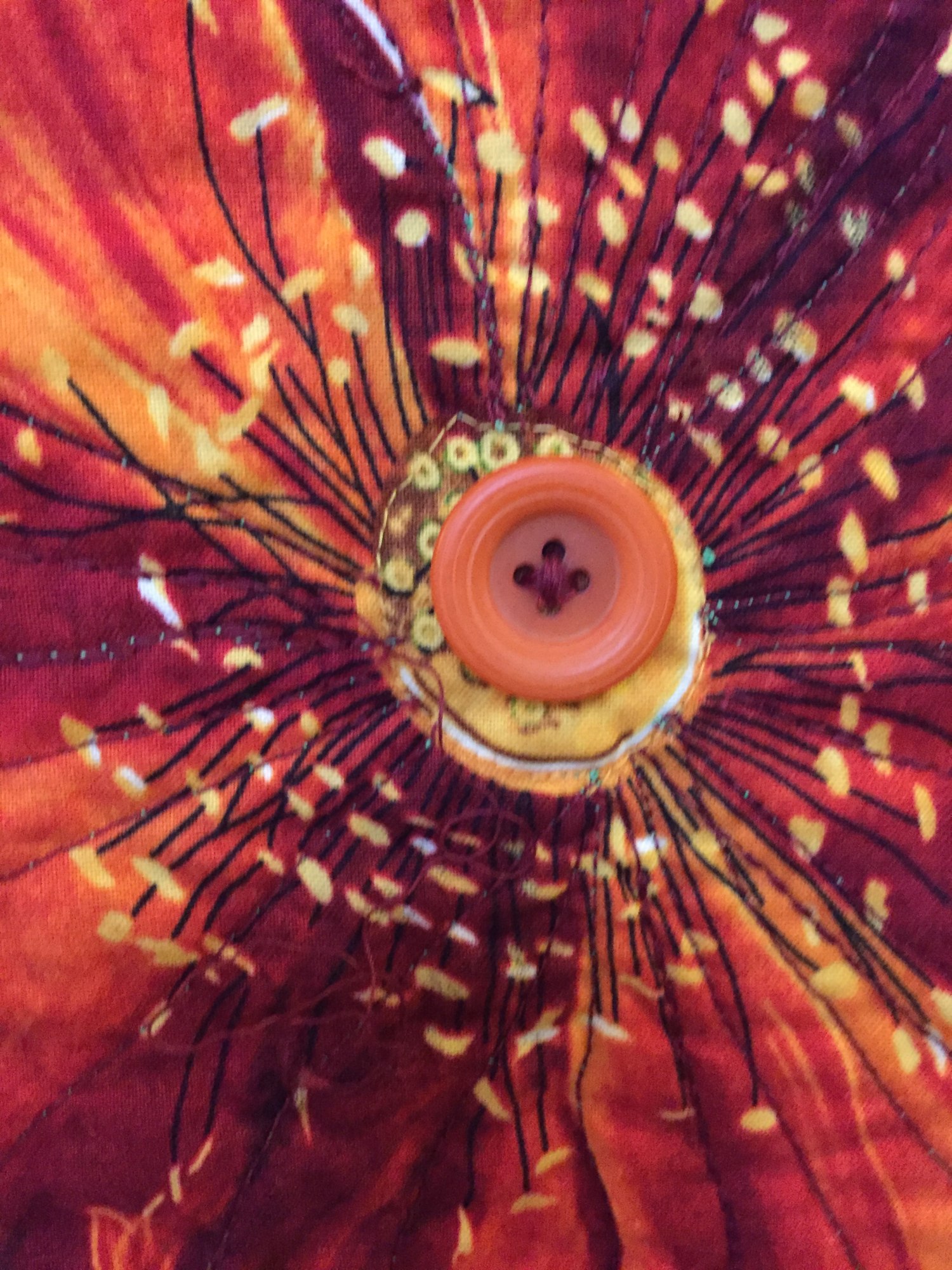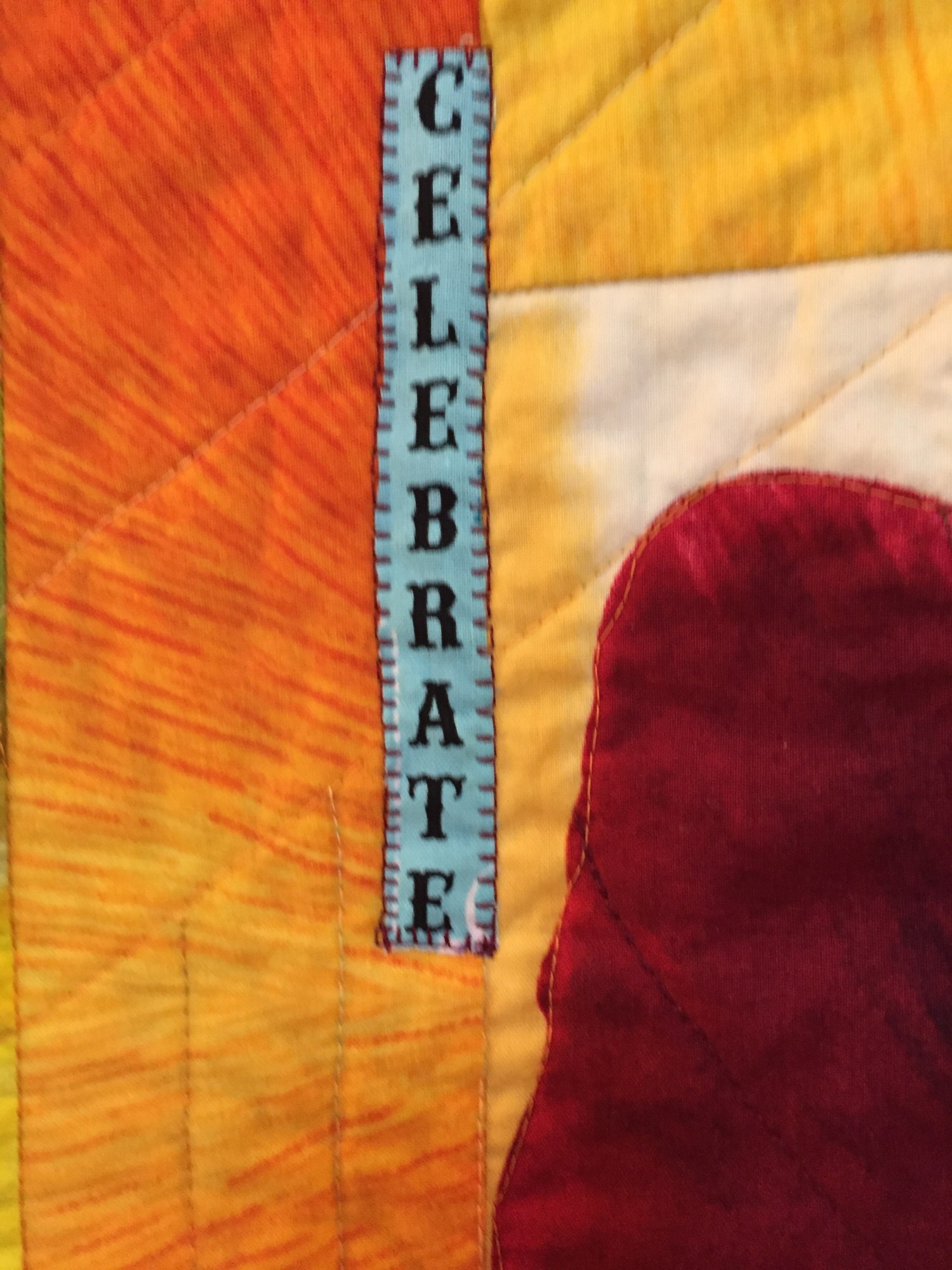 "Give Yourself a Red Flower" measures 35x 45 inches. The center is a panel designed by Stephanie Brandenburg. The panel is framed by an orange and yellow gradation fabric with a batik border that gives the quilt a scrappy quilt. It is embellished with words and buttons and pieced and quilted by machine. The words are "Celebrate" and "joy ".