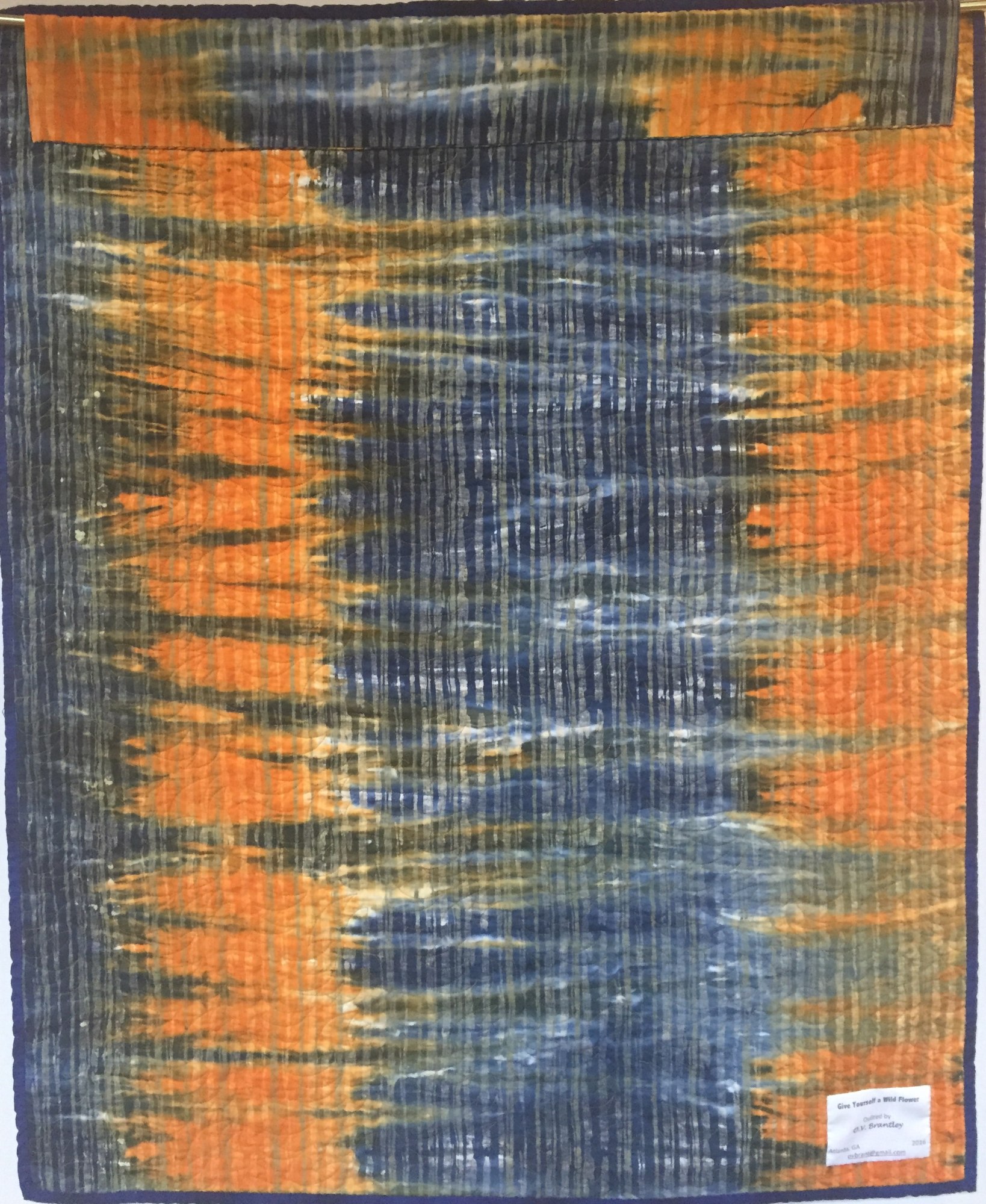 "Give Yourself a Wild Flower" measures 36x 45 inches. The center is a panel designed by Stephanie Brandenburg. The panel is framed by an African print which adds to the distinctiveness of the piece. It is embellished with hand sewn beads and a charm that says "inspire". It is pieced and quilted by machine.