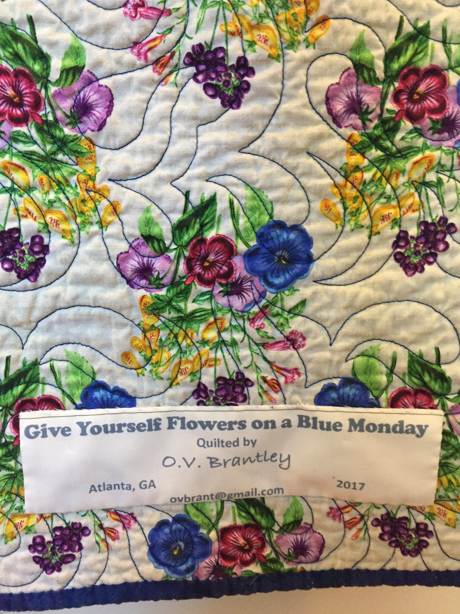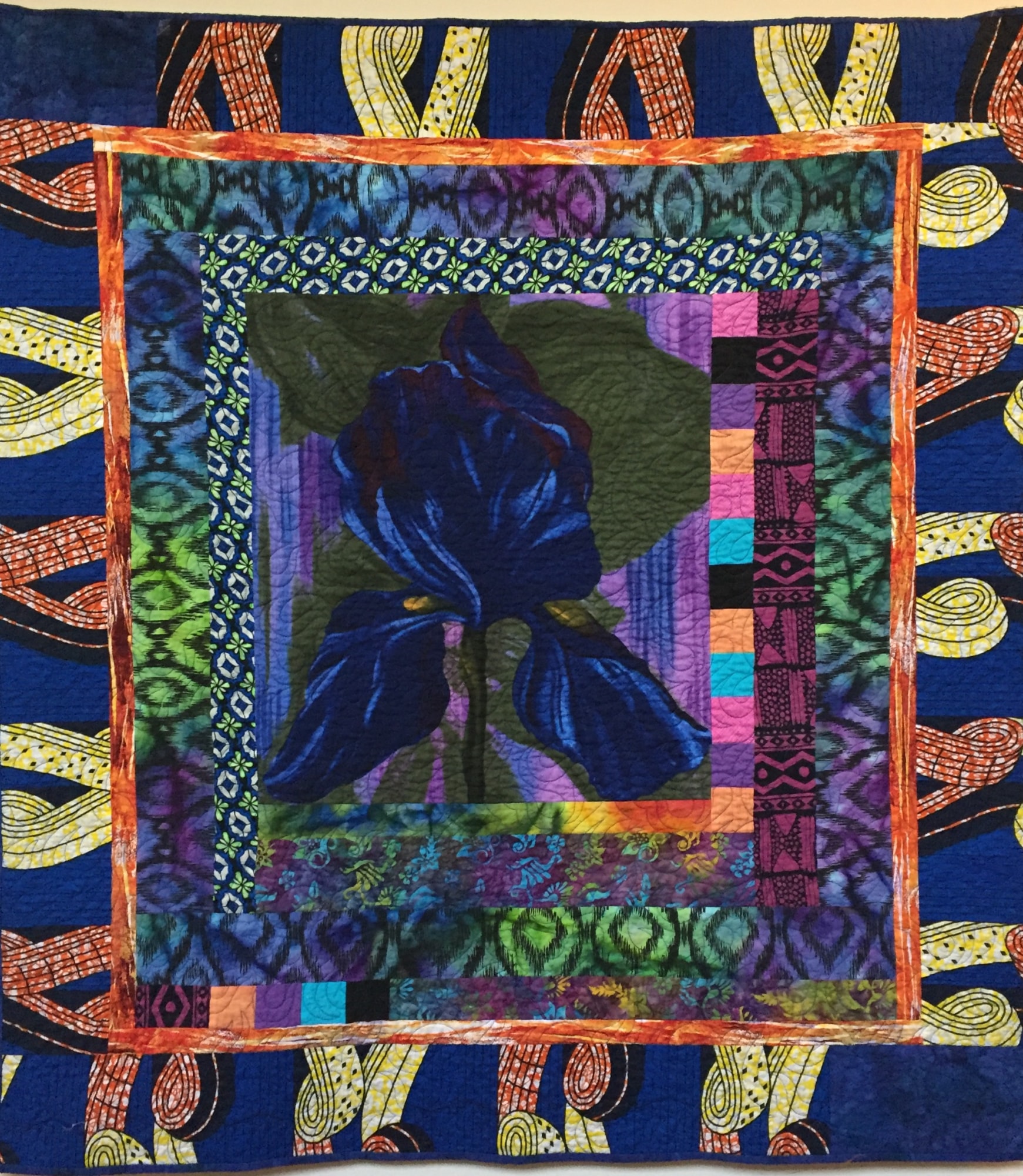 "Give Yourself Flowers on a Blue Monday" measures 42 x 47 inches. The center is a panel designed by Stephanie Brandenburg. The panel is framed by an African print with splashes of yellow which adds to the distinctiveness of the piece. It is pieced and quilted by machine.