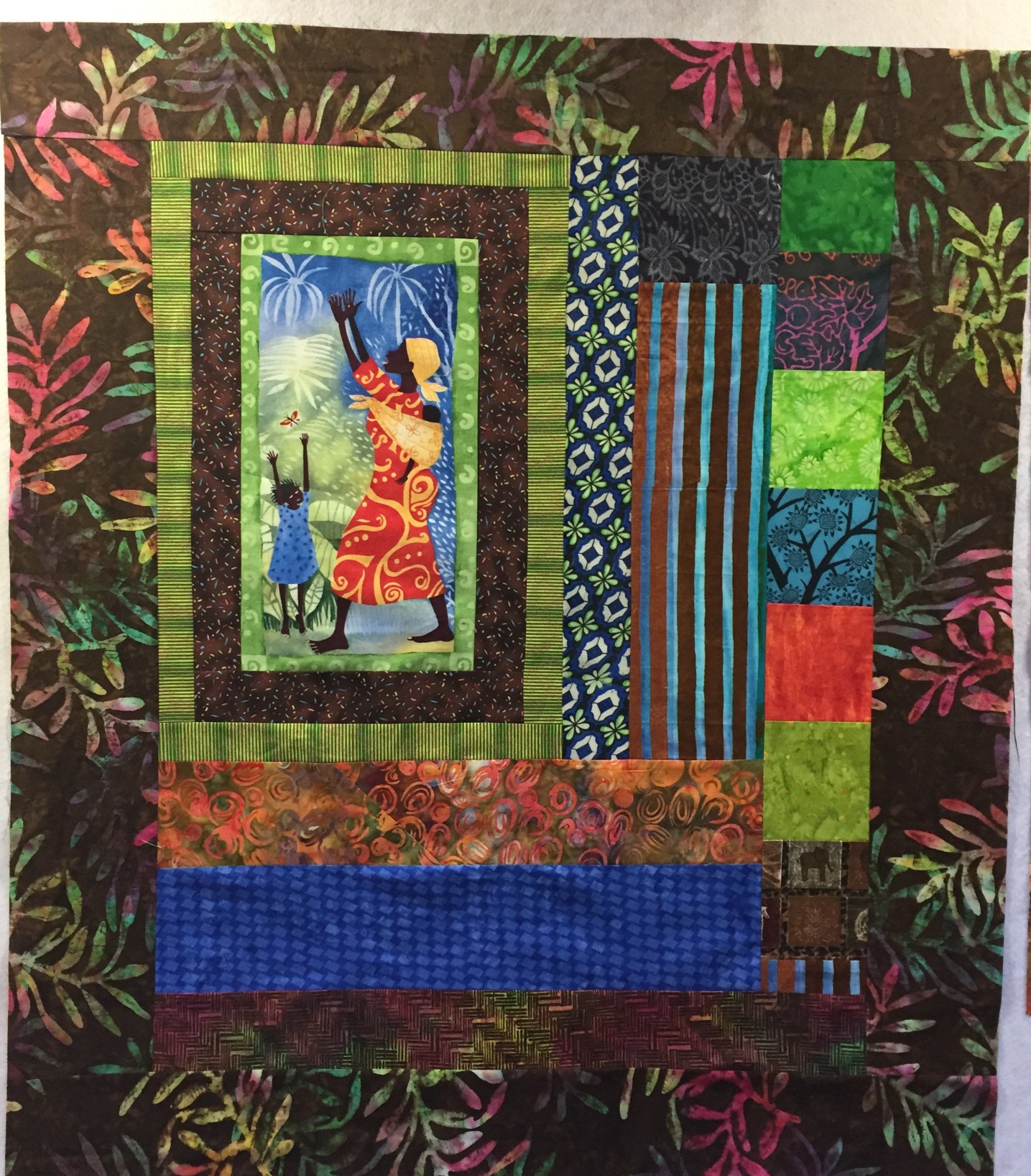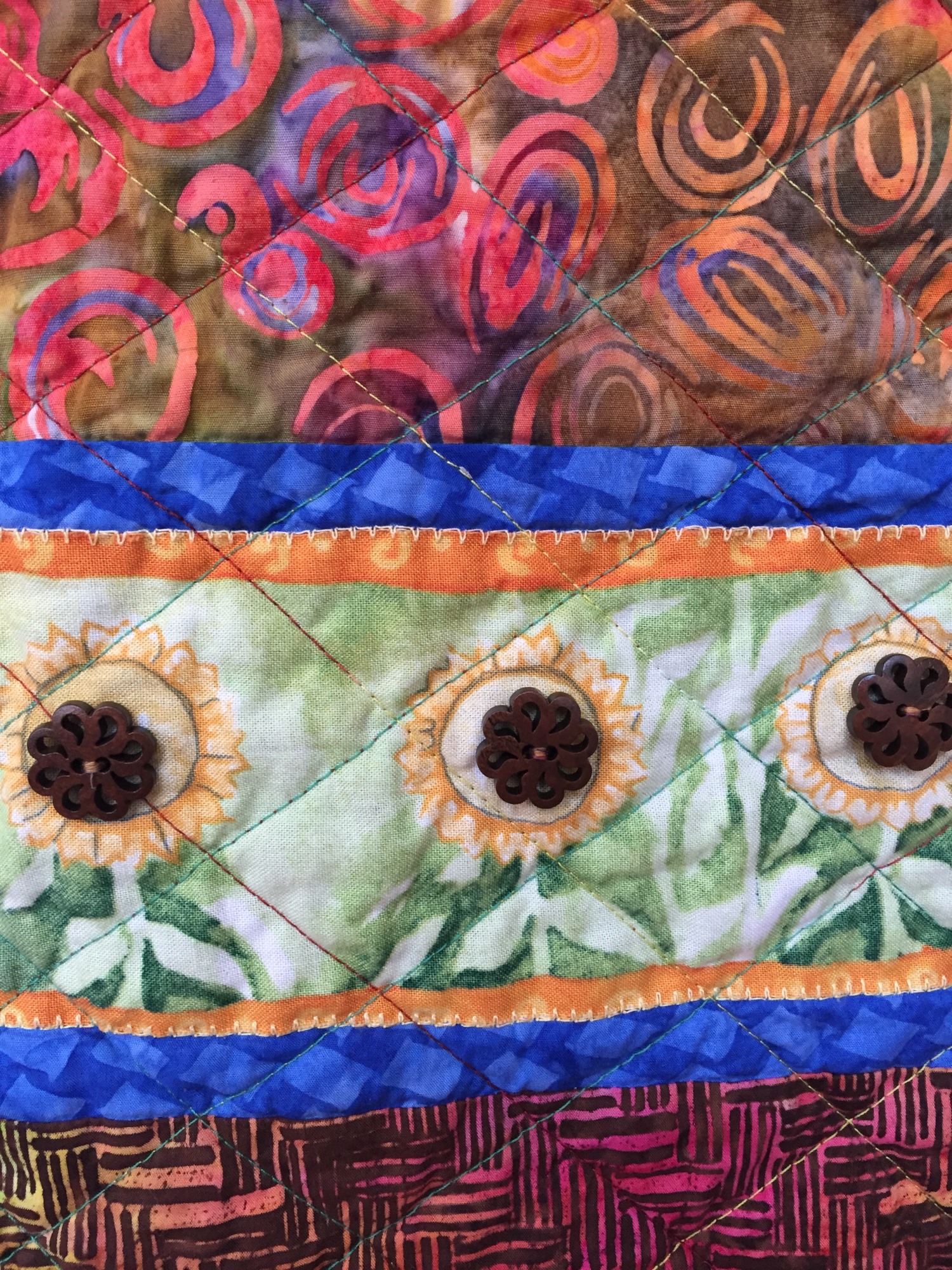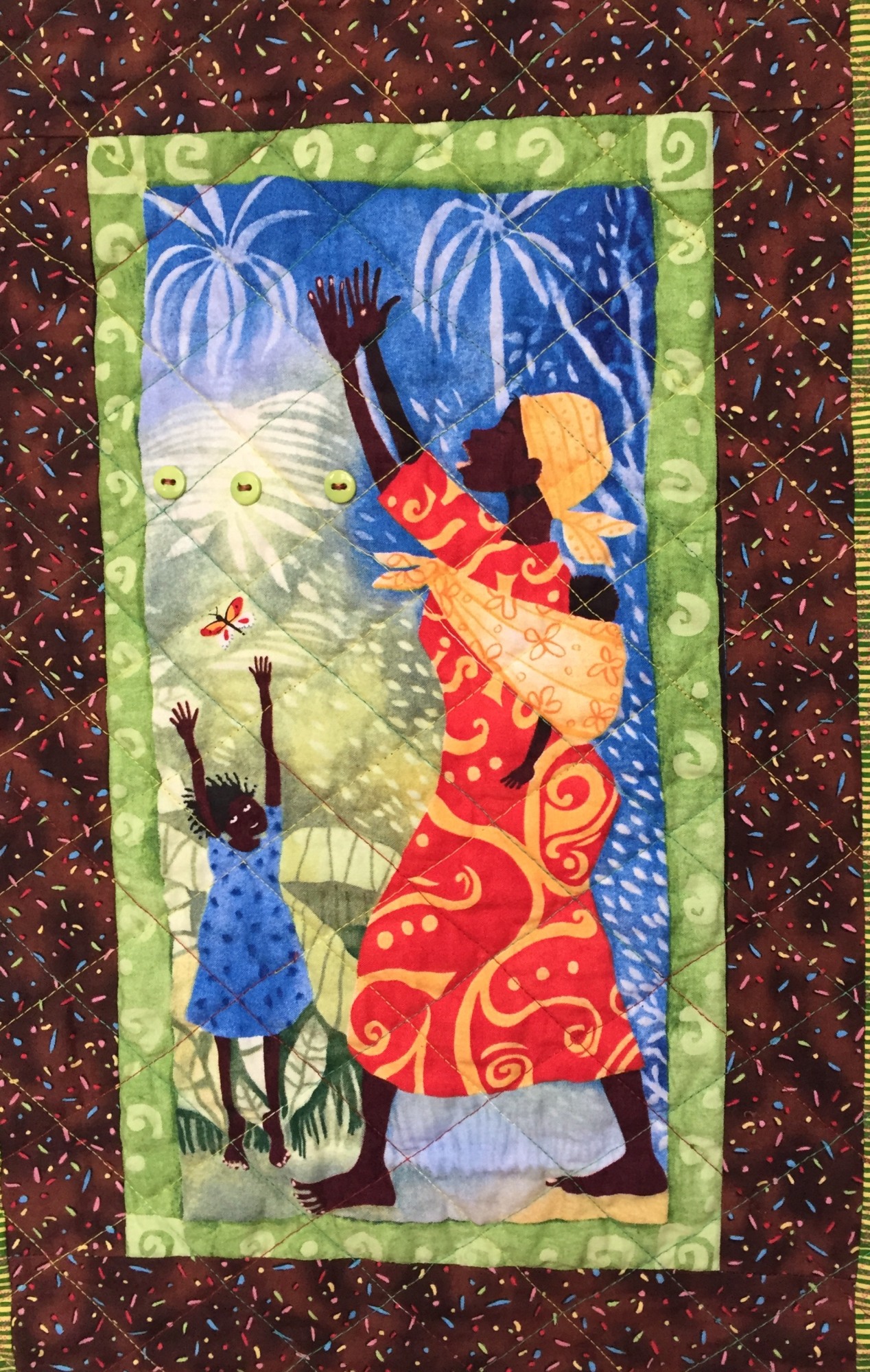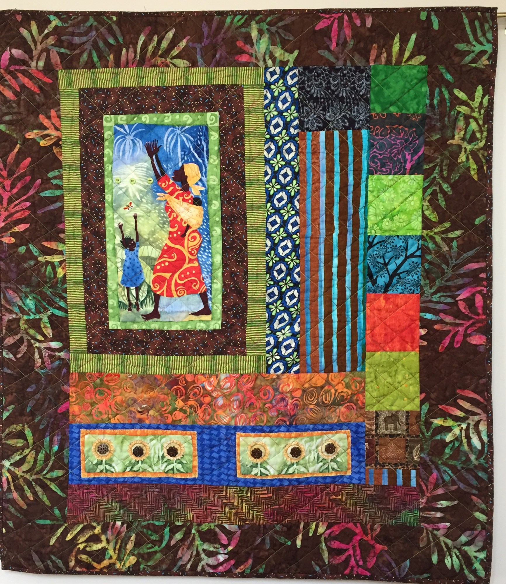 "Grateful For Another Happy Day #2" measures 35x40 inches. The dominant color is brown in a mixture of batiks and African fabrics. It is pieced and quilted on my machine and embellished with buttons.