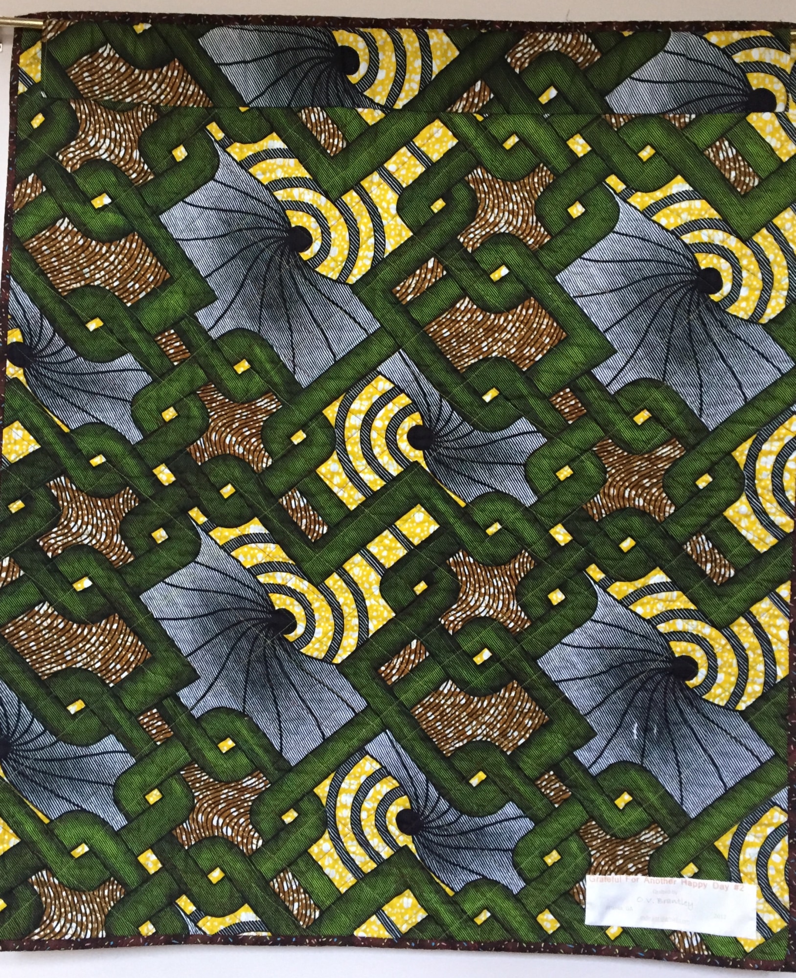 The fabric on the back is a green African print. There is a hanging sleeve for easy display and a label that documents the quilt.