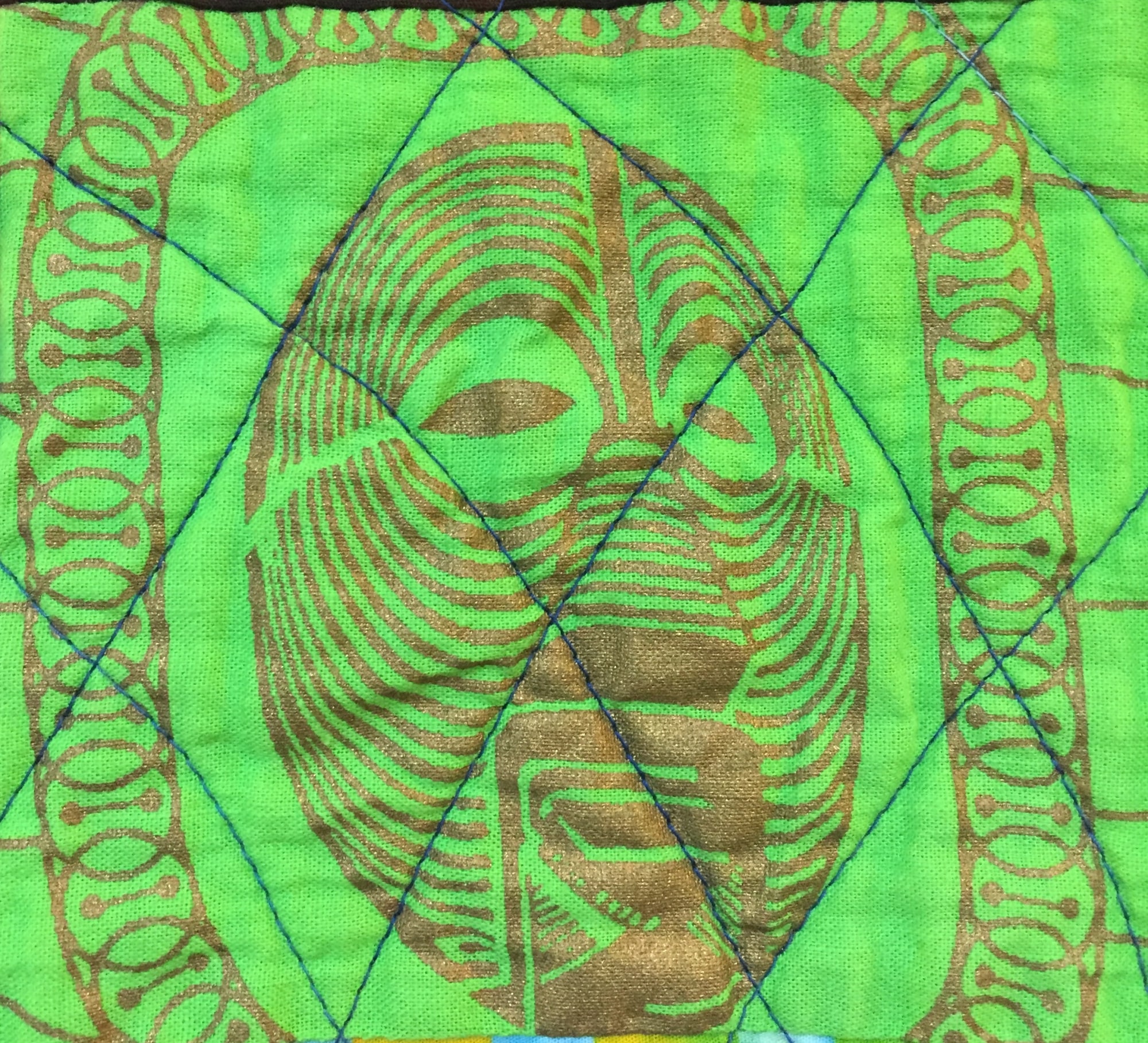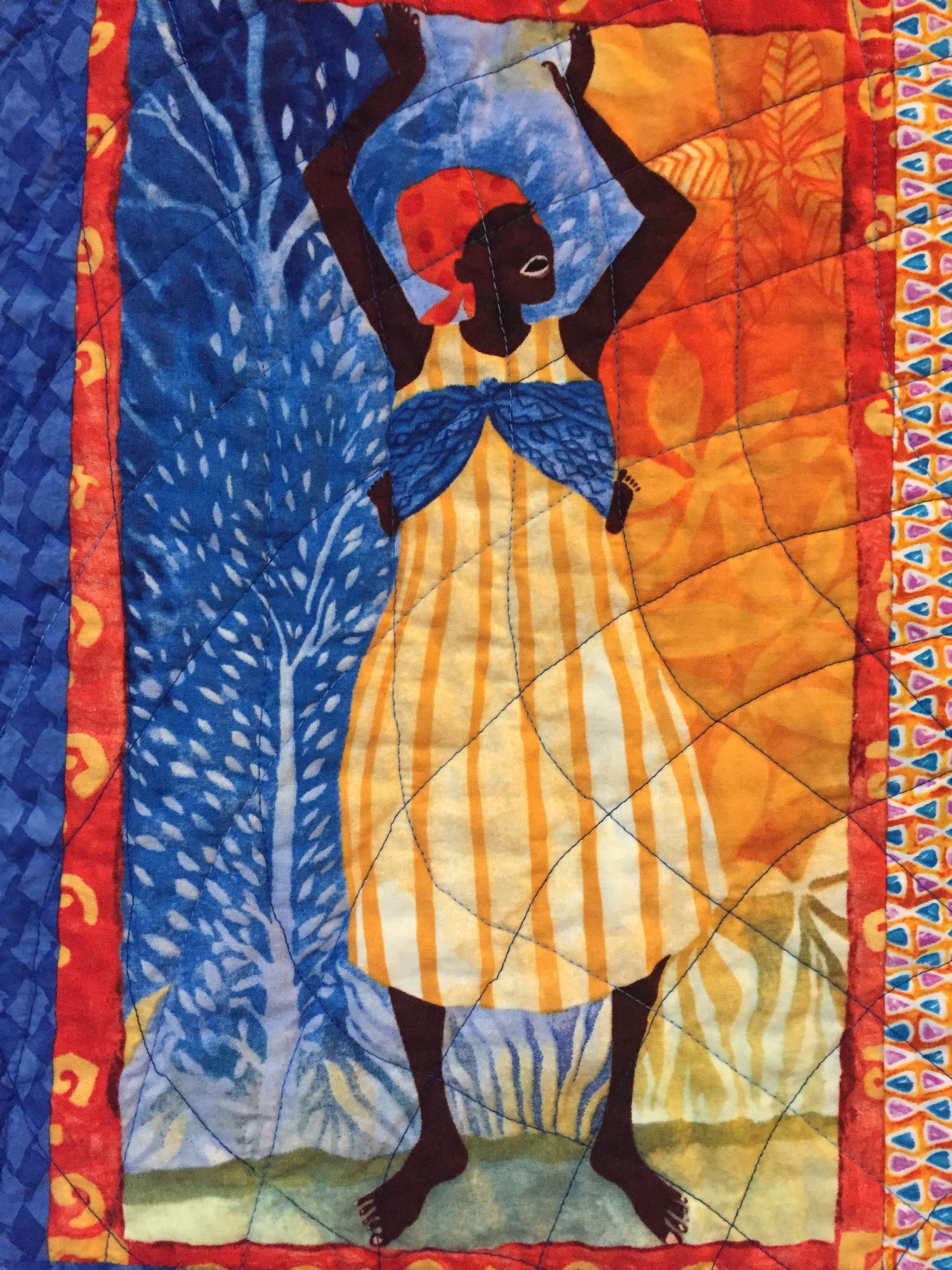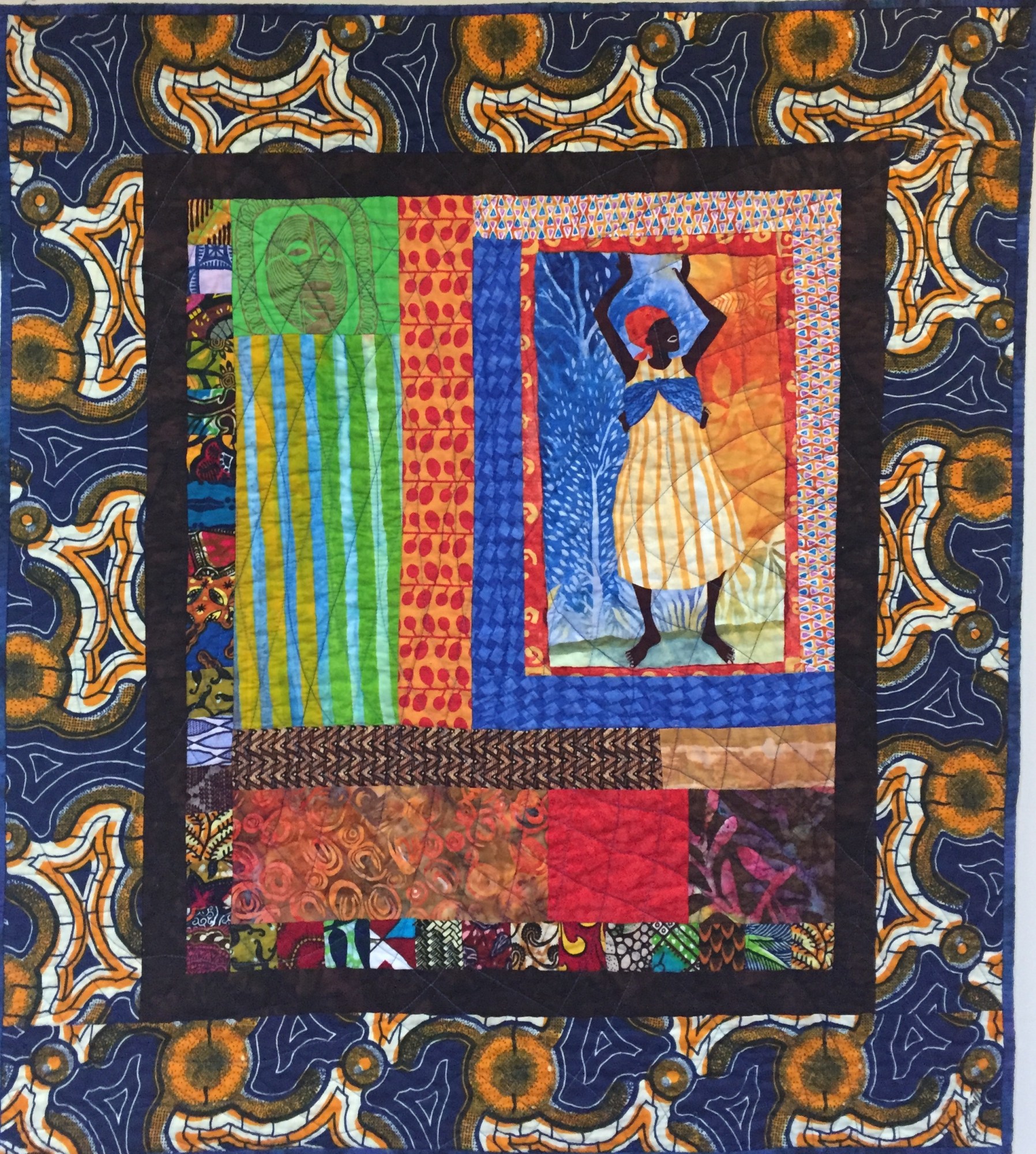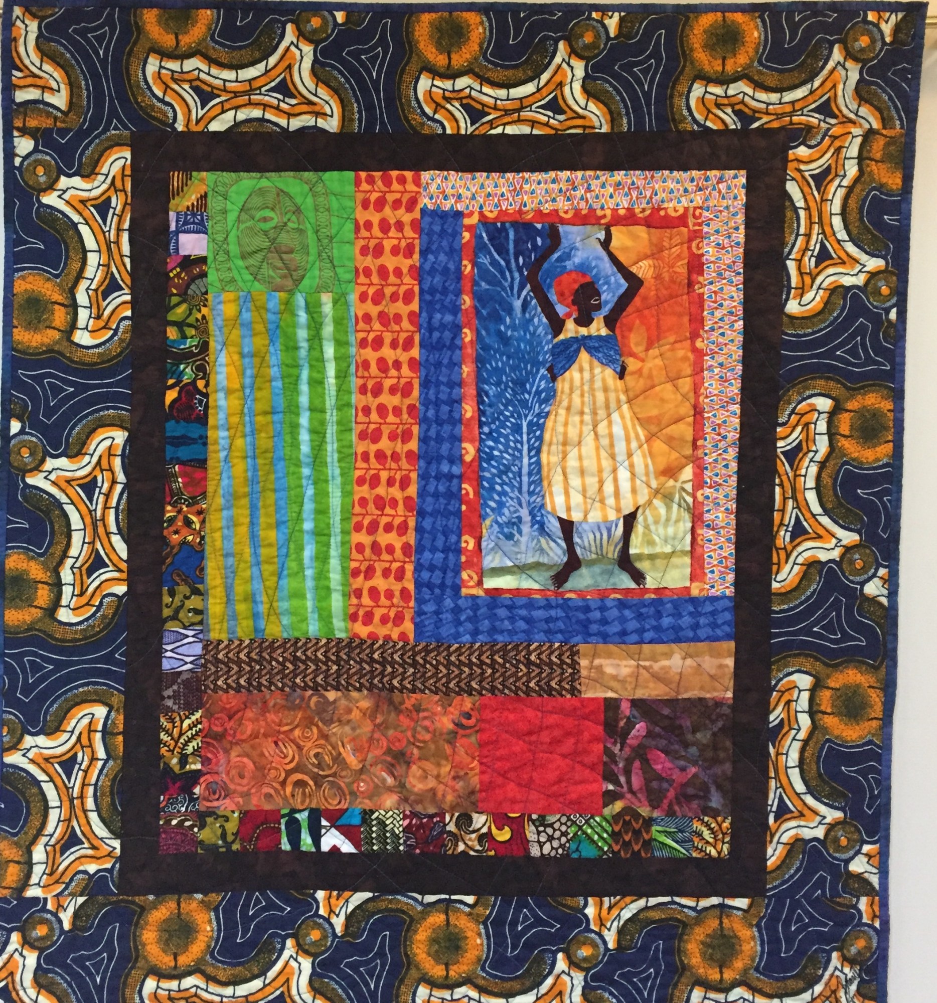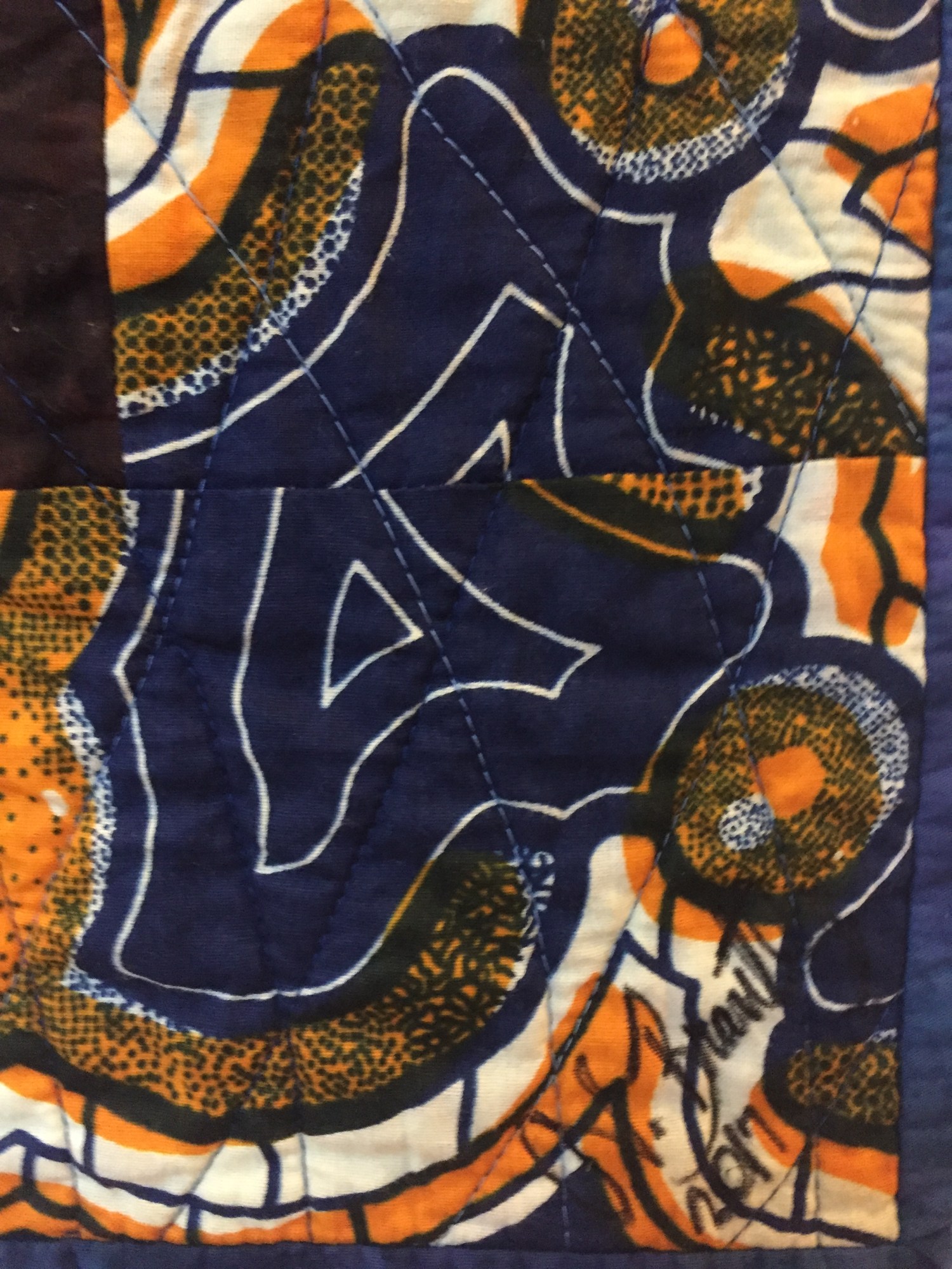 "Grateful For Another Happy Day #3" measures 31x34 inches. The dominant colors are blue and orange in a mixture of batiks and African fabrics. It is pieced and quilted on my machine.
