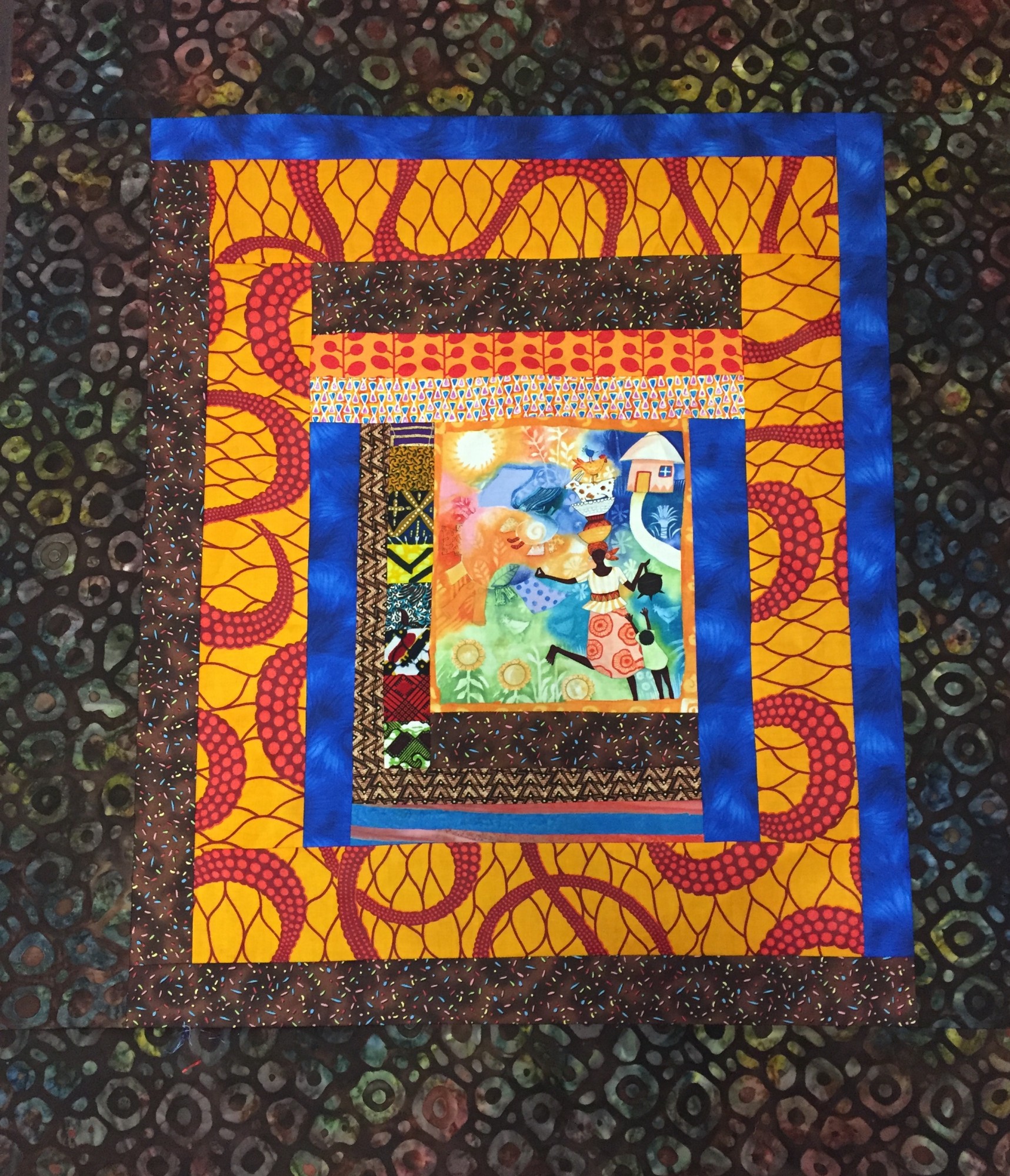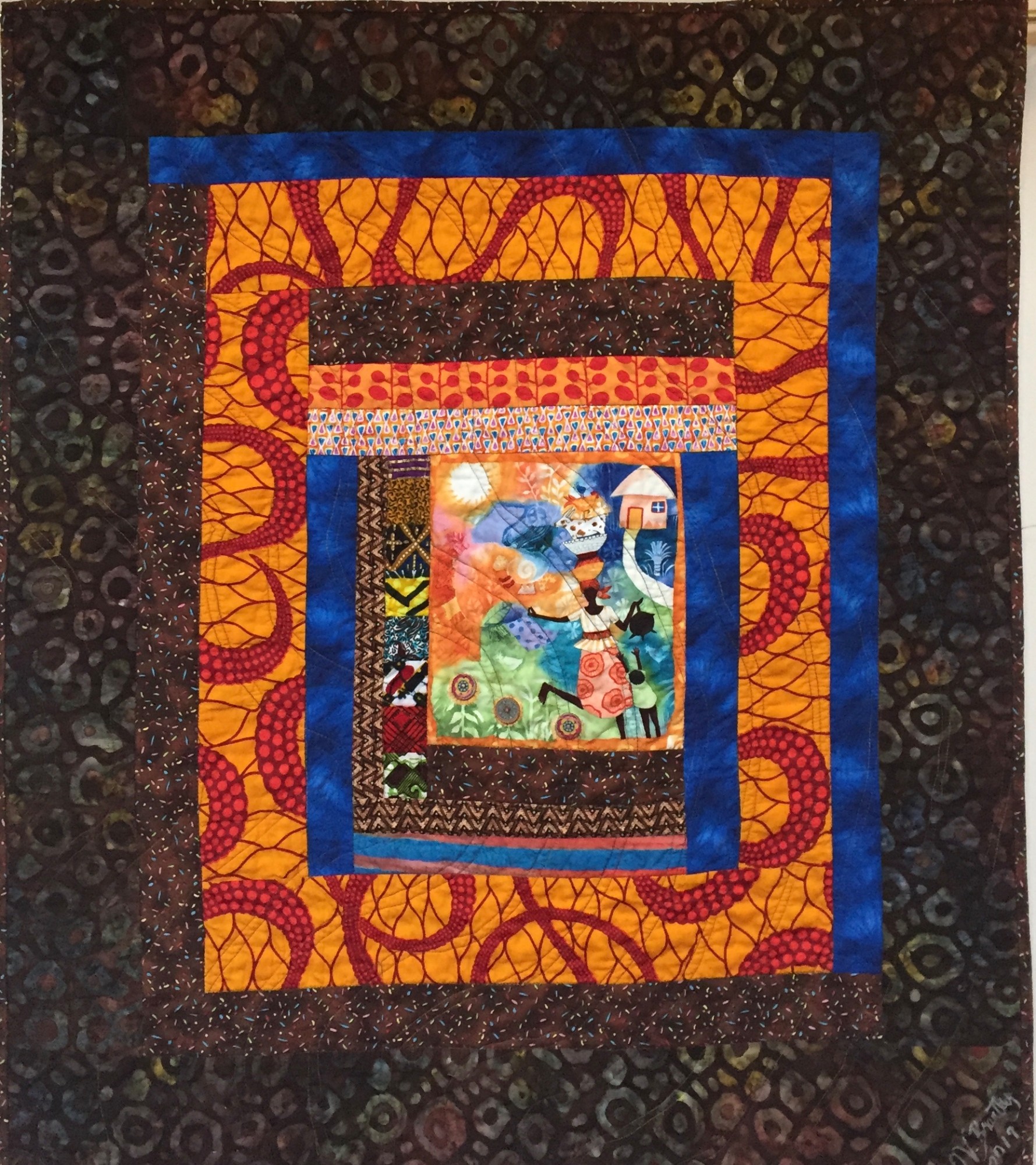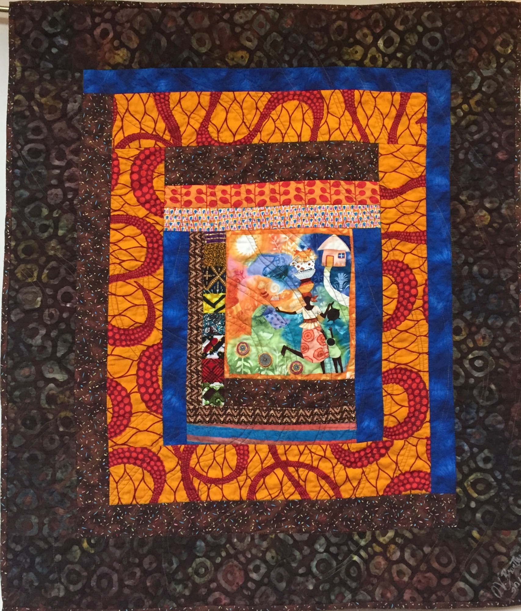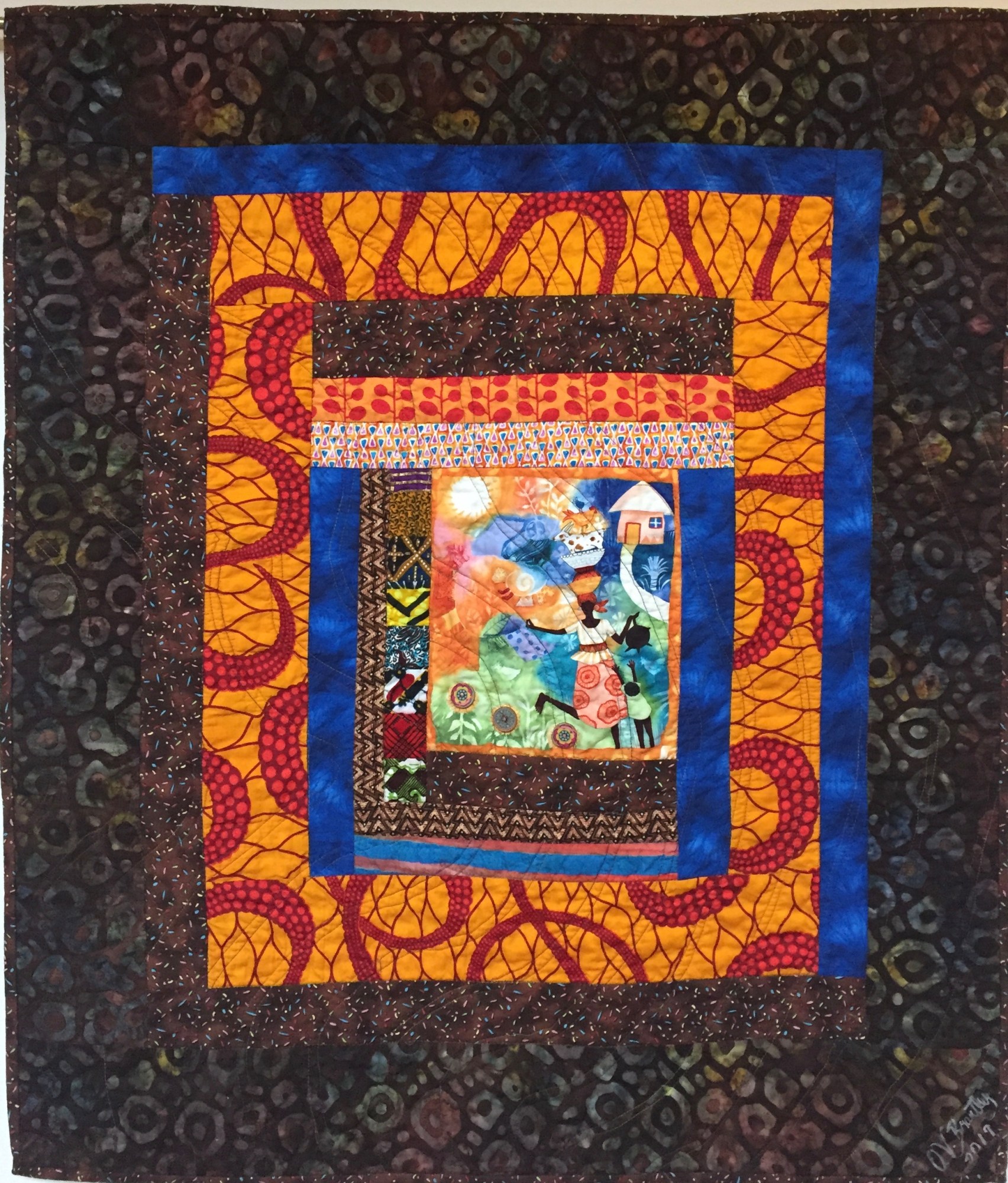 The fabric on the back is a blue and brown African quilt. There is a hanging sleeve for easy display and a label that documents the quilt.