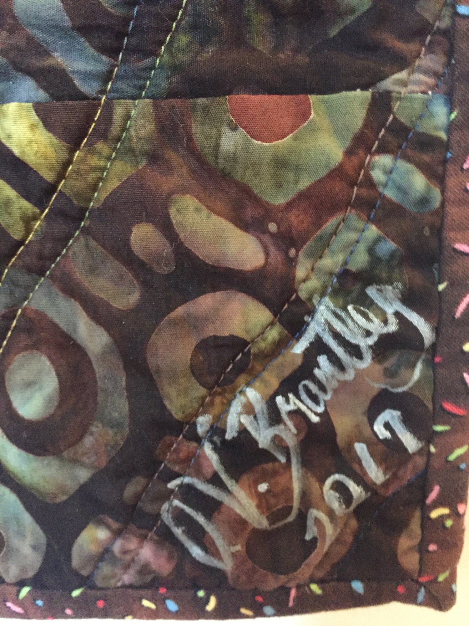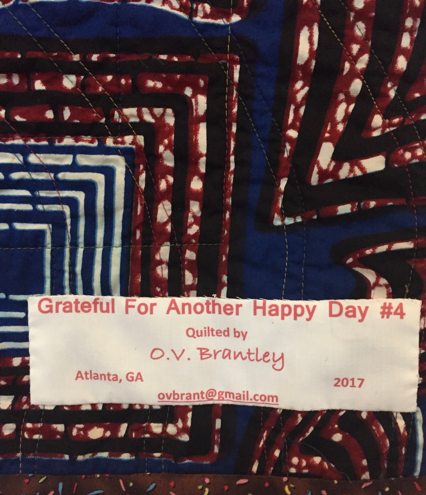 I signed and dated the quilt on the front. "Grateful For Another Happy Day #4" is one-of-a-kind.