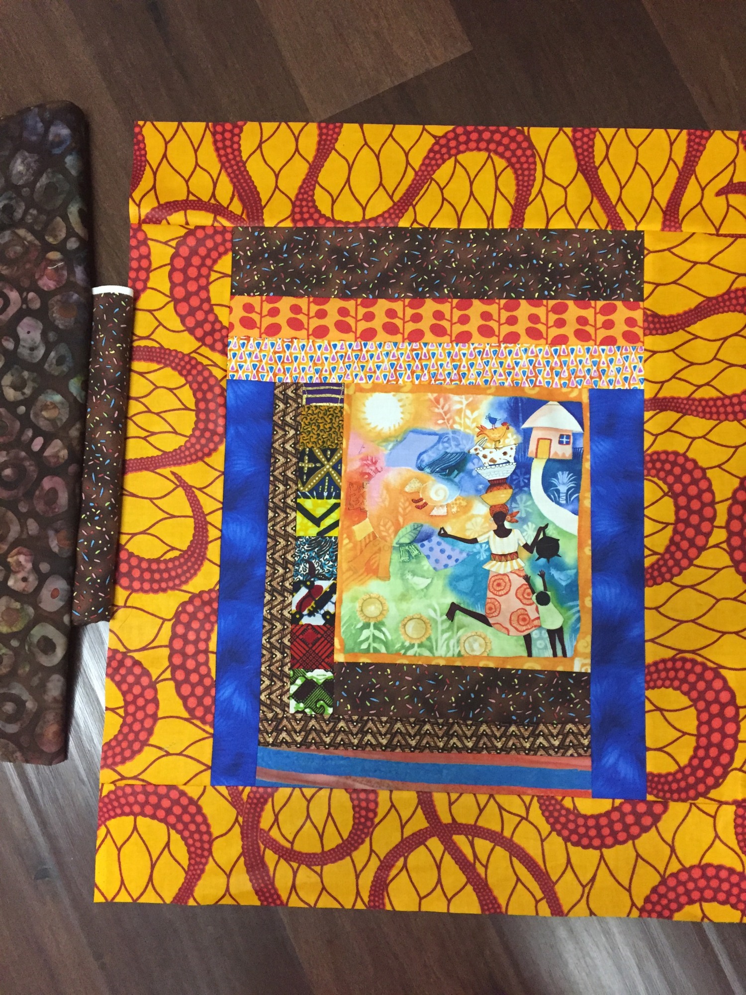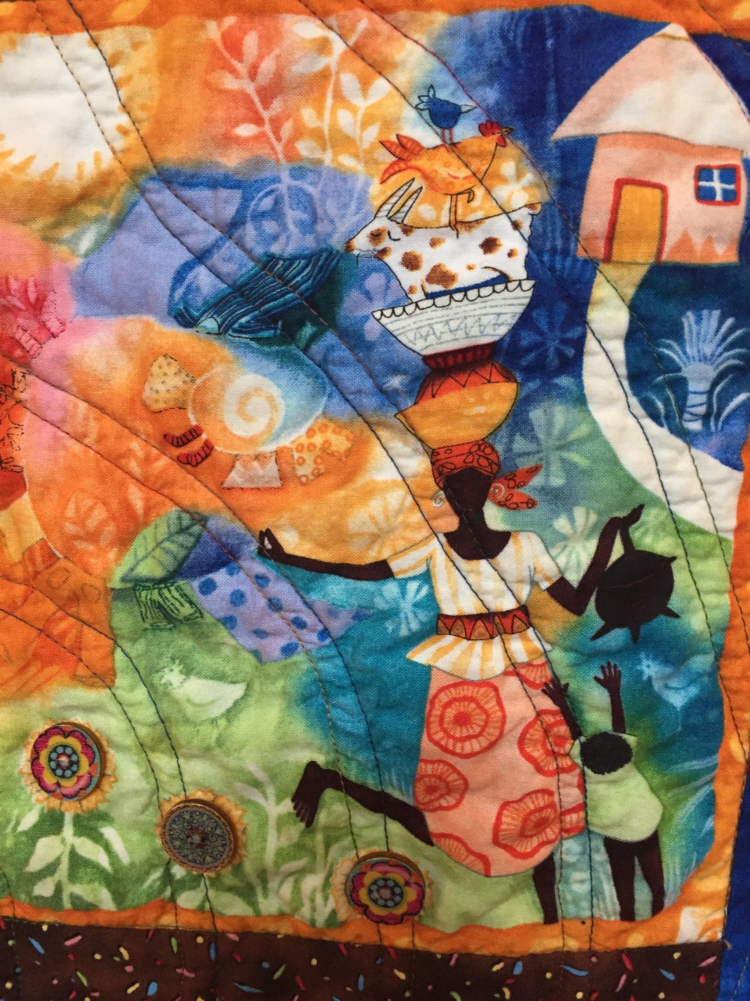"Grateful For Another Happy Day #4" measures 32x37inches. The dominant colors are brown and orange in a mixture of batiks and African fabrics. It is pieced and quilted on my machine and embellished with buttons.
