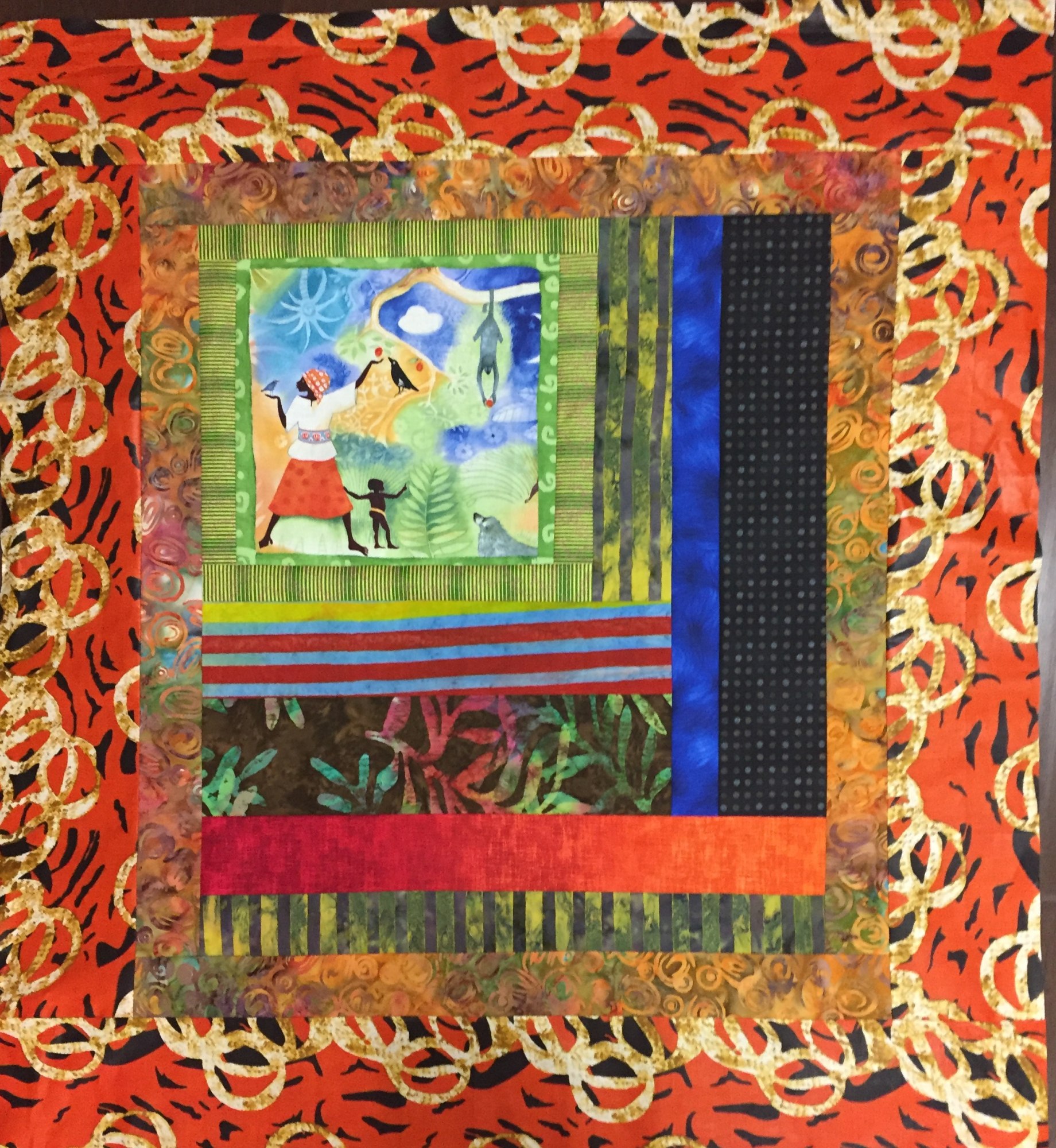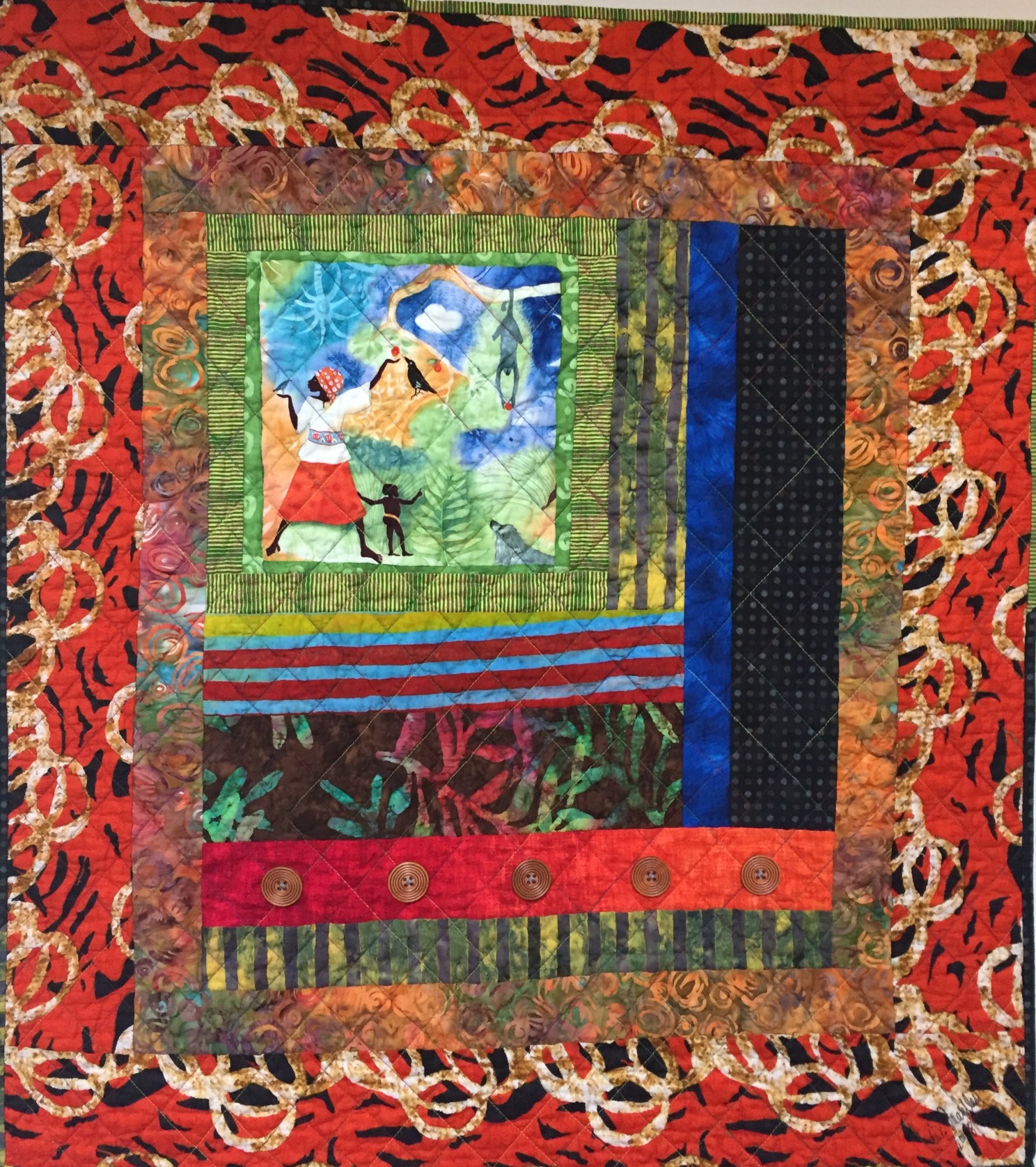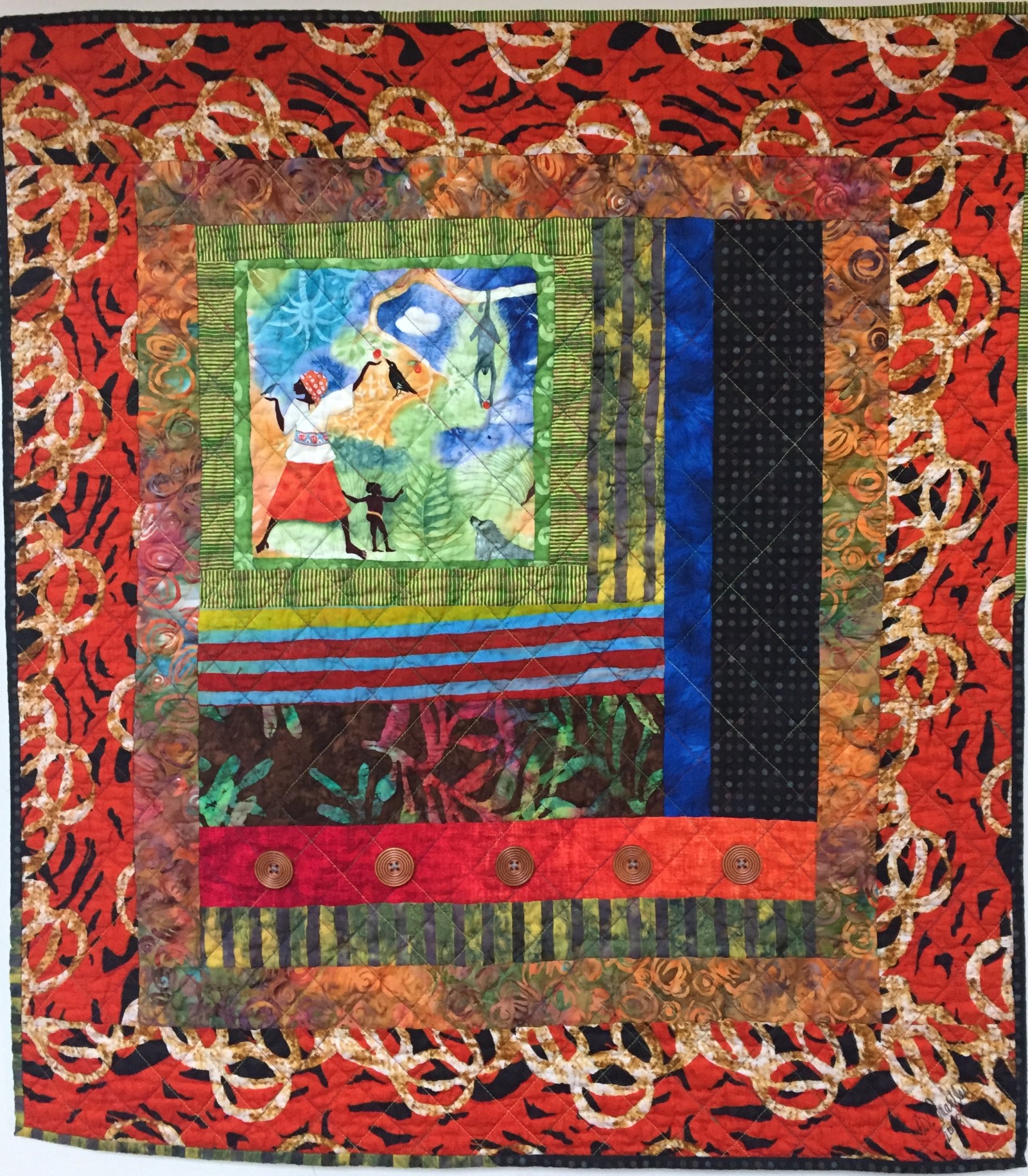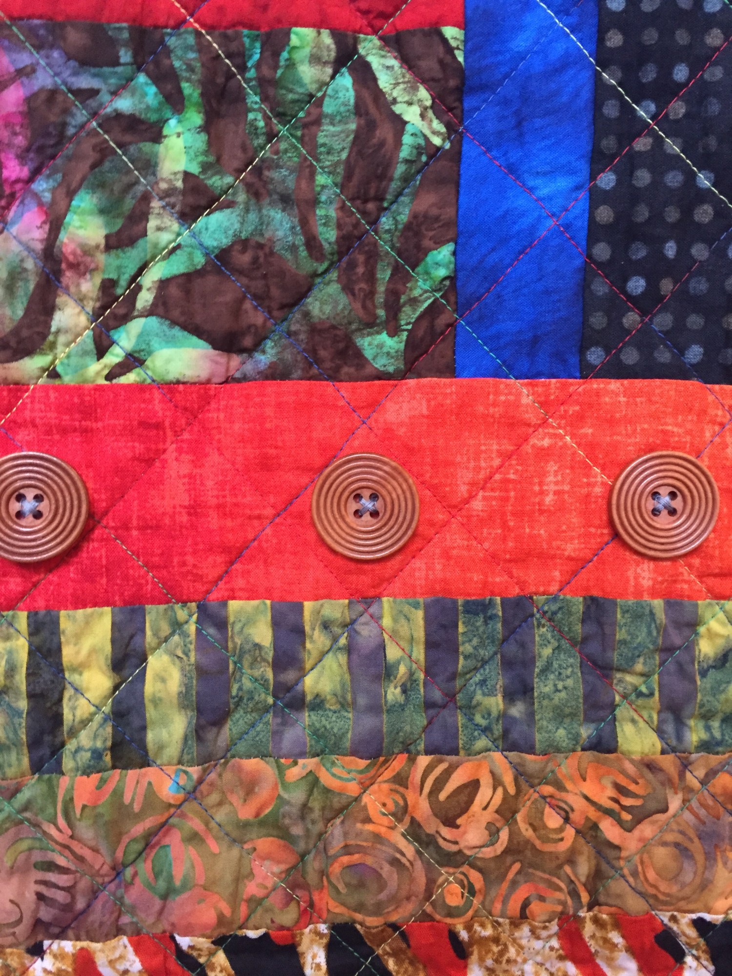 "Grateful For Another Happy Day #5" measures 31x34 inches. The dominant colors are brown and orange in a mixture of batiks and African fabrics. It is pieced and quilted on my machine and embellished with buttons.