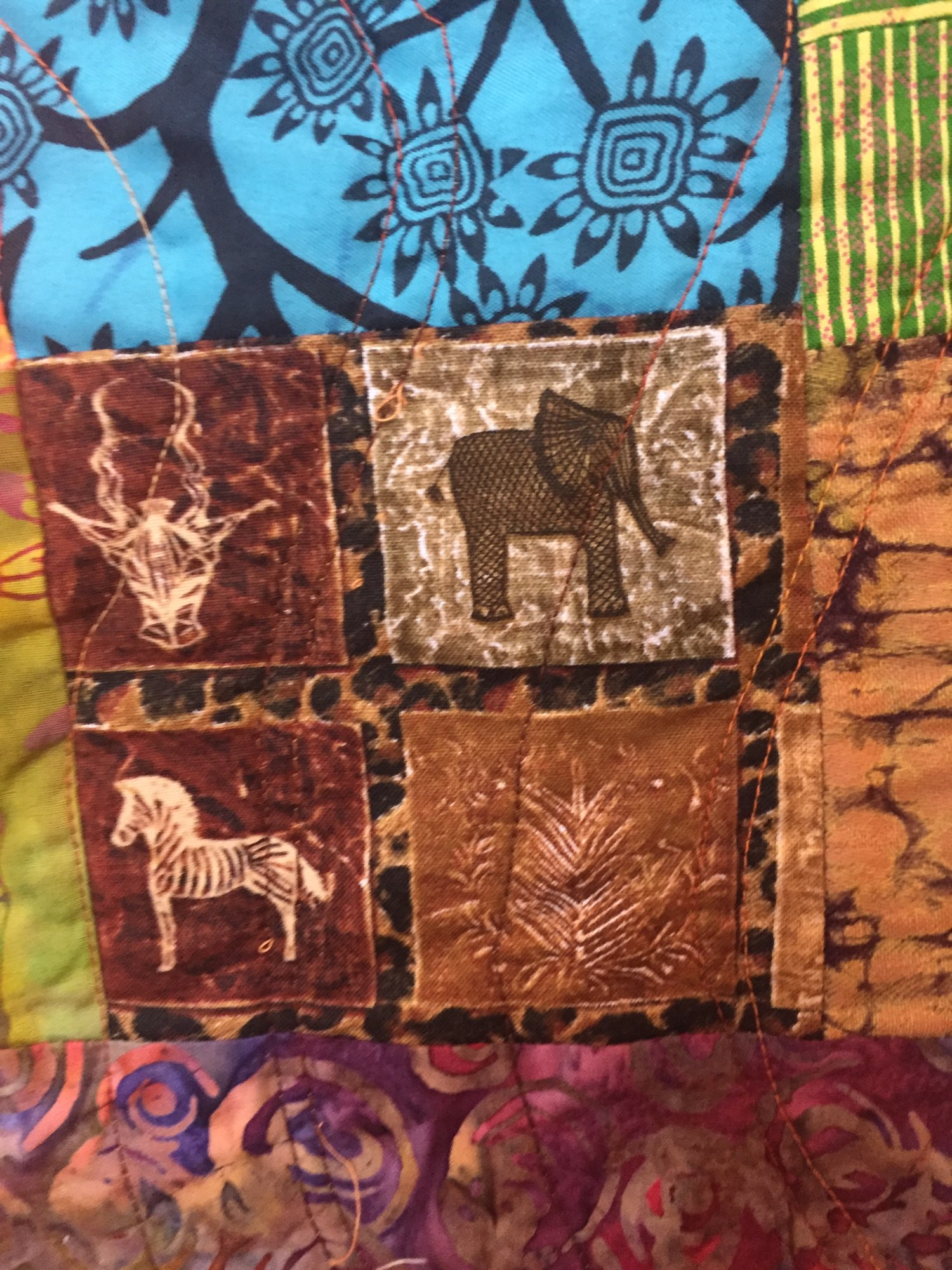 "Grateful For Another Happy Day #1" measures 30x34 inches. The dominant color is orange in a mixture of batiks and African fabrics. It is pieced and quilted on my machine.