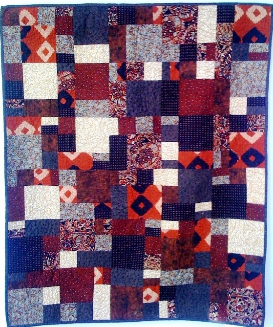 Hot Chocolate is a complex geometric wallhanging in browns and creams. Its abstract modern look could be a decorative focal point in any home. A rich brown and cream African print is featured on the back of the quilt. Hot Chocolate measures 38 x 45 inches. There is a hanging sleeve on the back for easy display. The quilt is labeled, signed and dated by the quilter O.V. Brantley.