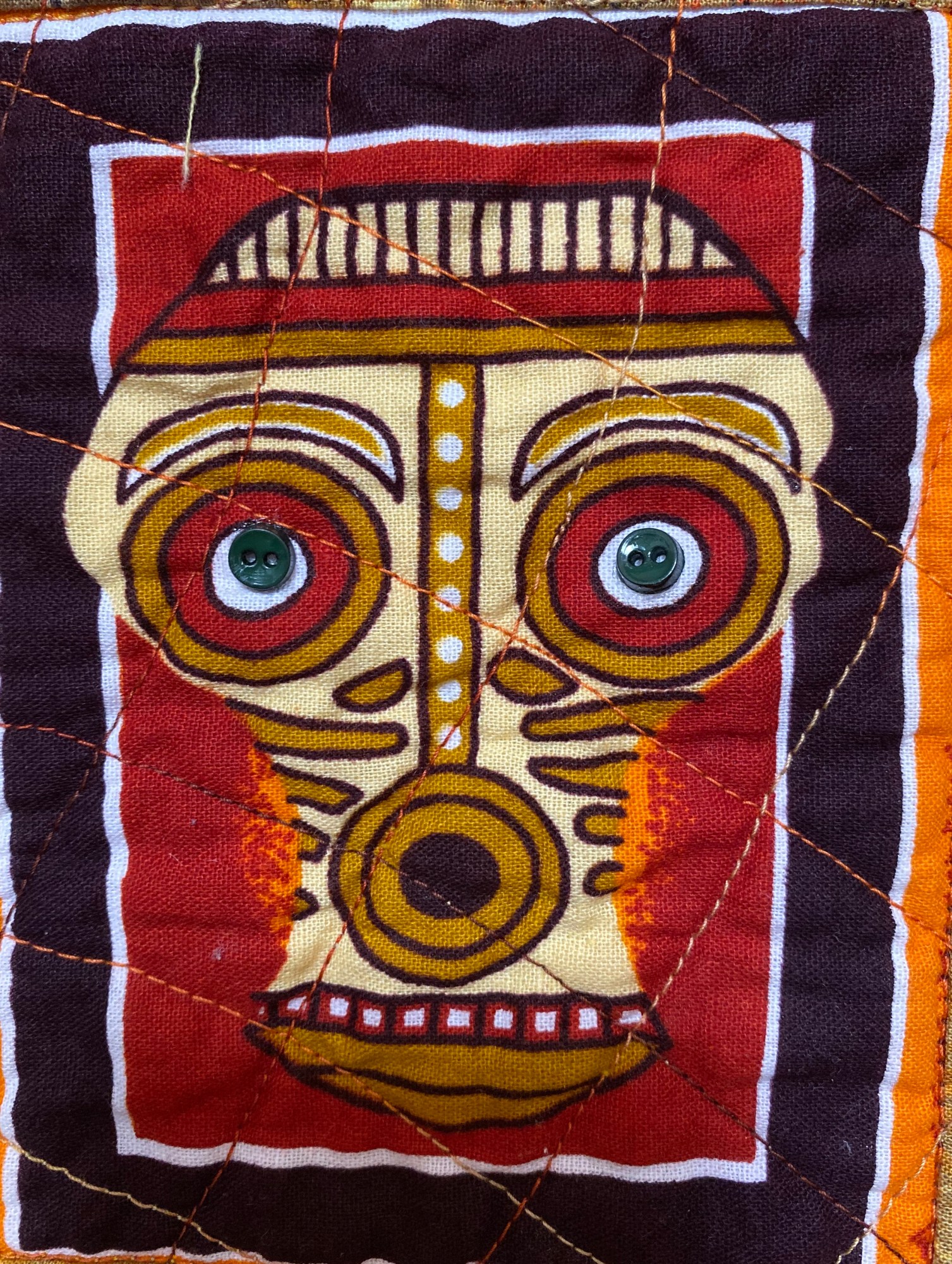 The back of the quilt is an African brown and orange geometric print. The same print is used for the binding. A label documents the quilt, and I signed it on the front. This quilt is one-of-a-kind.