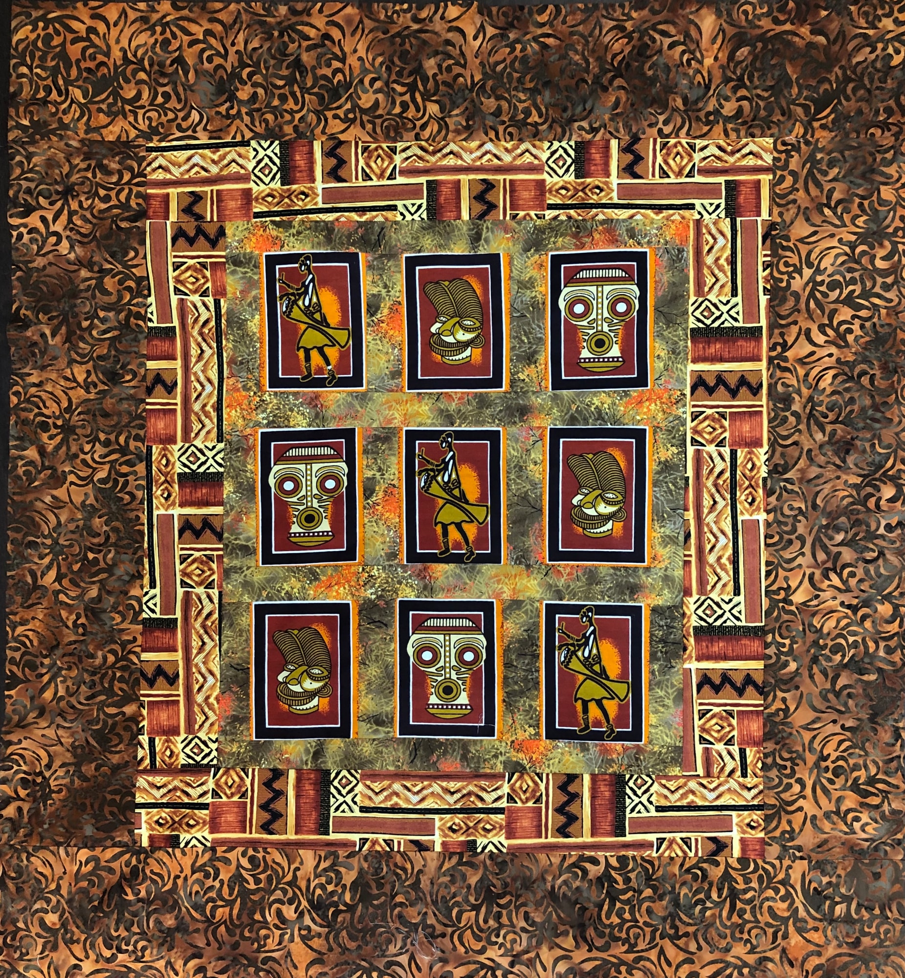 “How Do I Look?” is a quilted wallhanging that features 9 panel mask blocks. The quilt measures 34x37 inches. The dominant colors are brown and gold.