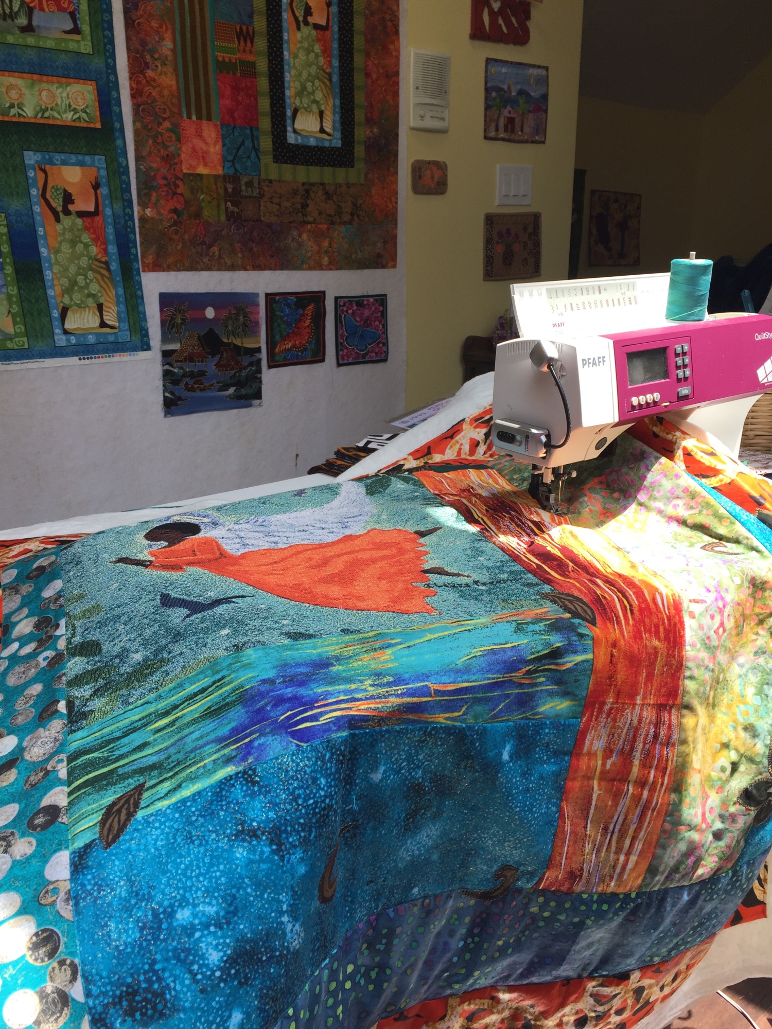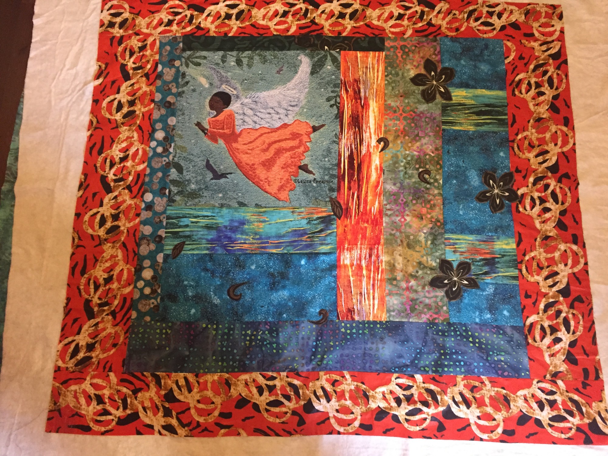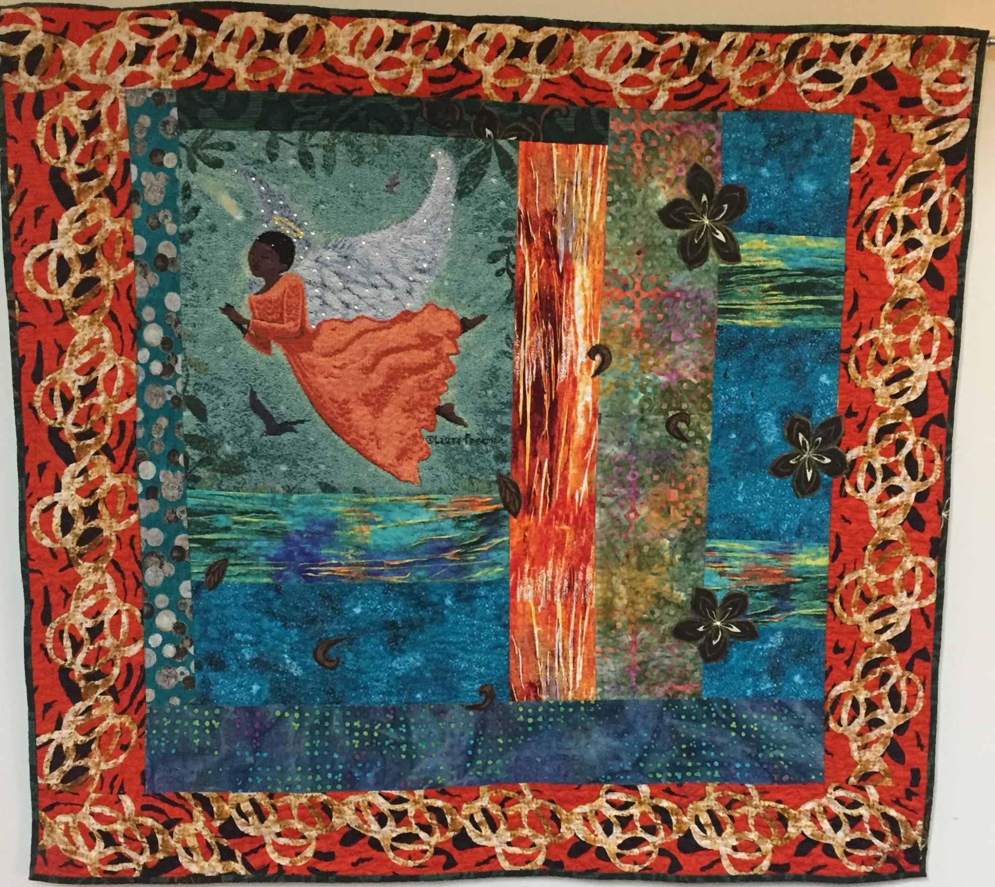"I Believe in Beautiful Angels" measures 48x43 inches. It is hand quilted, machine appliquéd and embellished with crystals.