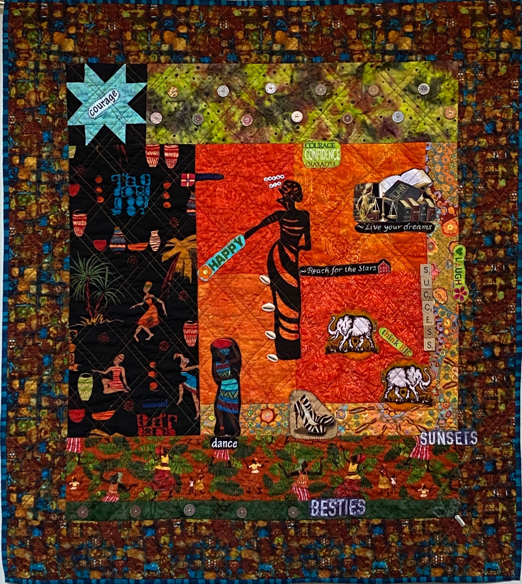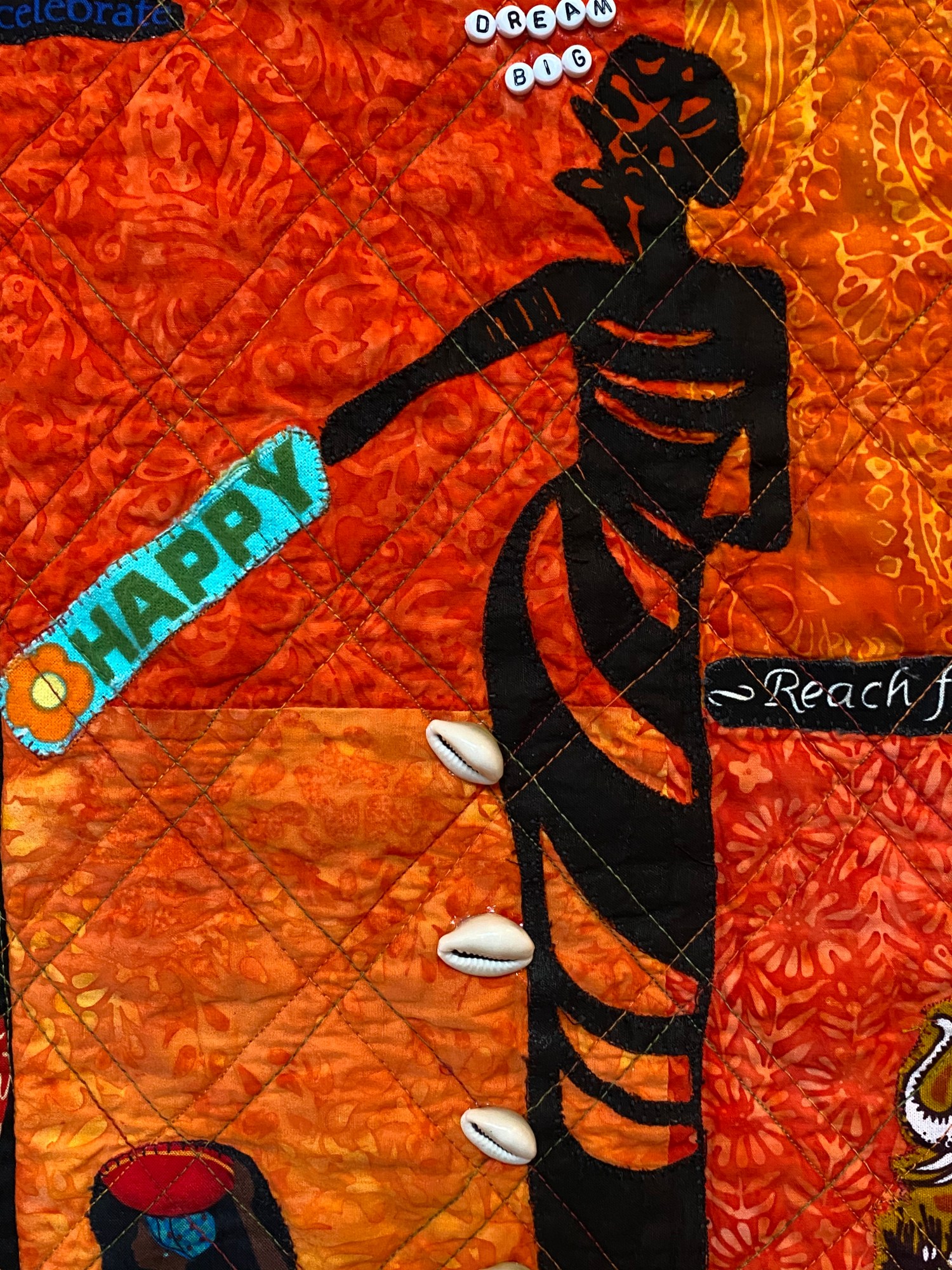 The quilt is pieced and quilted by me on my Janome sewing machine. It is embellished with words, buttons, cowrie shells, scrabble tiles and words.