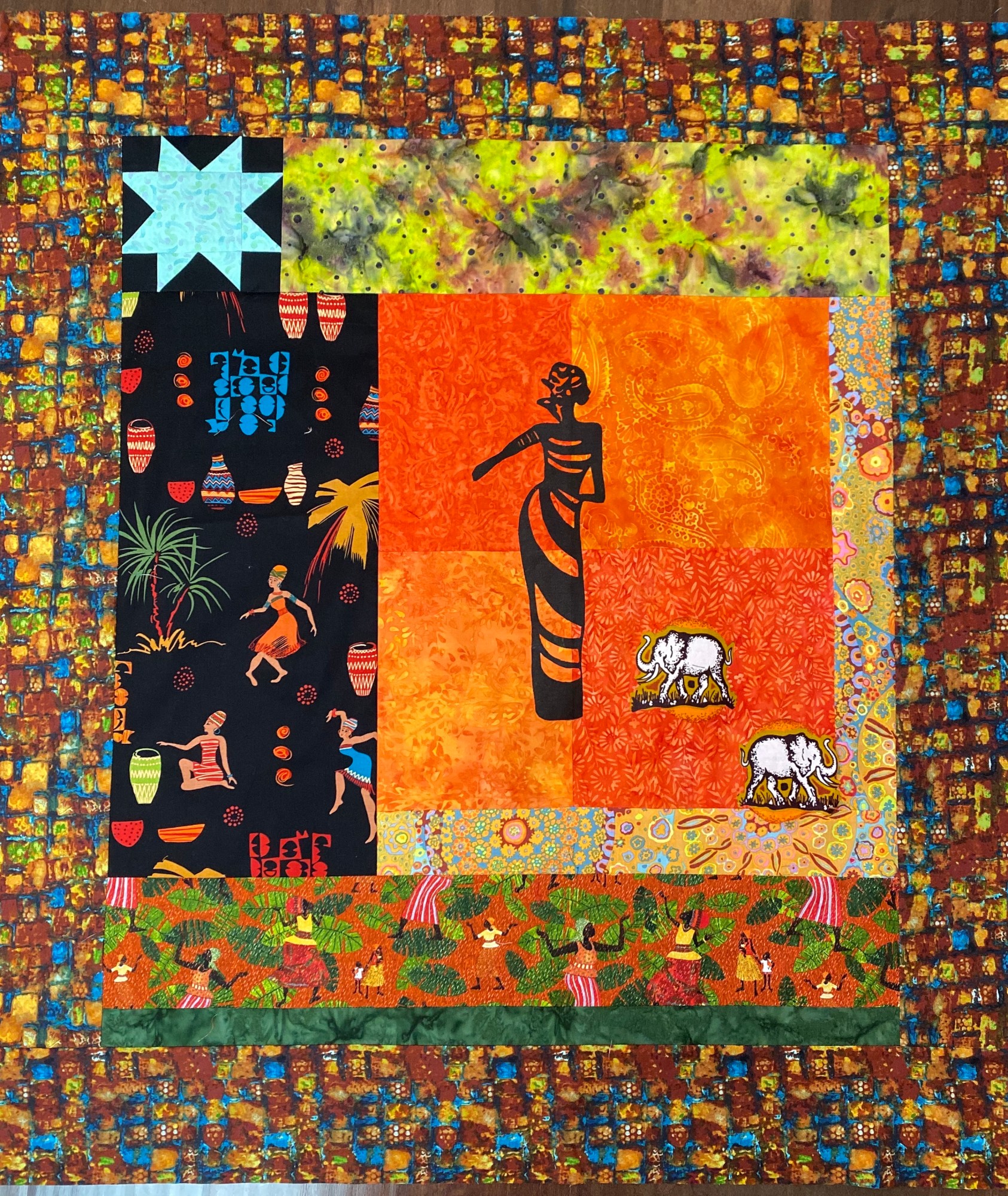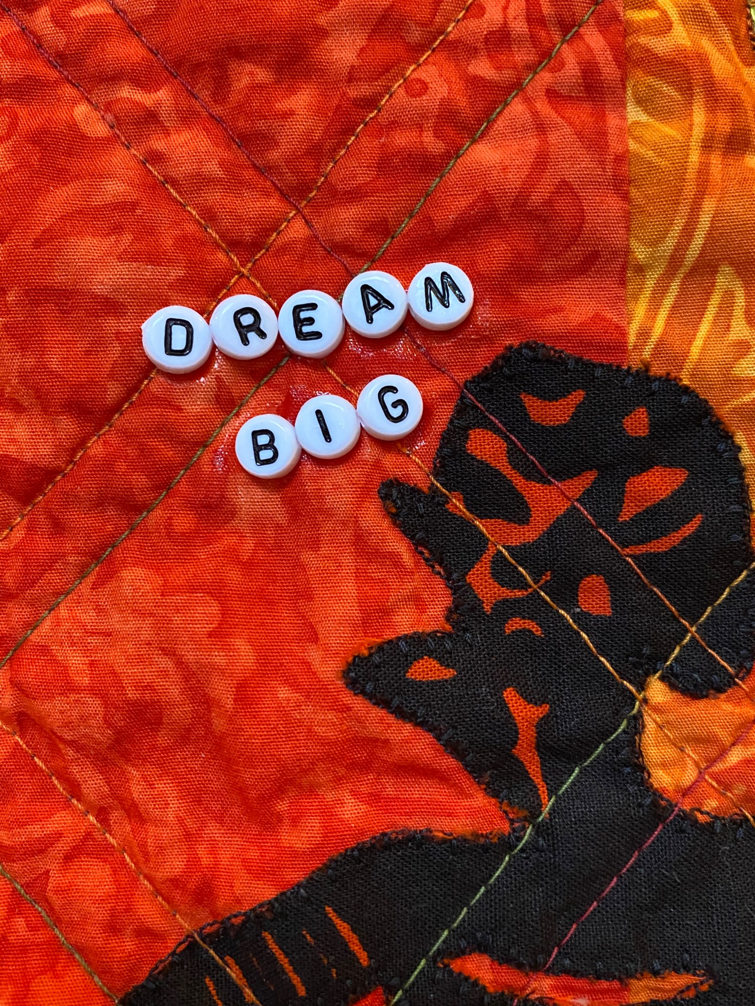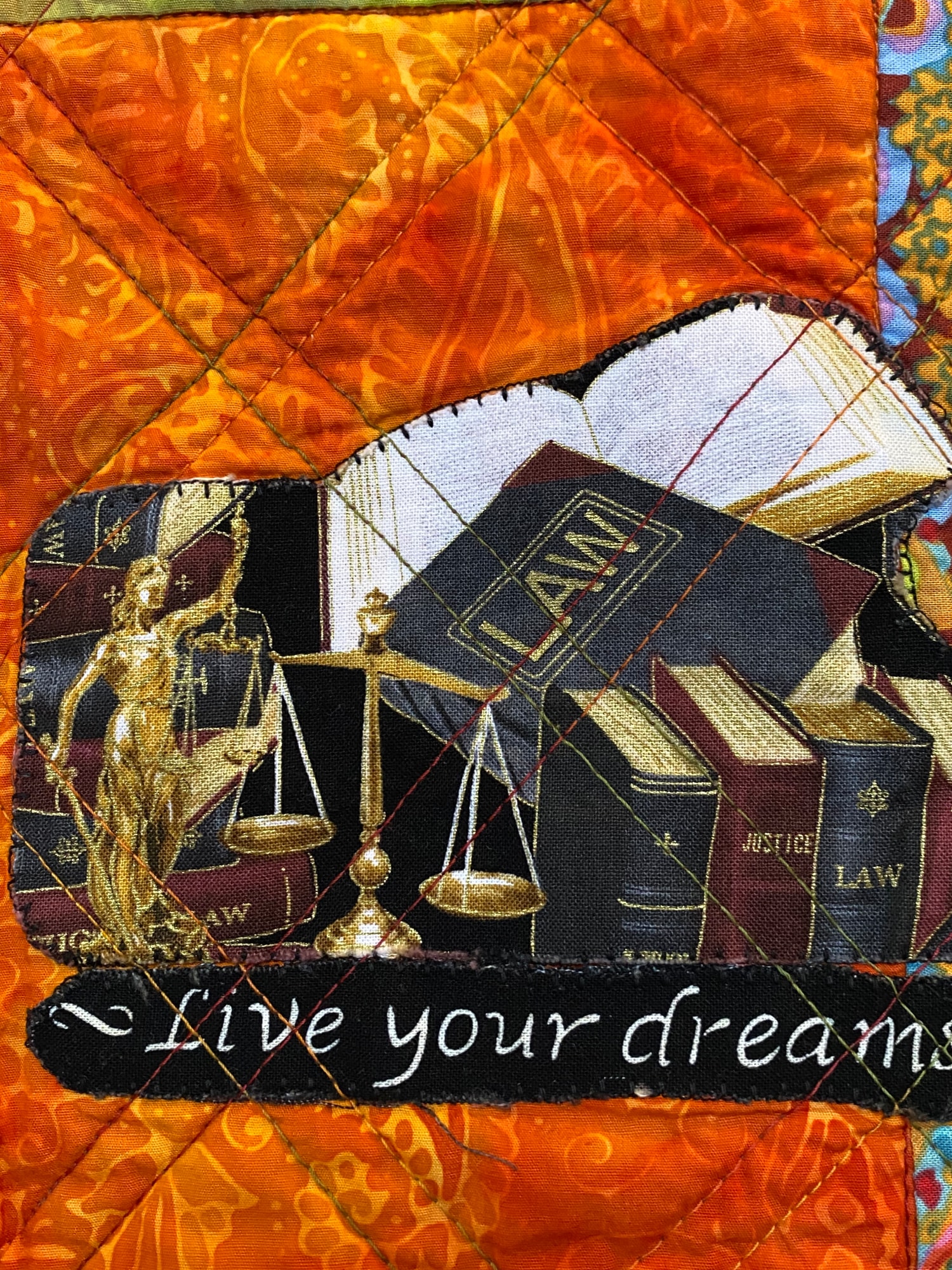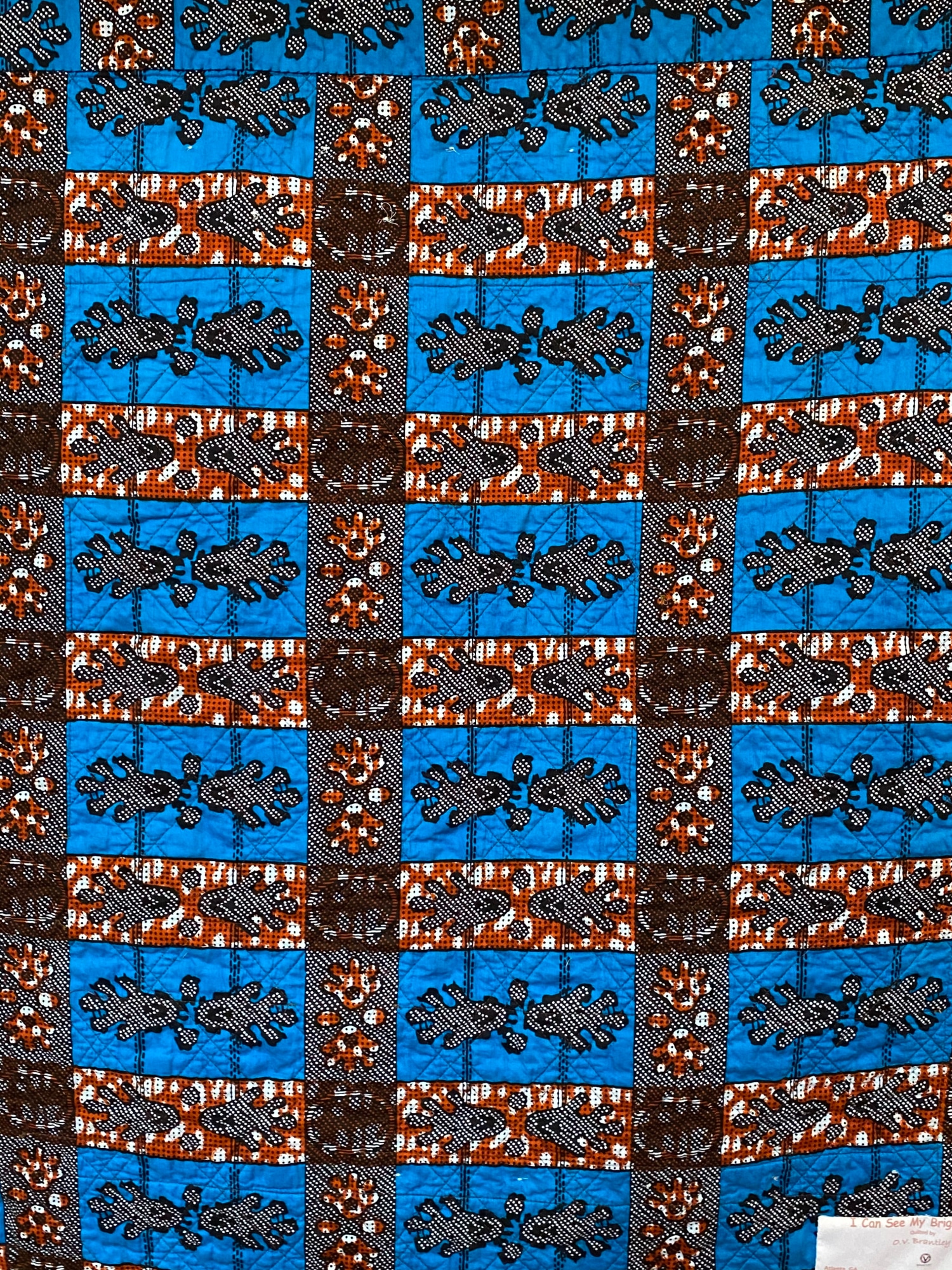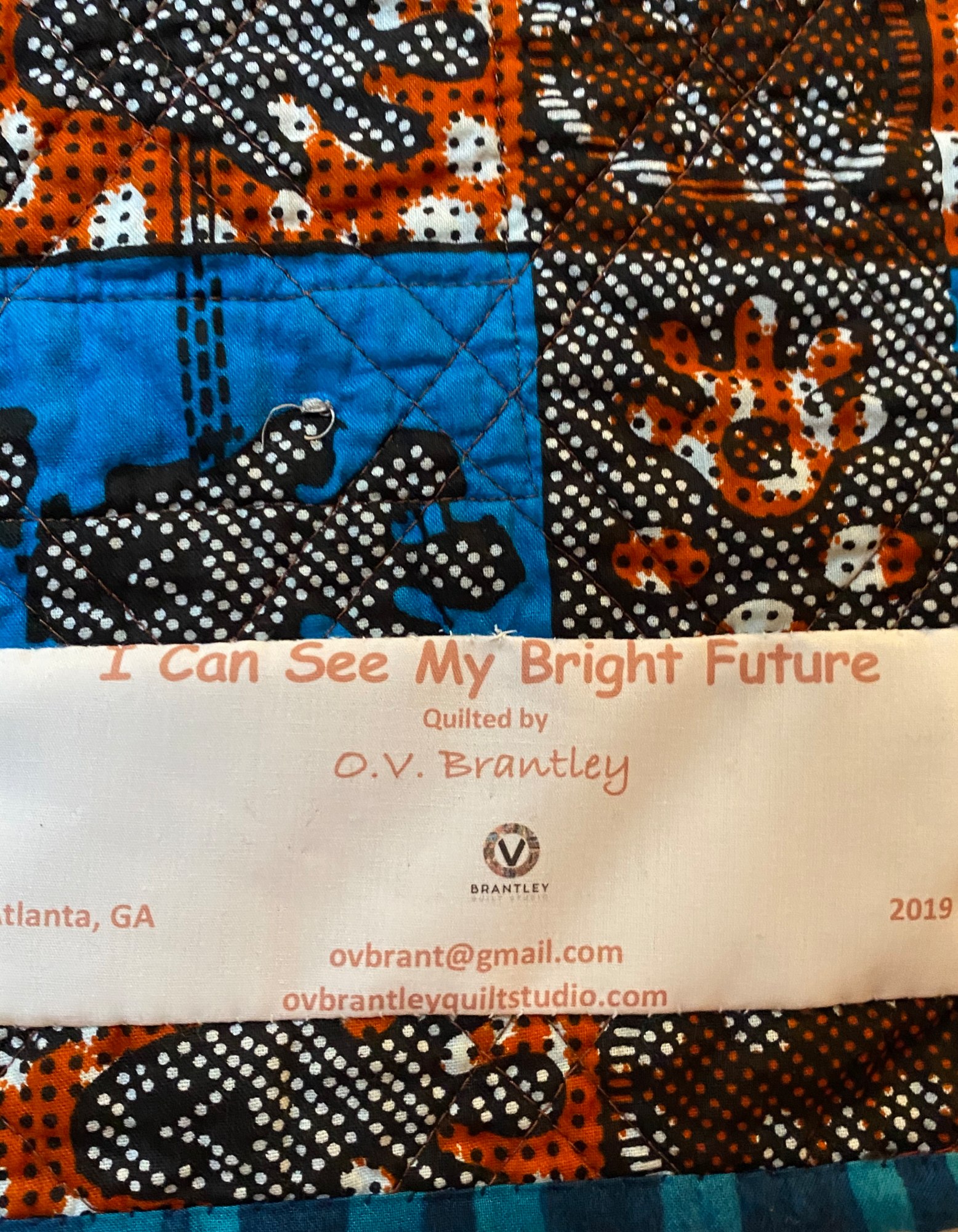 The back of the quilt is a blue and brown African fabric. There is a hanging sleeve on the back for easy display, and a label that documents the quilt. I signed it near the “dream” charm although it is hard to see.