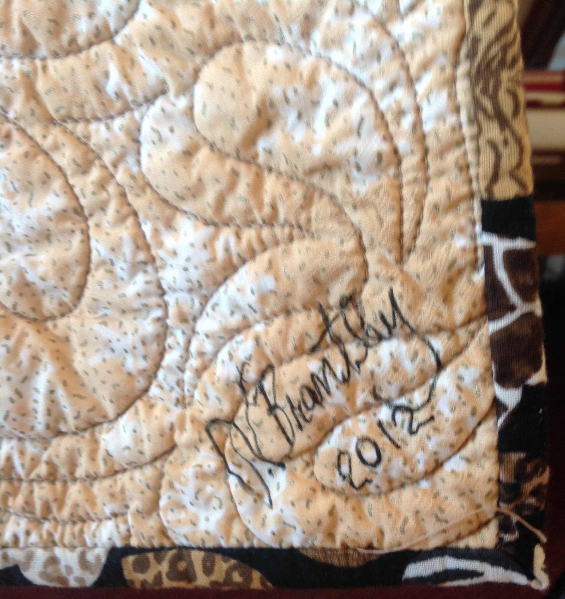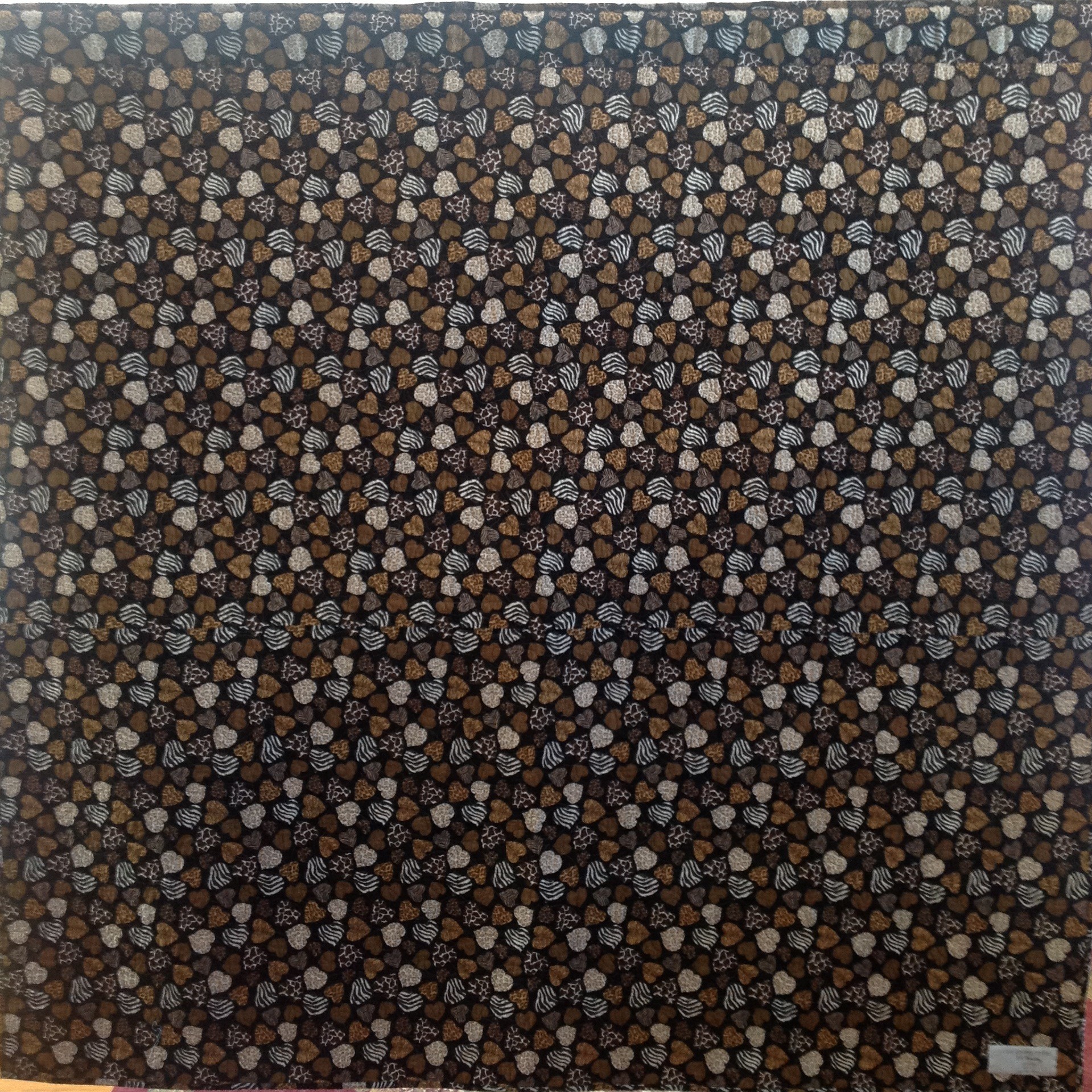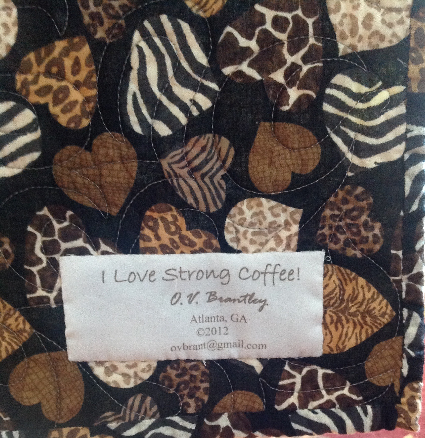 The back of the quilt is a heart print of black and brown animal prints. There is a hanging sleeve on the back for easy display. A label documents the quilts. I signed it on the front.