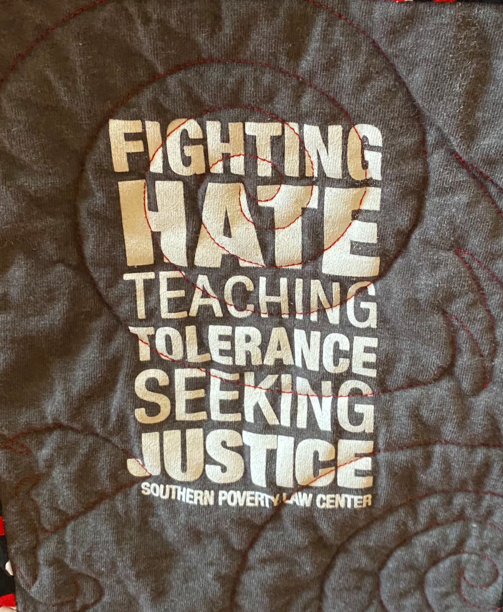 I began the quilt with a Vanderbilt University t-shirt because that is where I went to law school. I ended the quilt with a t-shirt from the Southern Poverty Law Center, my latest temporary post retirement job.