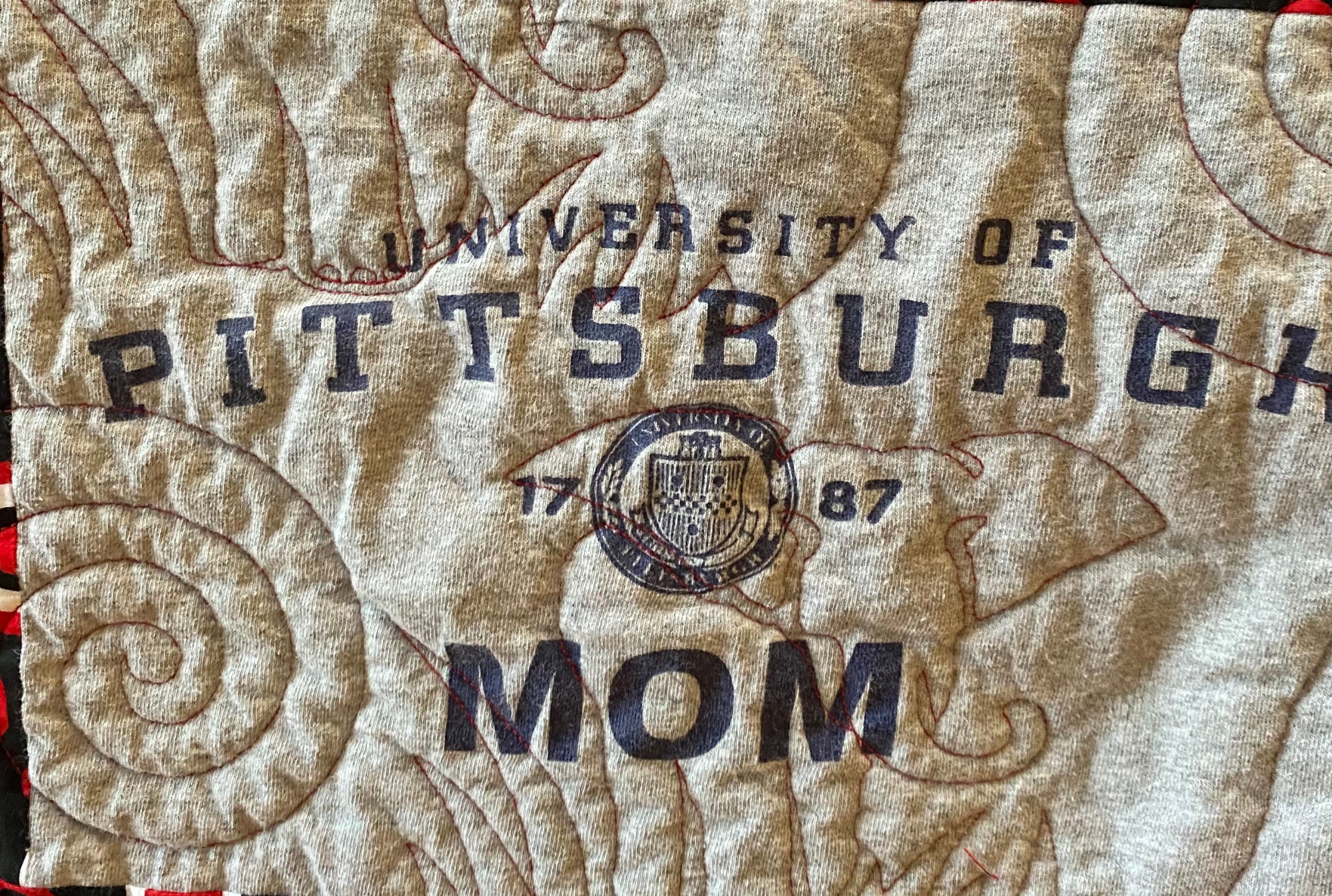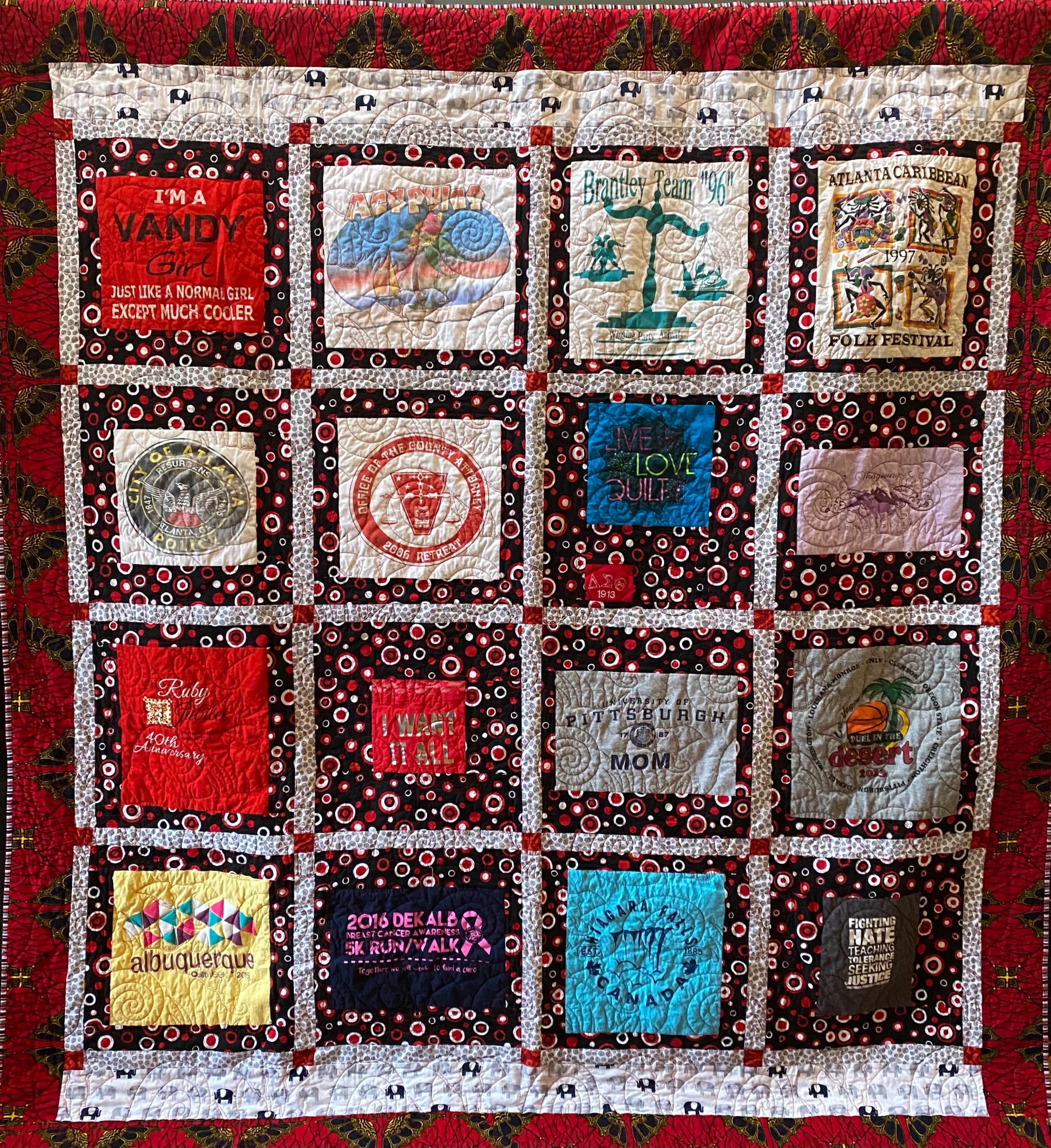 I like including African fabrics in my quilts if the design allows it, so I framed the t-shirts with a red African border. There is also some African fabric in the pieced back of the quilt.