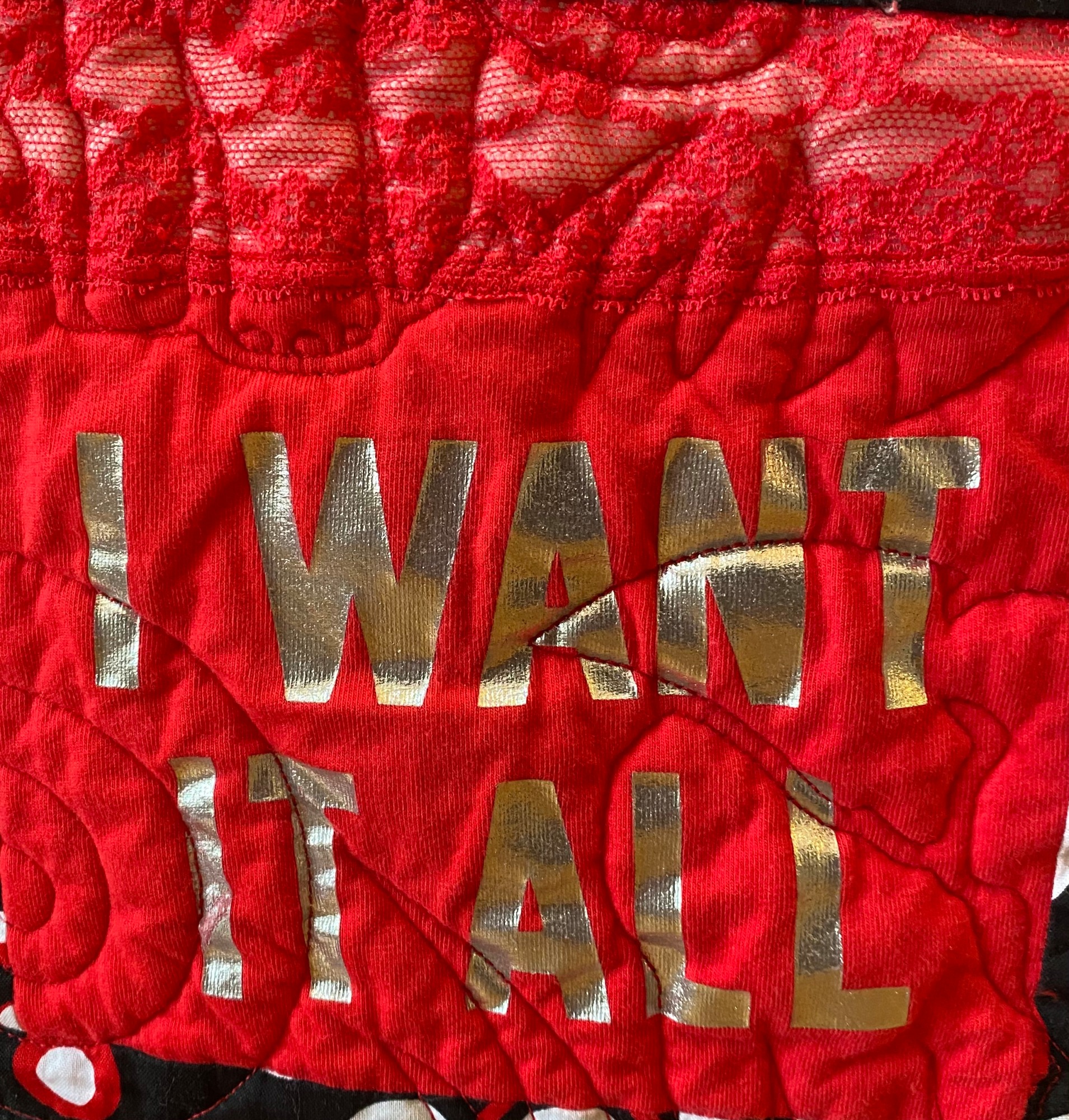 A fun fact about this quilt — the center block that says “I Want It All” is from a pair of Victoria Secret panties!!😍
