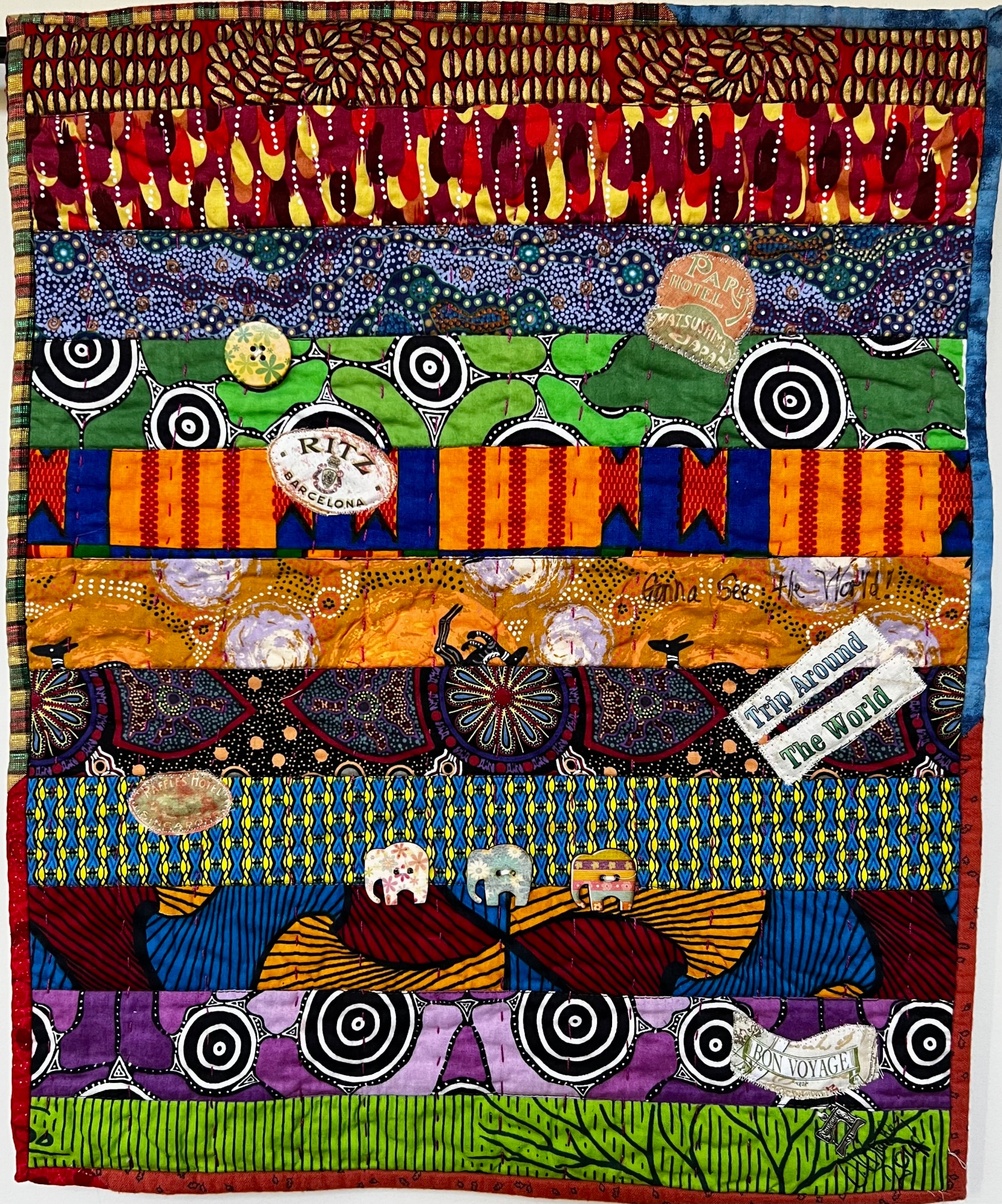 The quilt is embellished with charms, buttons and words and quilted in a big stitch using purple Perle cotton.