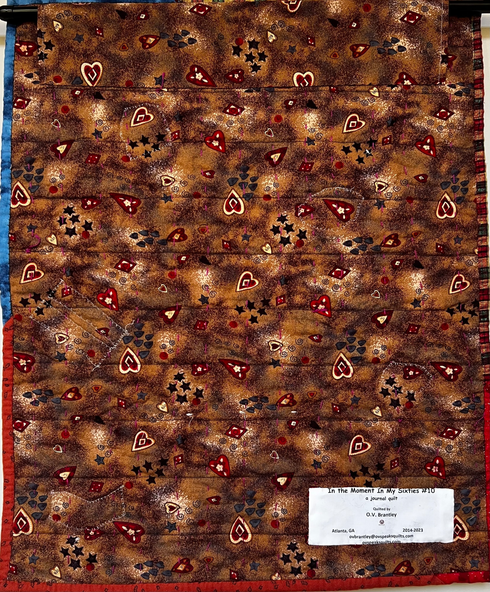 The back of the quilt is brown fabric with red hearts fabric. There is a hanging sleeve on the back for easy display and a label that documents the quilt.