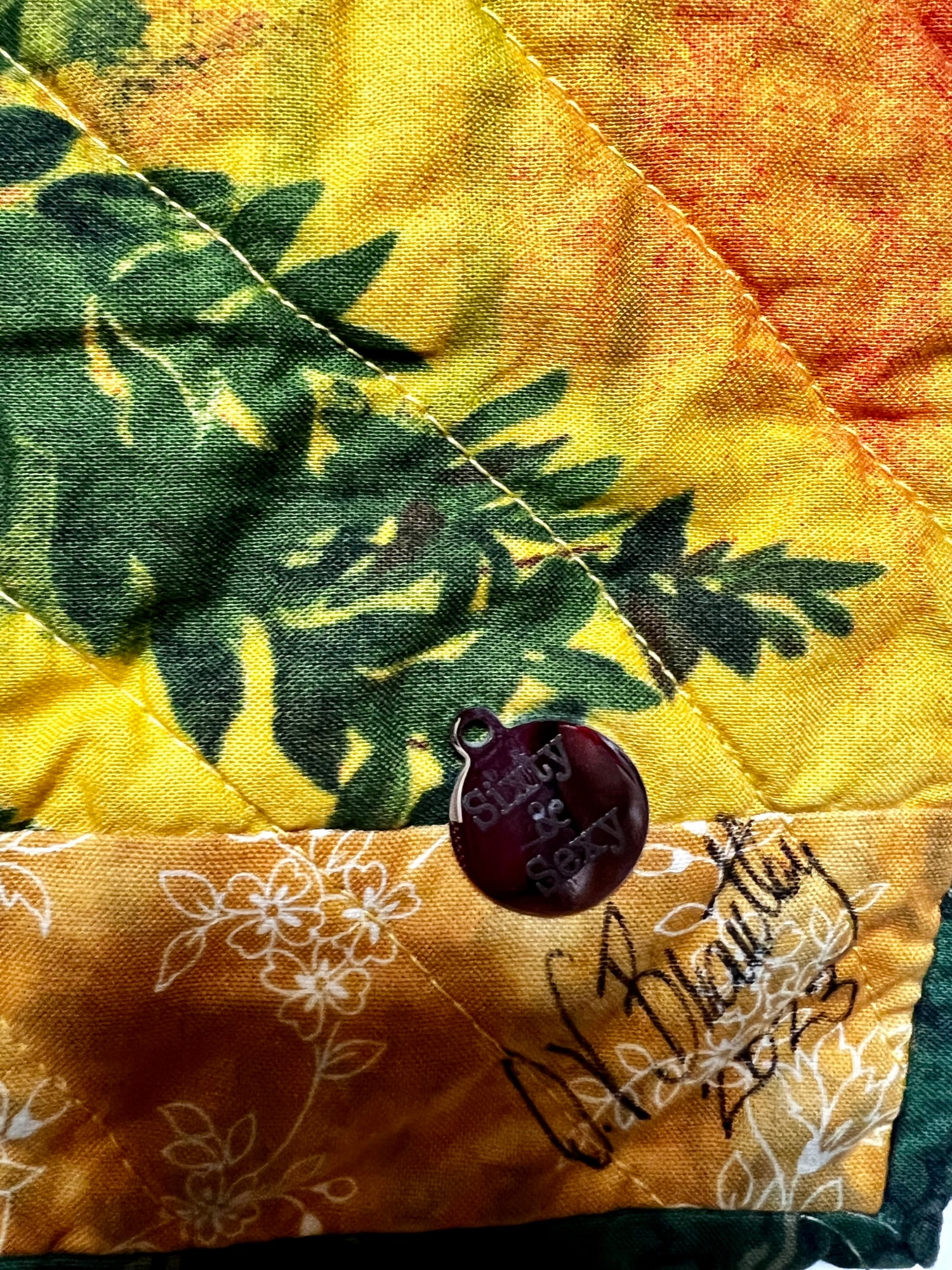 I signed it on the front and added a charm that says “Sexy and Sixty.” Visit my “In the Moment in My Sixties” gallery on my web site to see all of my journal quilts.