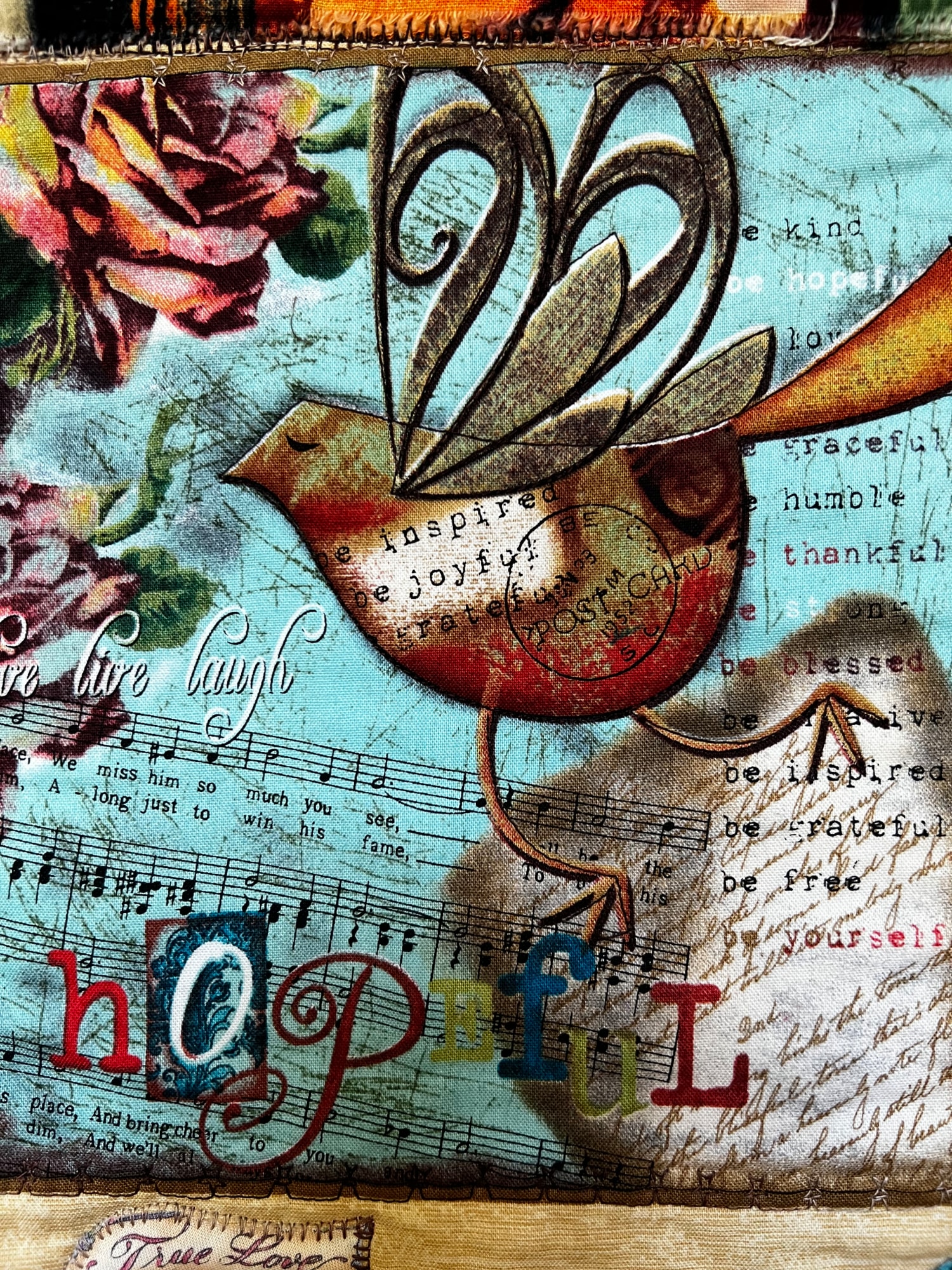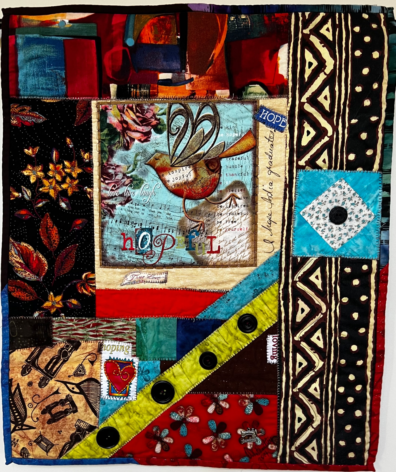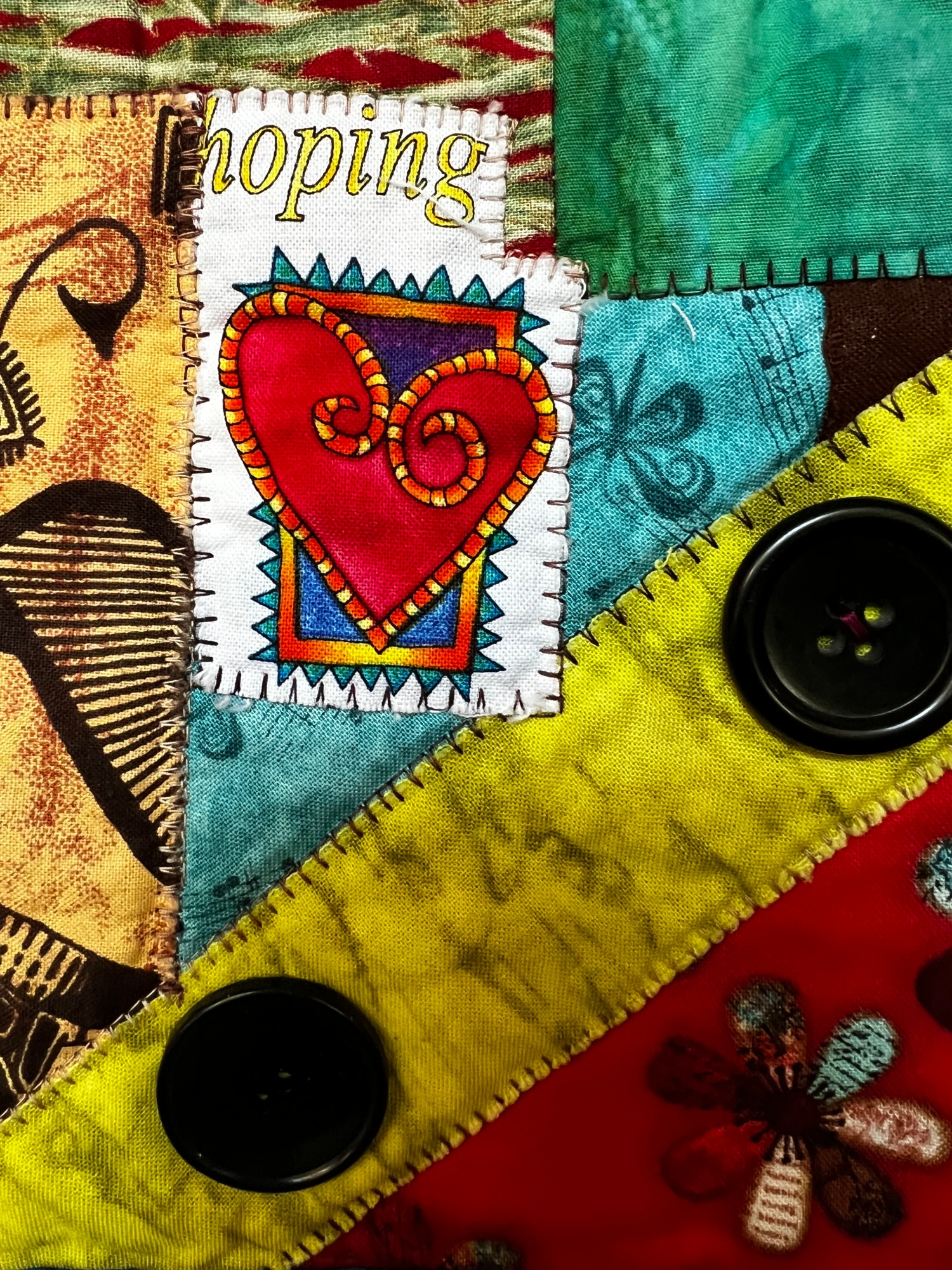 In 2014 when I turned 60 on January 1st, I had the bright idea that I would do a journal quilt once a week. I made it through 10 weeks and then dropped the project. Now that I am in the last year of my 60’s, I am determined to complete the project or at least add to it. I named the series “In the Moment in My Sixties”. Each quilt represents what was on my mind the day I made it.