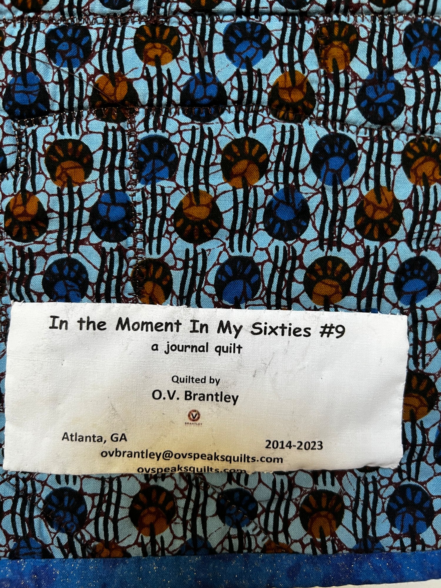 The back of the quilt is a blue African print. There is a hanging sleeve on the back for easy display and a label that documents the quilt.