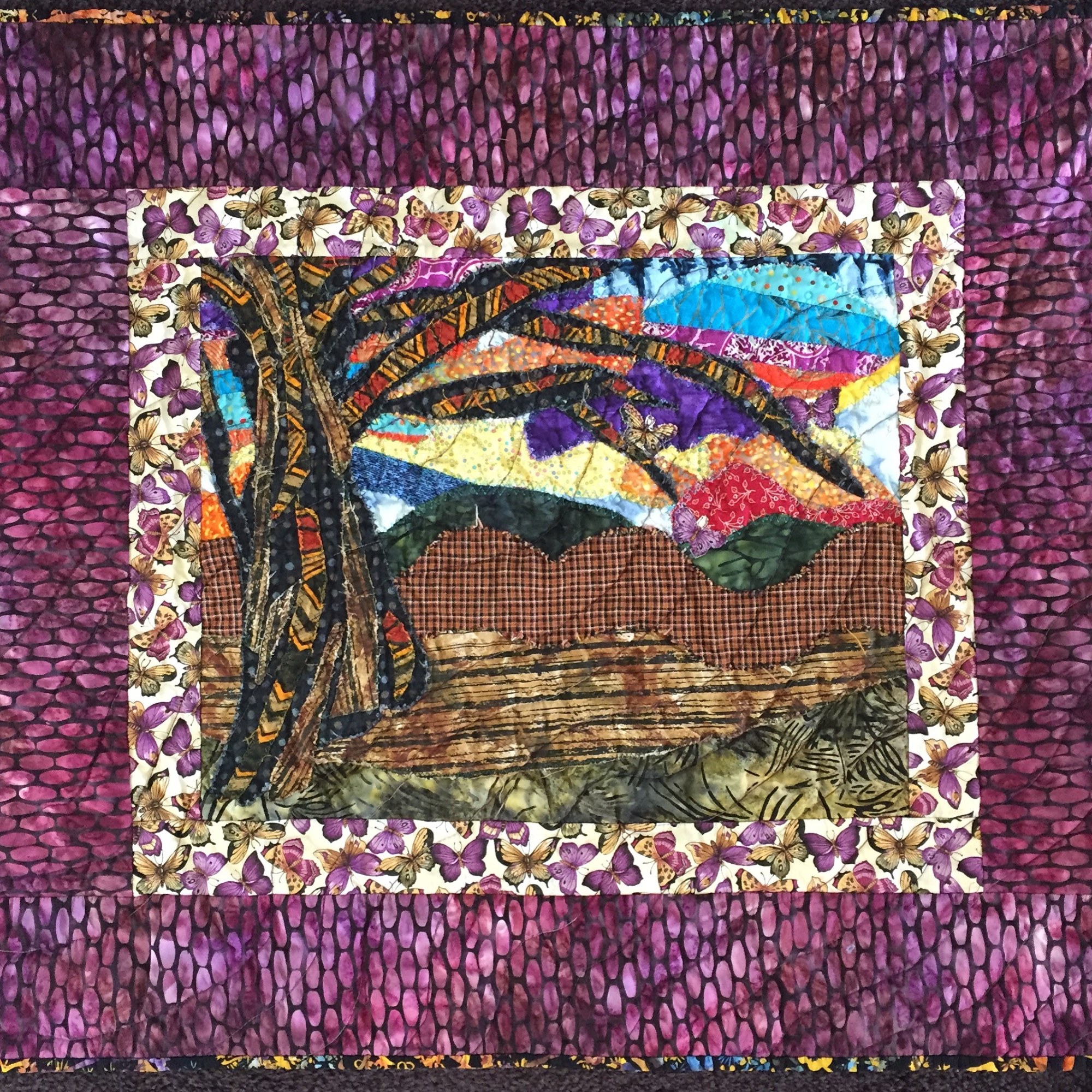 "Joyful Butterflies" is an original landscape art quilt that measures 29x32 inches. The dominant color is purple. The Applique is raw edged to give the piece texture.