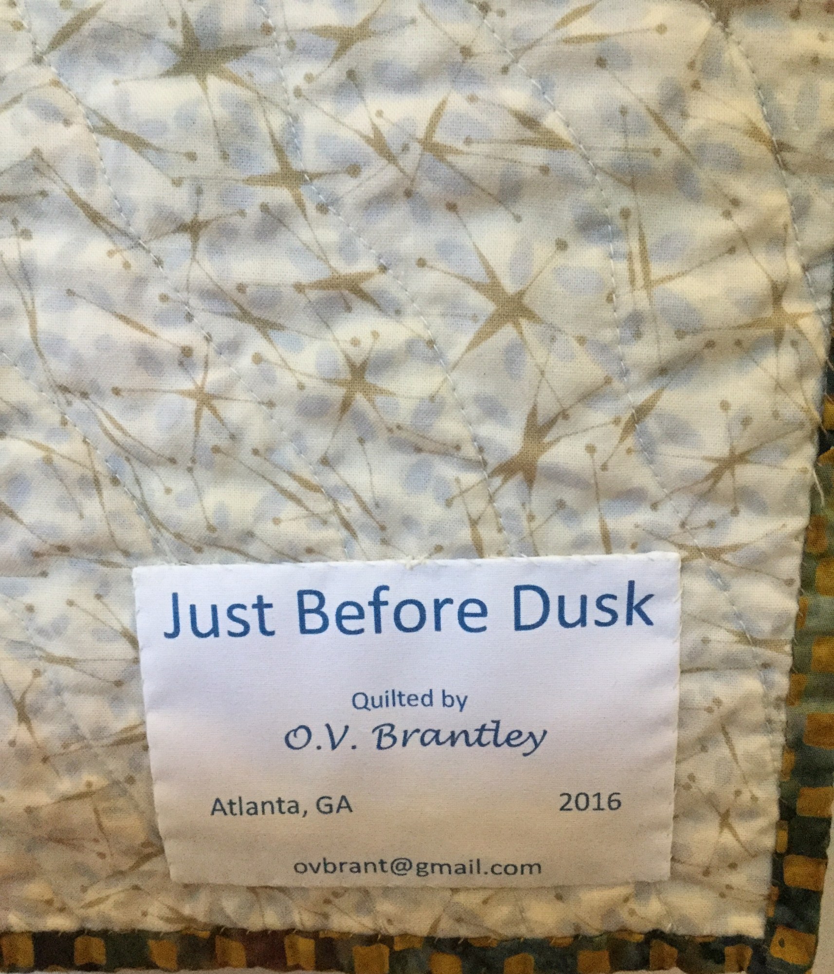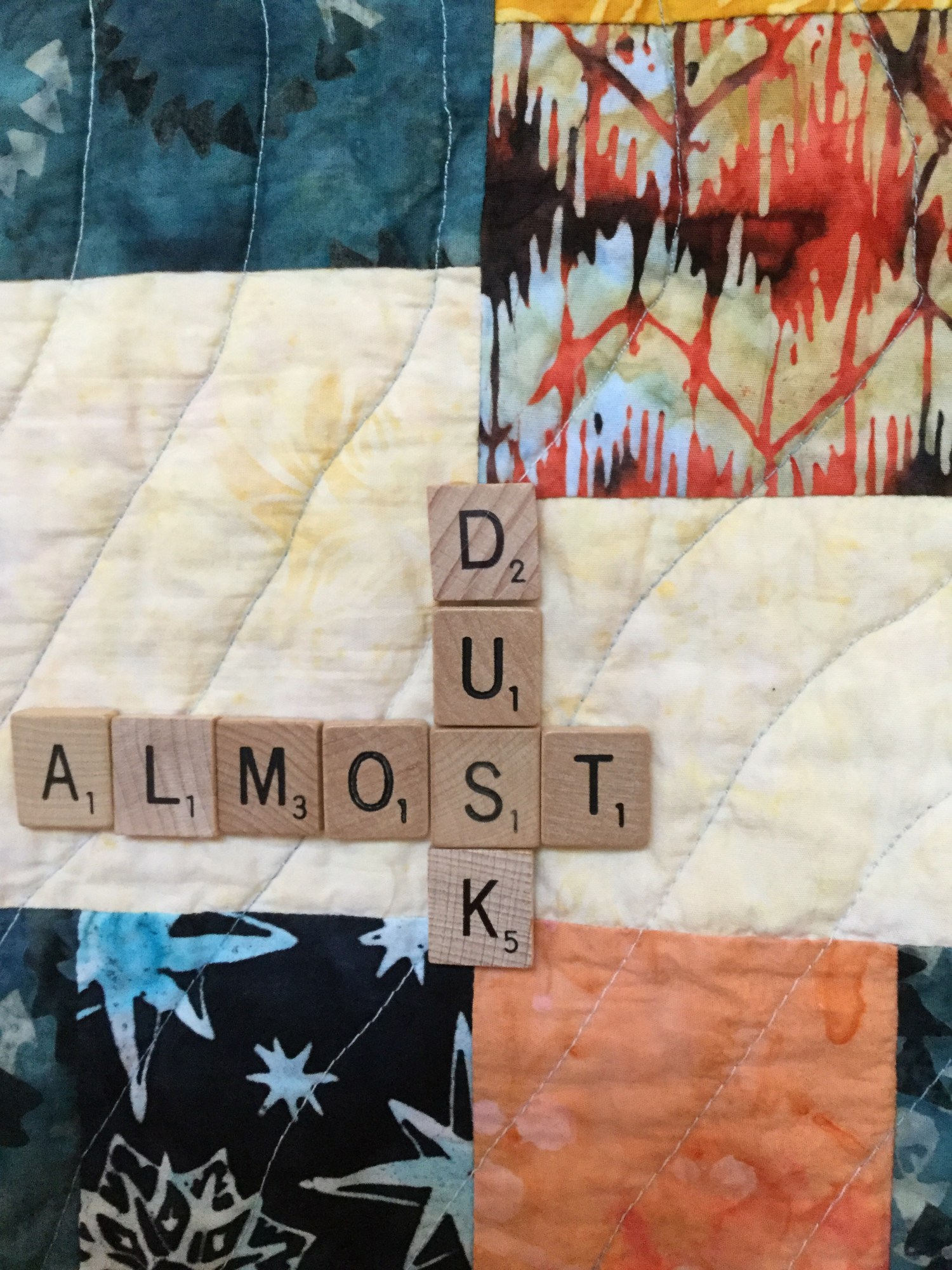 "Just Before Dusk" is a quilted wallhanging that evokes the feeling you get when you are watching the sun slowly fade while nightfall creeps in. The batiks in oranges and gold are muted and the navy is spiked with starbursts. I embellished the front of the quilt with hand crafted yo-yos and scrabble tiles that spell the words "almost dusk".