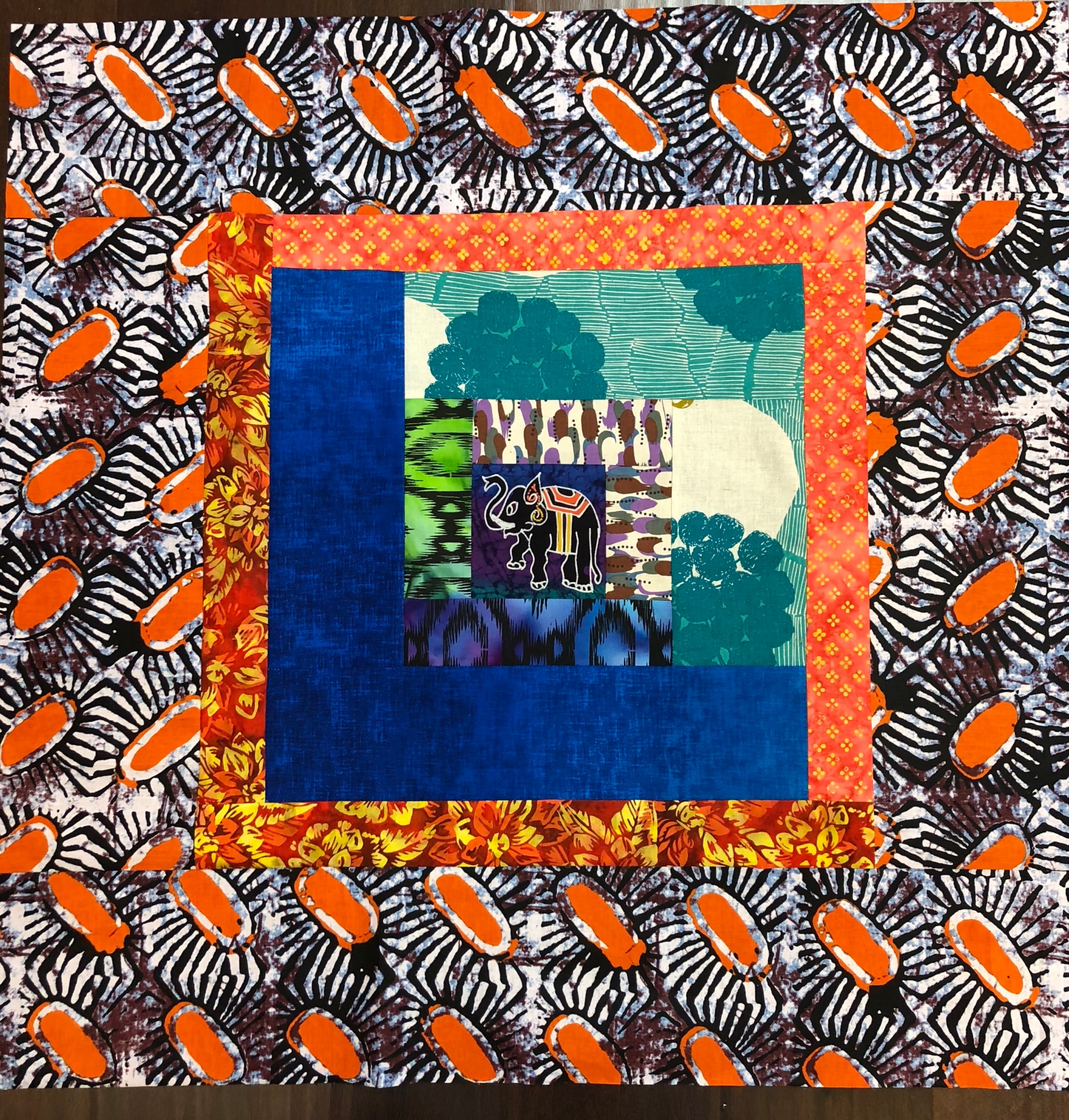 Each quilt is built around an eclectic log cabin block that starts with a batik elephant as its center. Each quilt has a distinctive border that may be African, a batik or just an interesting print.