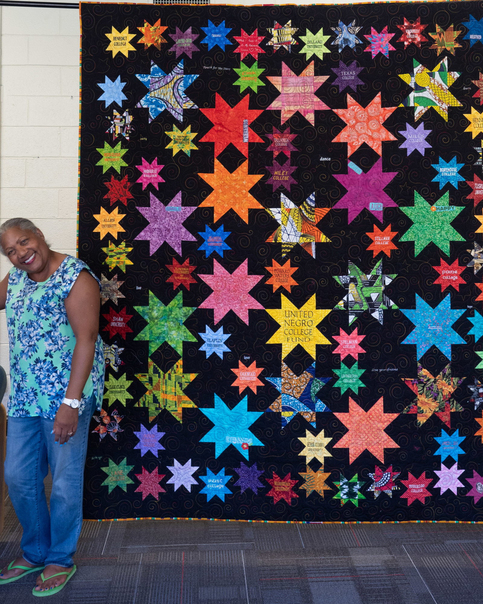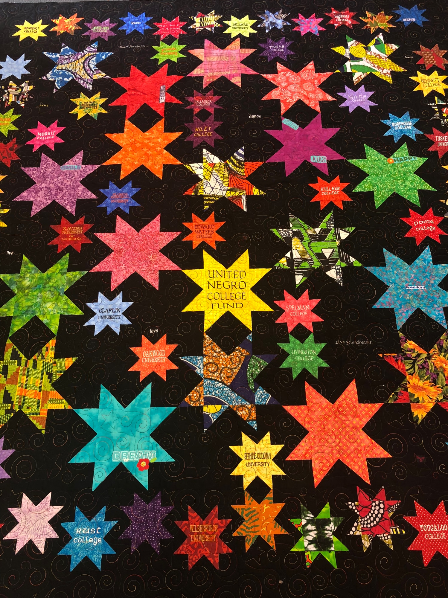 I immediately decided a star quilt on a black background was the most appropriate metaphor for the occasion. HBCU’s are known for not only turning out graduates, but graduates who go on to become stars in their chosen professions and communities. So each of the 37 schools and the UNCF have their names embroidered on a star. My friend Jackie Jackson-Harvey did the embroidery. Many of the remaining star blocks reflect some aspect of college life like books, beer, coffee, sports, etc.