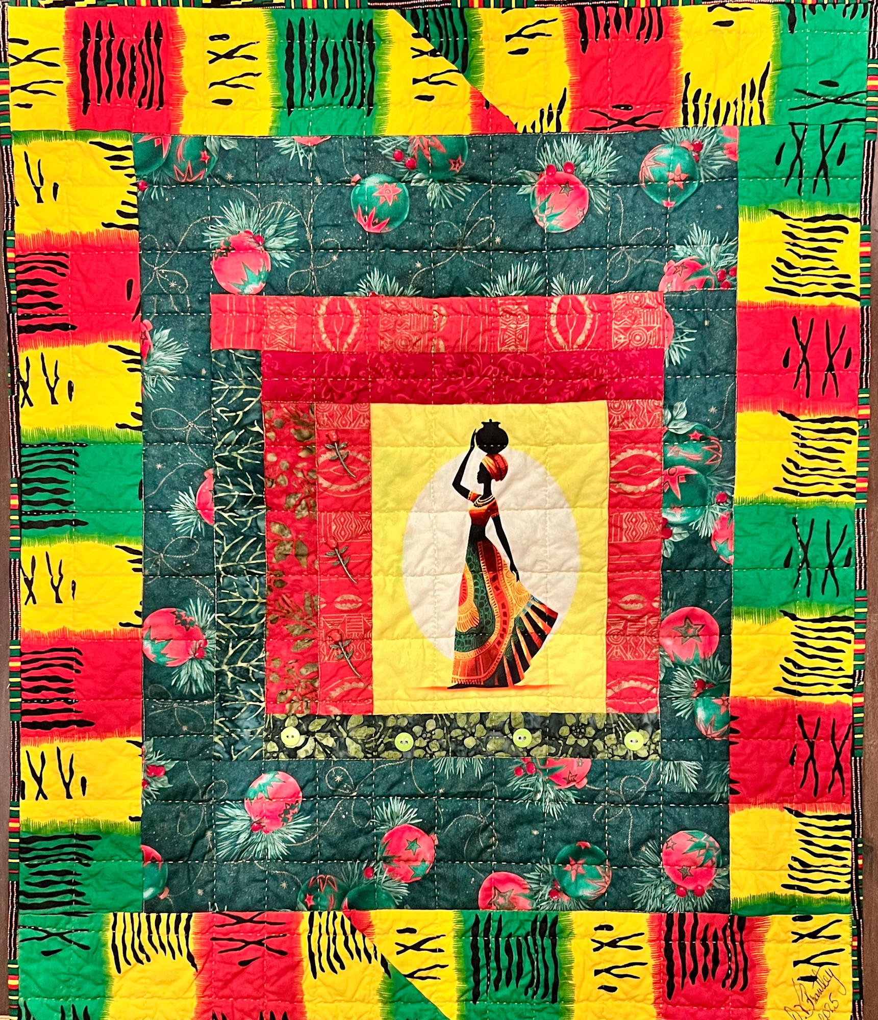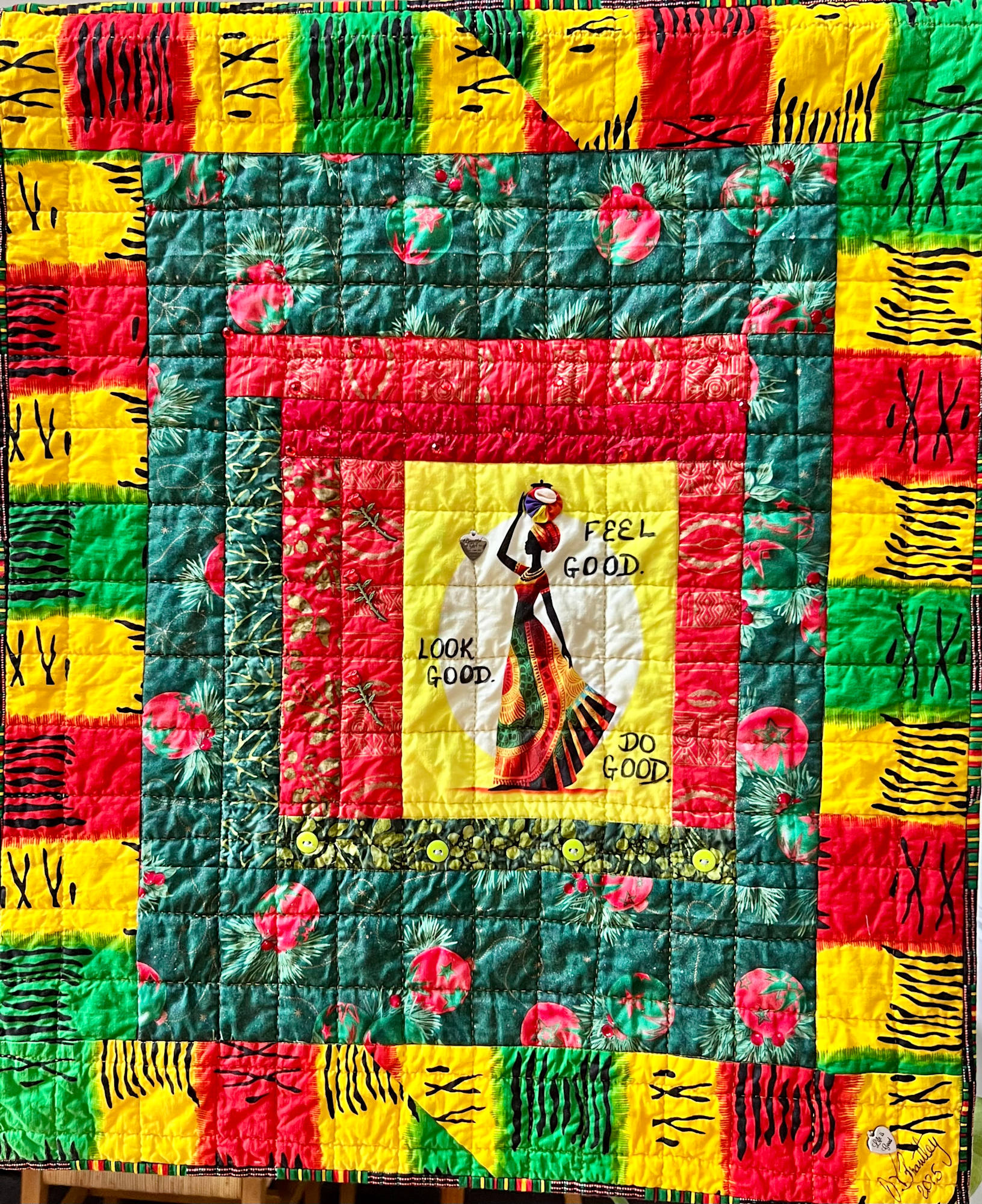 “Look Good. Feel Good. Do Good #1” measures 27 X 33 inches and is primarily red, yellow and green. I included a Christmas fabric in one of the borders because that is a time of the year when we tend to look our best. Otherwise, the quilt is mostly African.