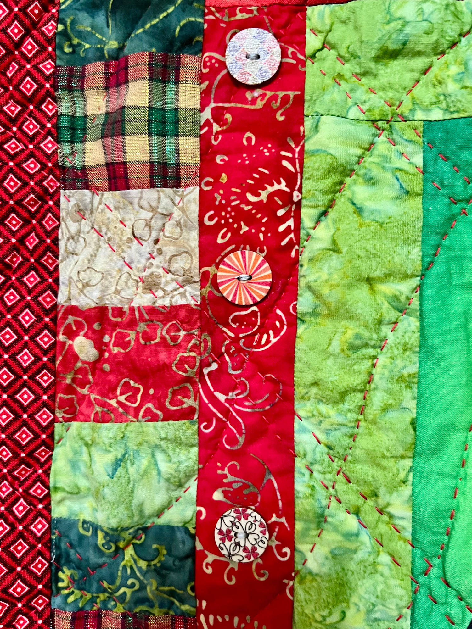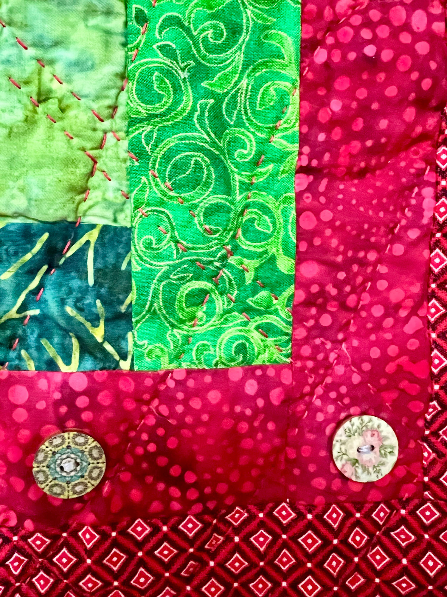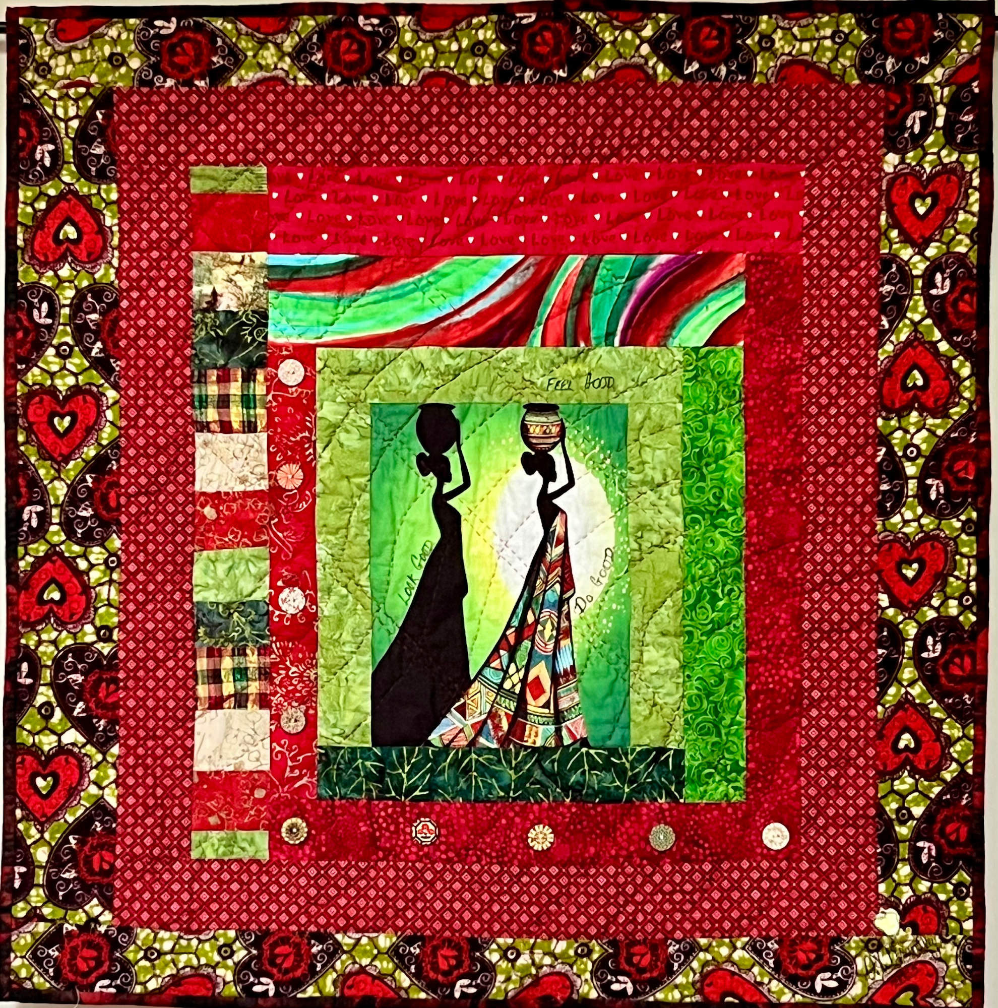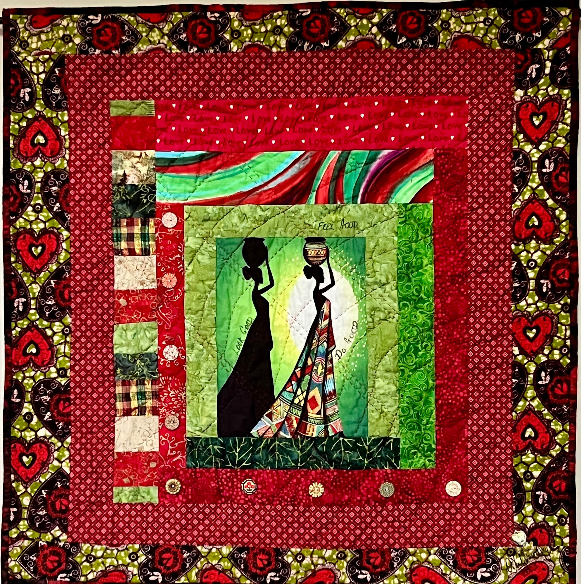 “Look Good. Feel Good. Do Good #3” measures 29 X 29 inches and is primarily red and green. It includes African and domestic fabrics. Most African fabrics feature large prints, but this quilt also includes red shweshwe shweshwe, South African fabric that features small prints.