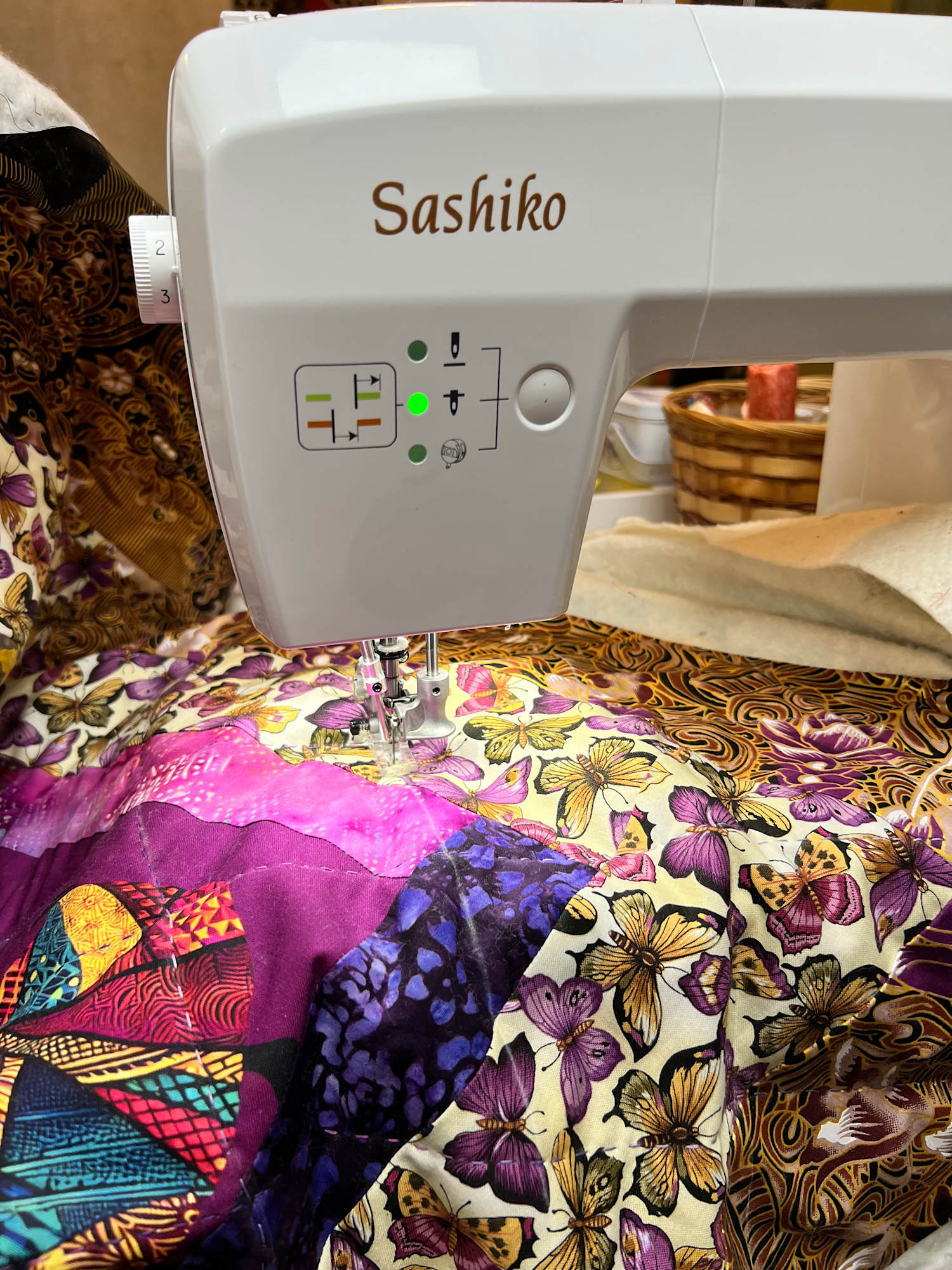 I quilted the quilt on my new Sashiko machine. It creates a stitch that mimics the look of hand quilting which I love. I quilted “Look Good. Feel Good. Do Good. #4 in a diagonal pattern in purple variegated thread. The big stitches become a design element.