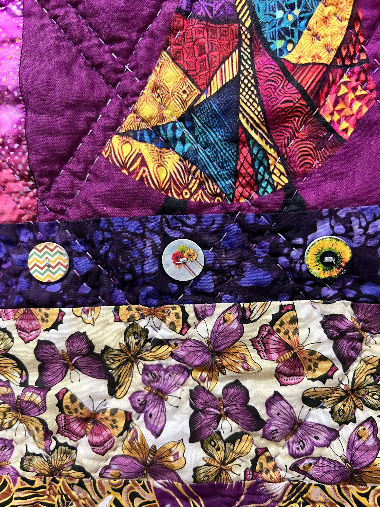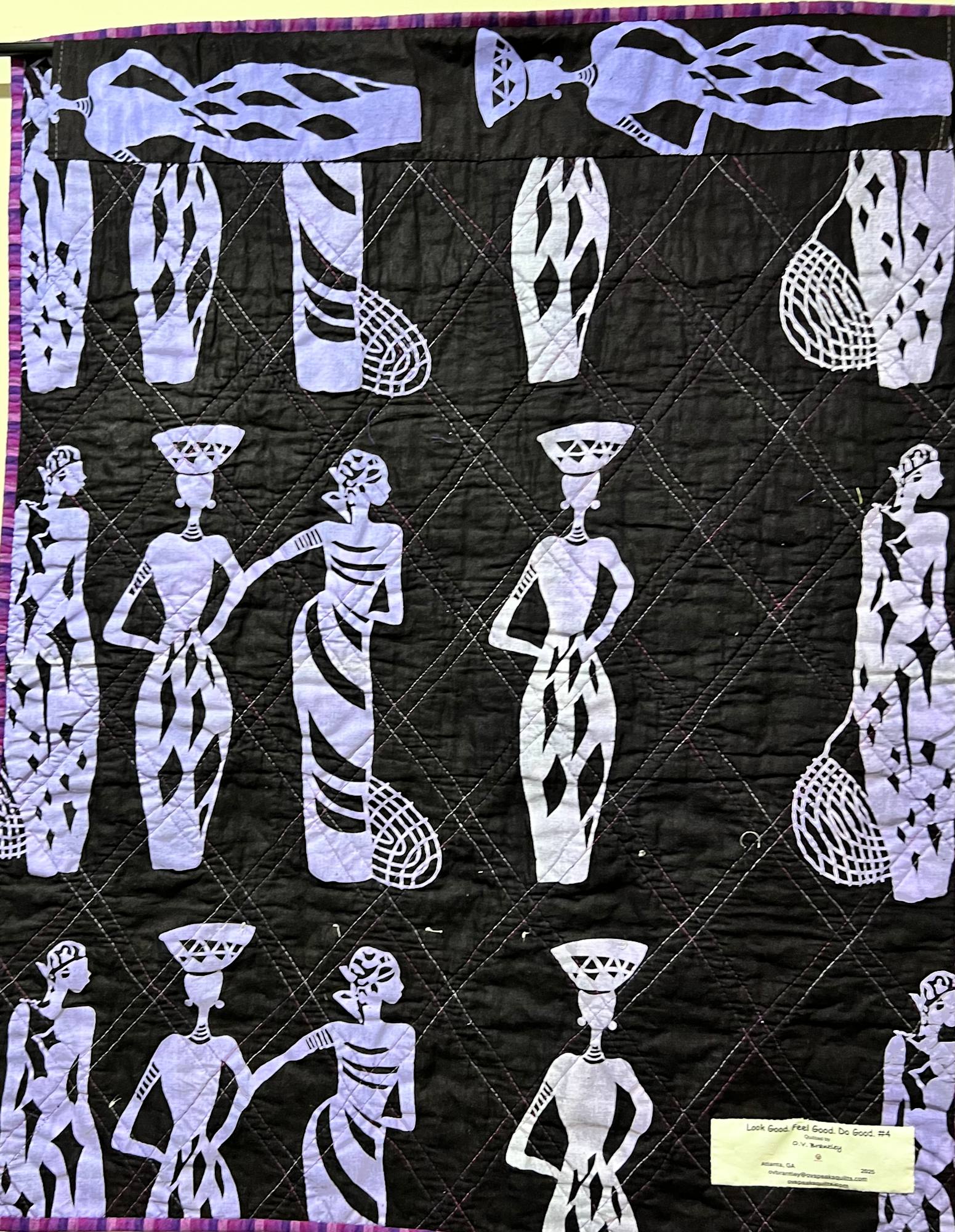 “Look Good. Feel Good. Do Good #4” measures 27 X 33 inches and is primarily purple and gold. It includes African and domestic fabrics. Most African fabrics feature large prints, but this quilt features a purple and gold brocade in the border.