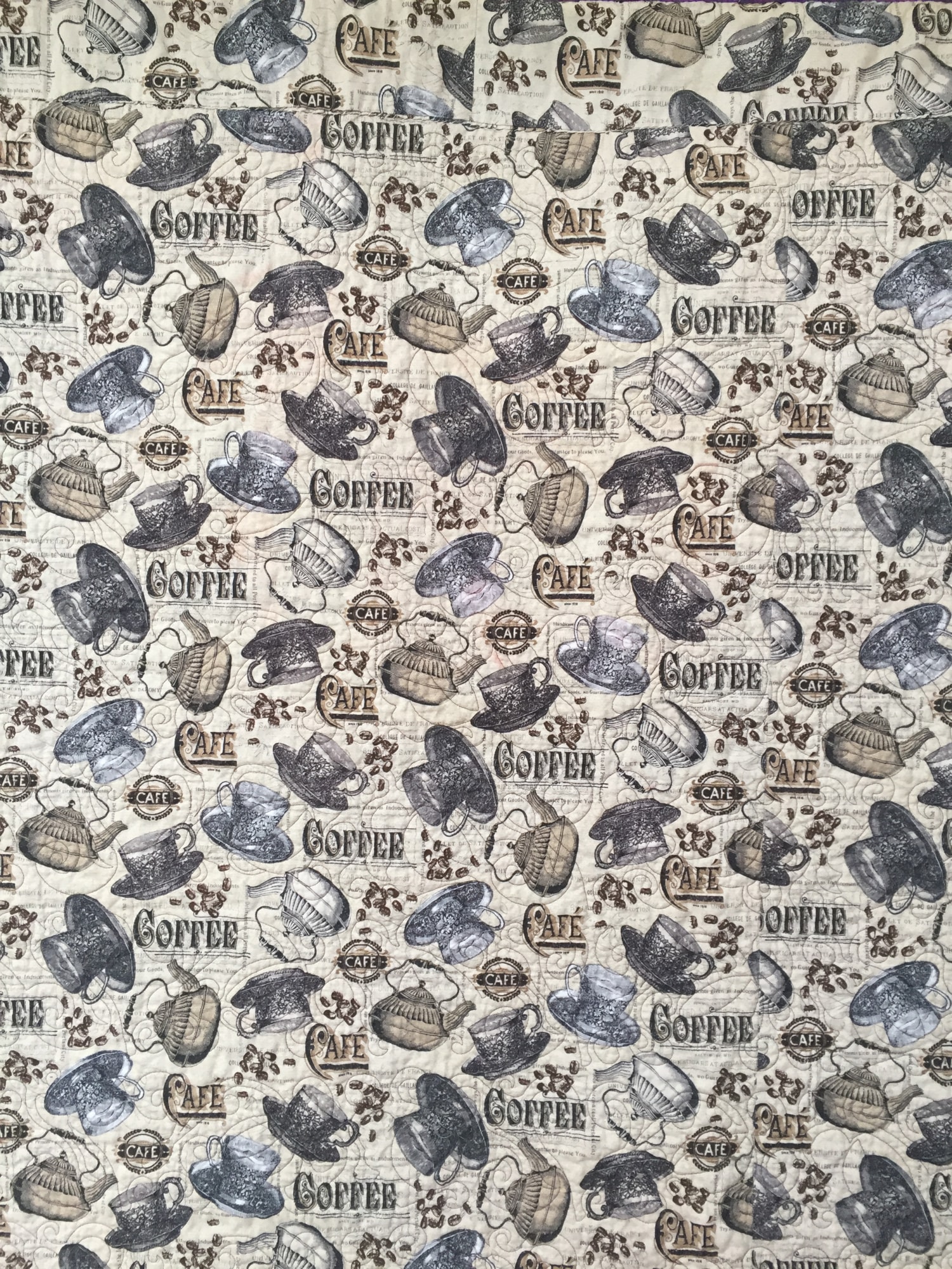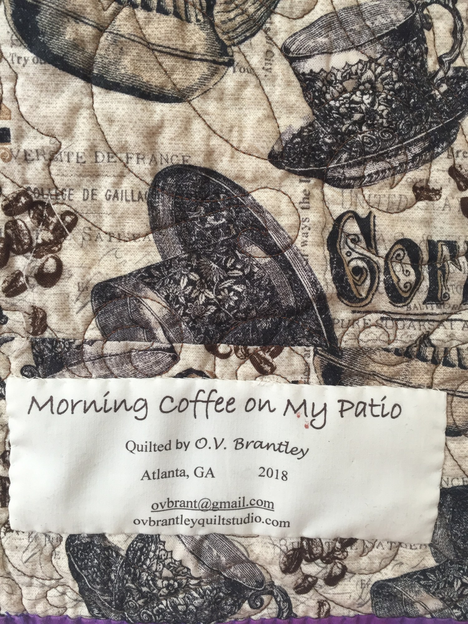 I pieced the quilt on my machine. It was quilted on a long arm in a pattern named coffee cup. The coffee cups are hard to see but they are there. There is a hanging sleeve on the back for easy display and a label that documents the quilt.