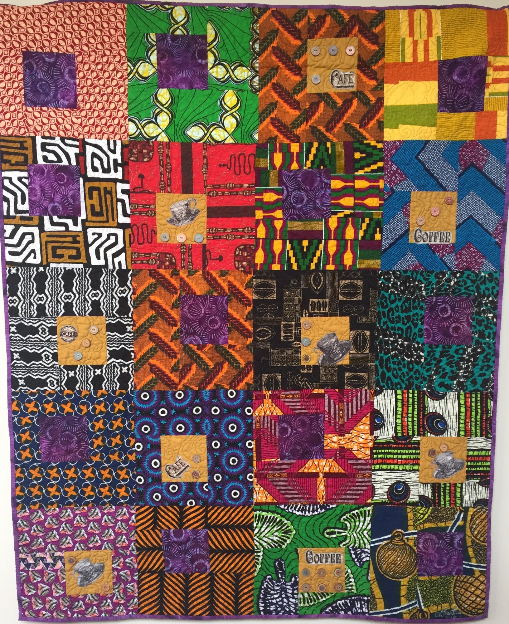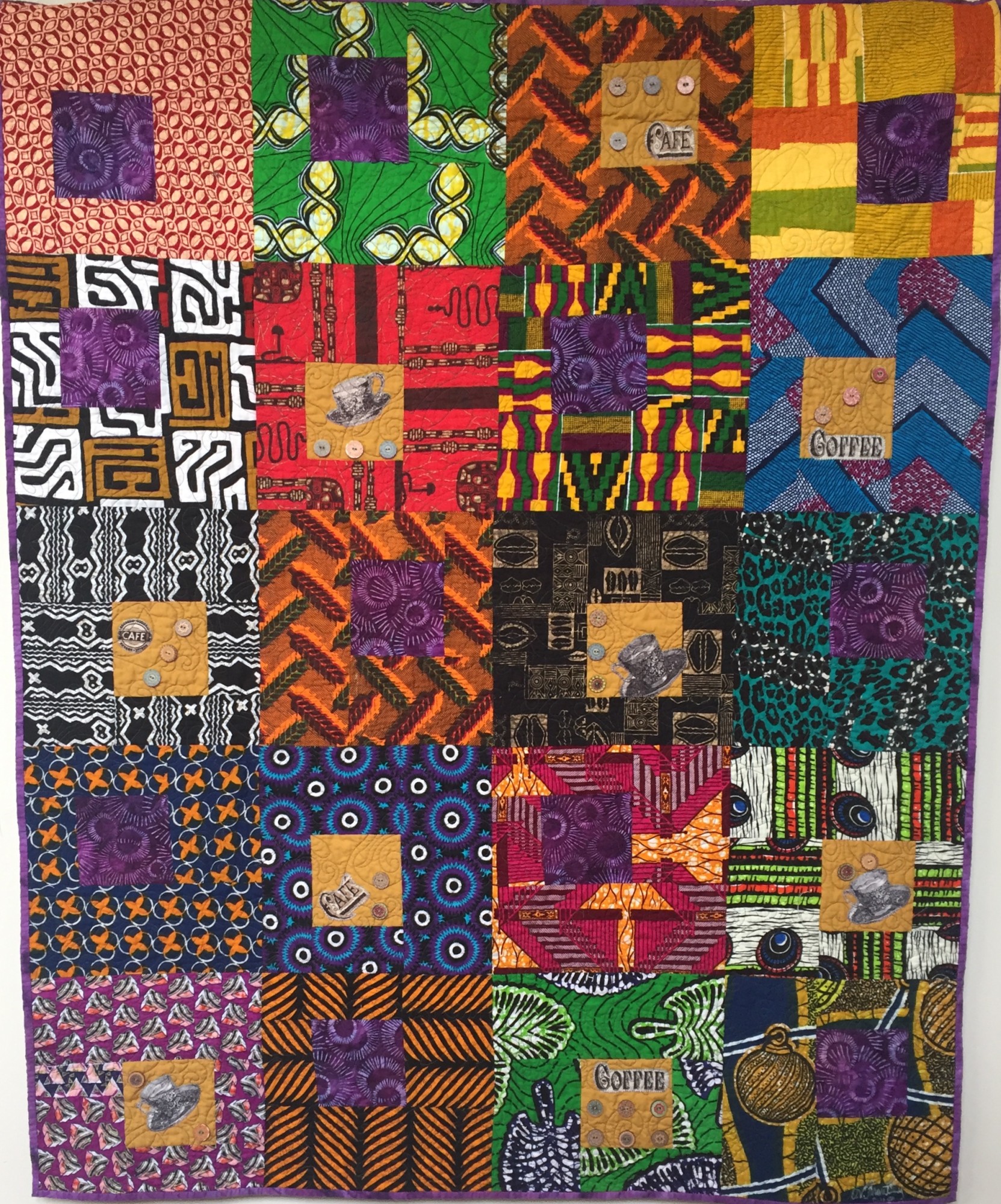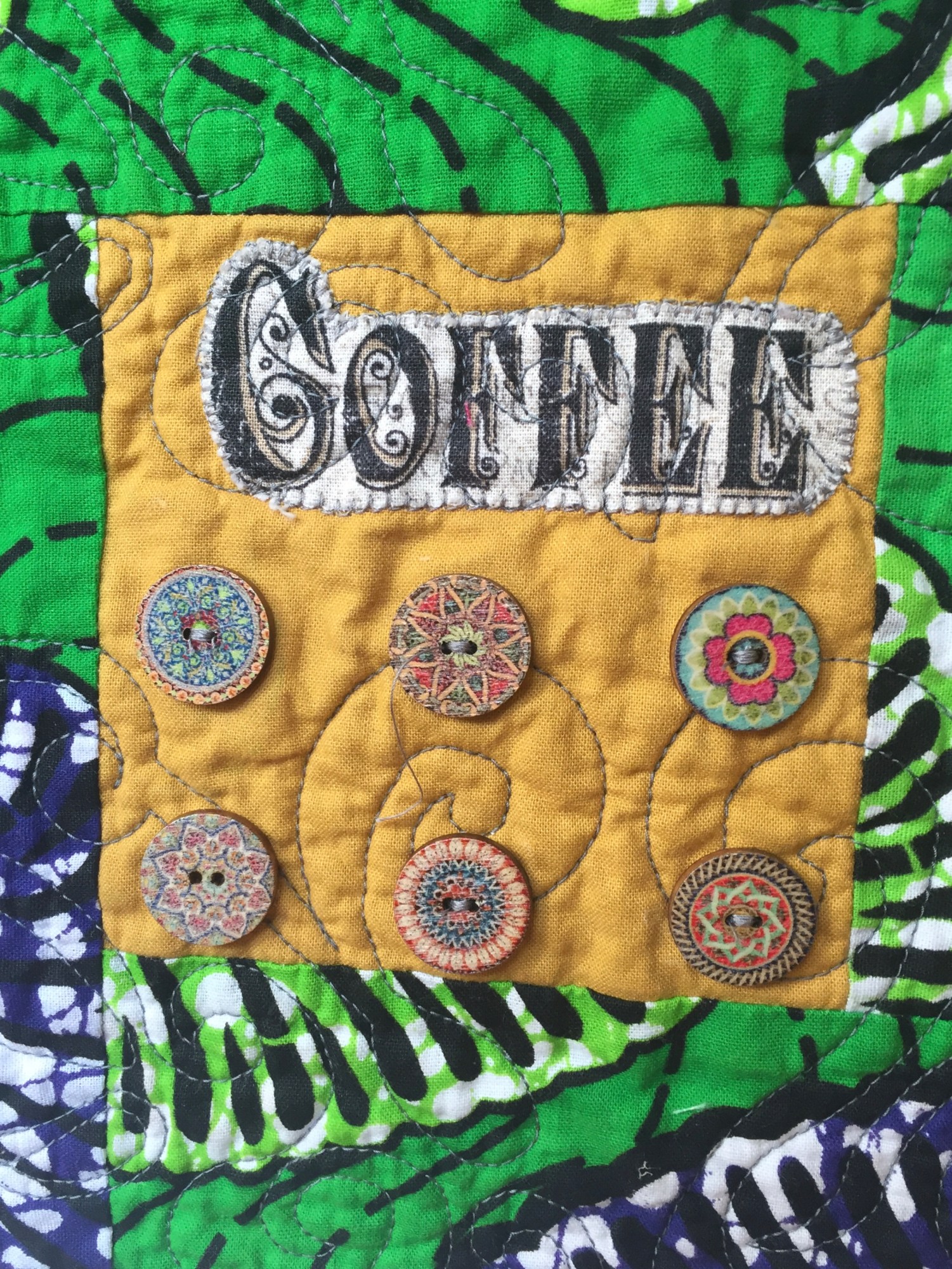 “Morning Coffee On My Patio” is a quilted wallhanging with a coffee theme. Coffee cups and words are appliquéd on the front of the quilt. The same coffee fabric is on the back of the quilt. However the vibrant African prints take center stage in the quilt, which measures 42 x 52 inches. Painted buttons add texture to the quilt.
